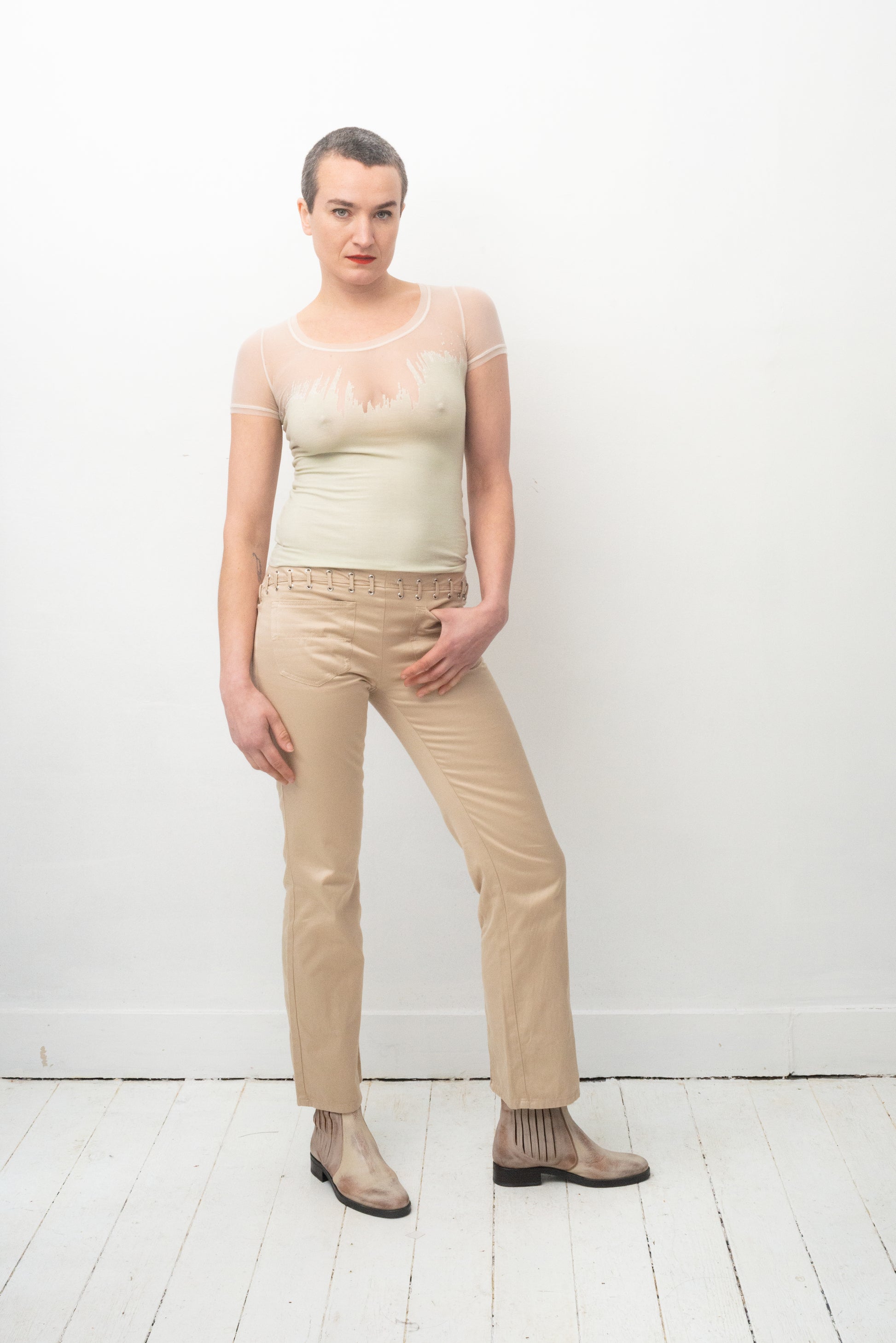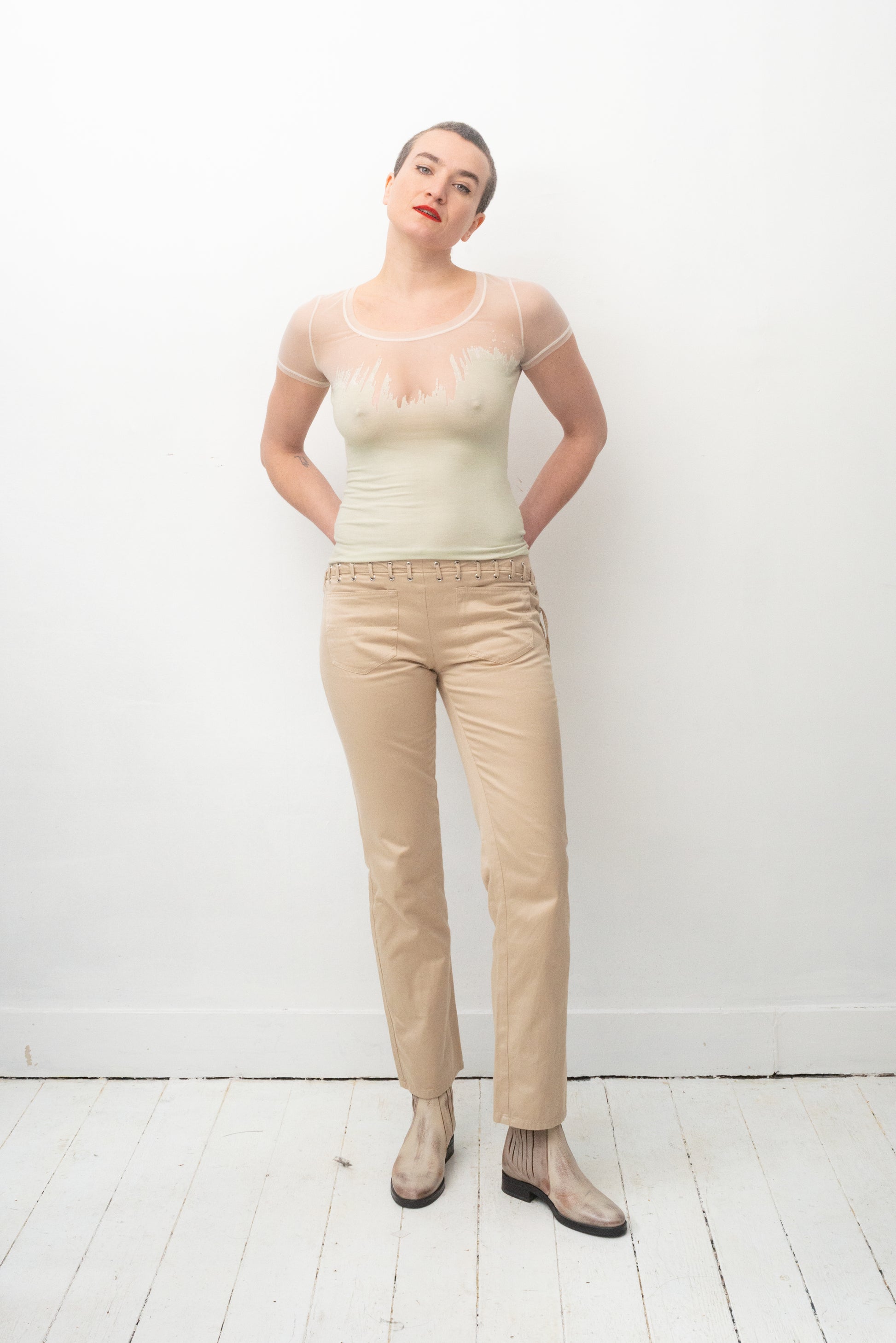 Great pair of Gianfranco Ferre 90's low waisted beige cotton trousers with a lace detail following the waist line and continuing across the back side of the left leg until the bottom of the trousers.
