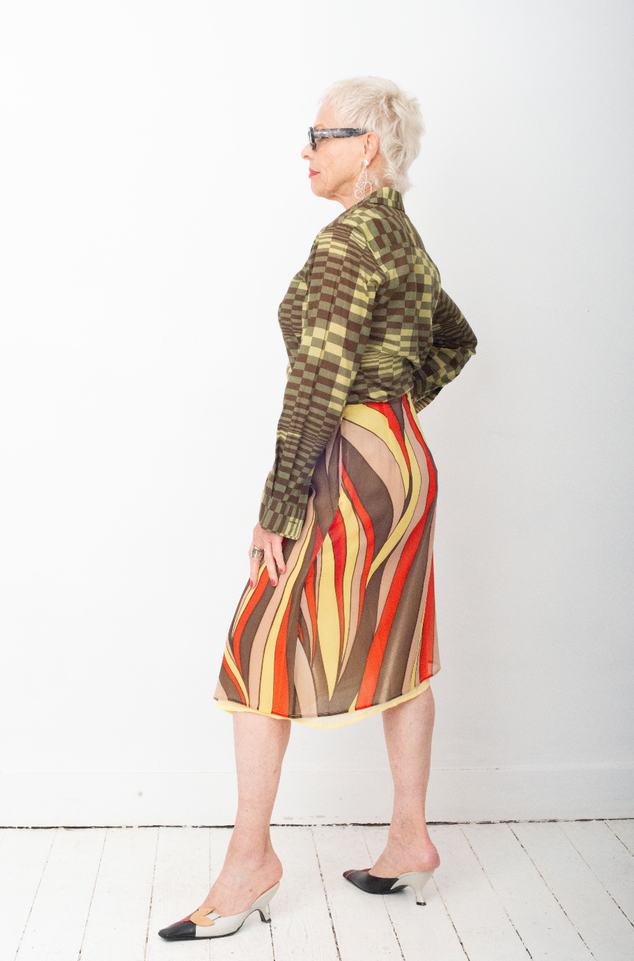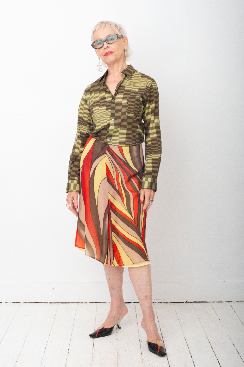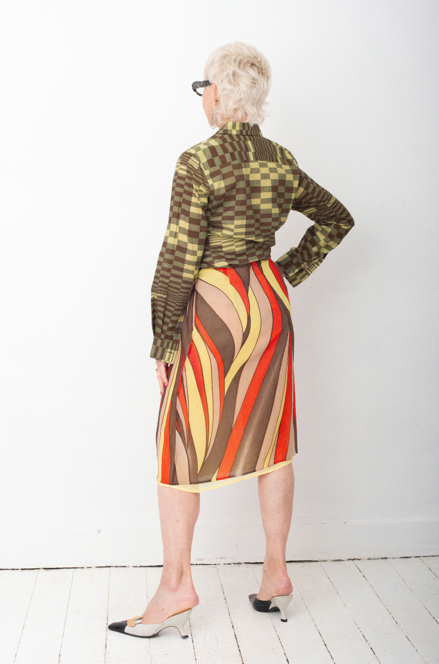 This skirt from the celebrated FW 2000 collection features a beautiful orange, green and brown swirl pattern and was featured on the campaign shot by Steven Meisel.