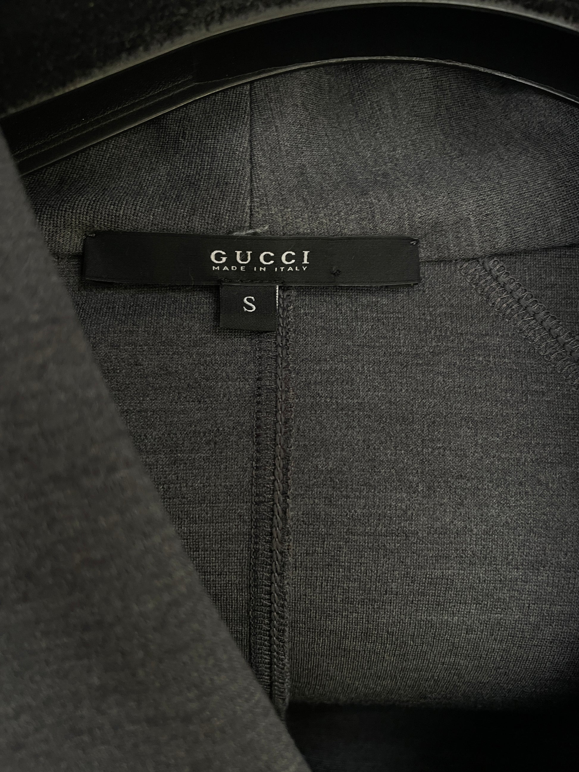 Gucci 2009 stretchy grey jersey wool dress with black ribbed sleeves.
