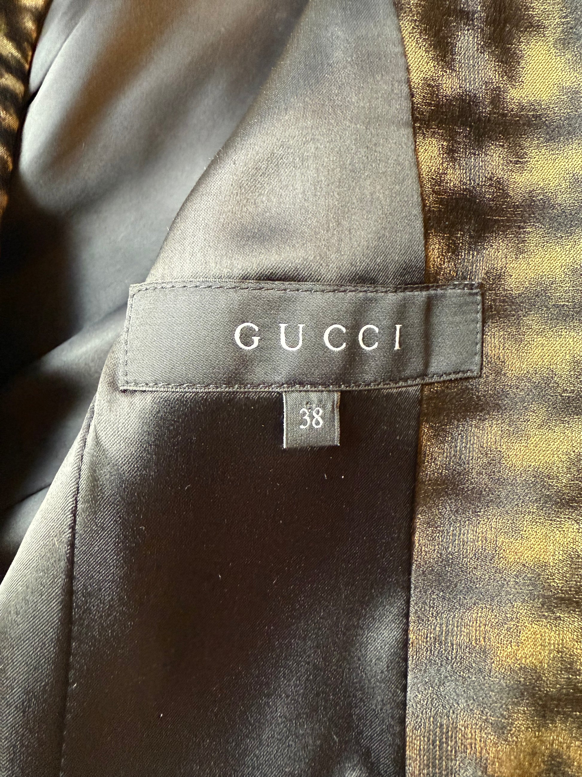 It is fitted at the waist and finished with a peplum shaped bottom. The cuffs of the sleeves feature a row of 4 small Gucci engraved buttons.