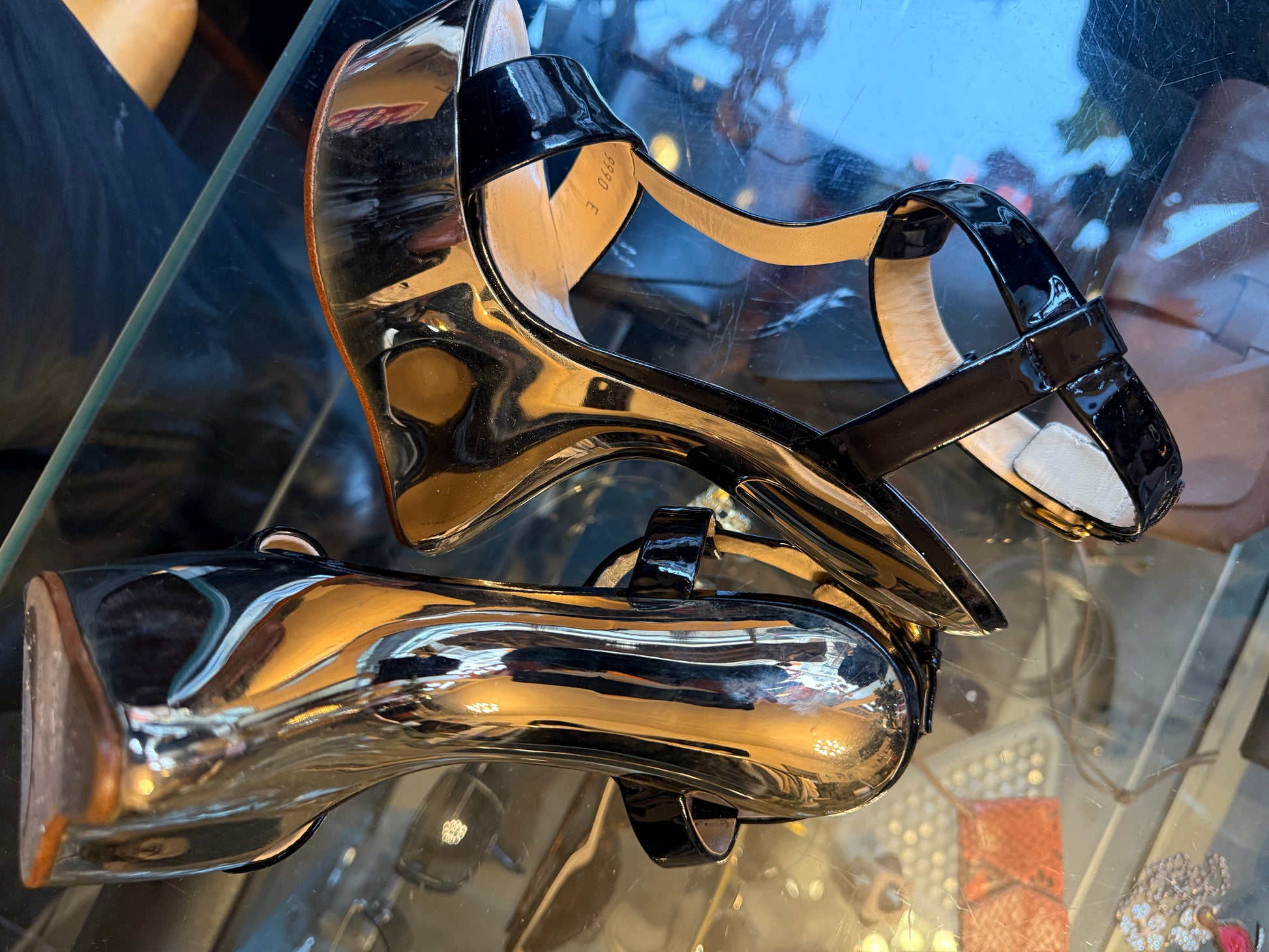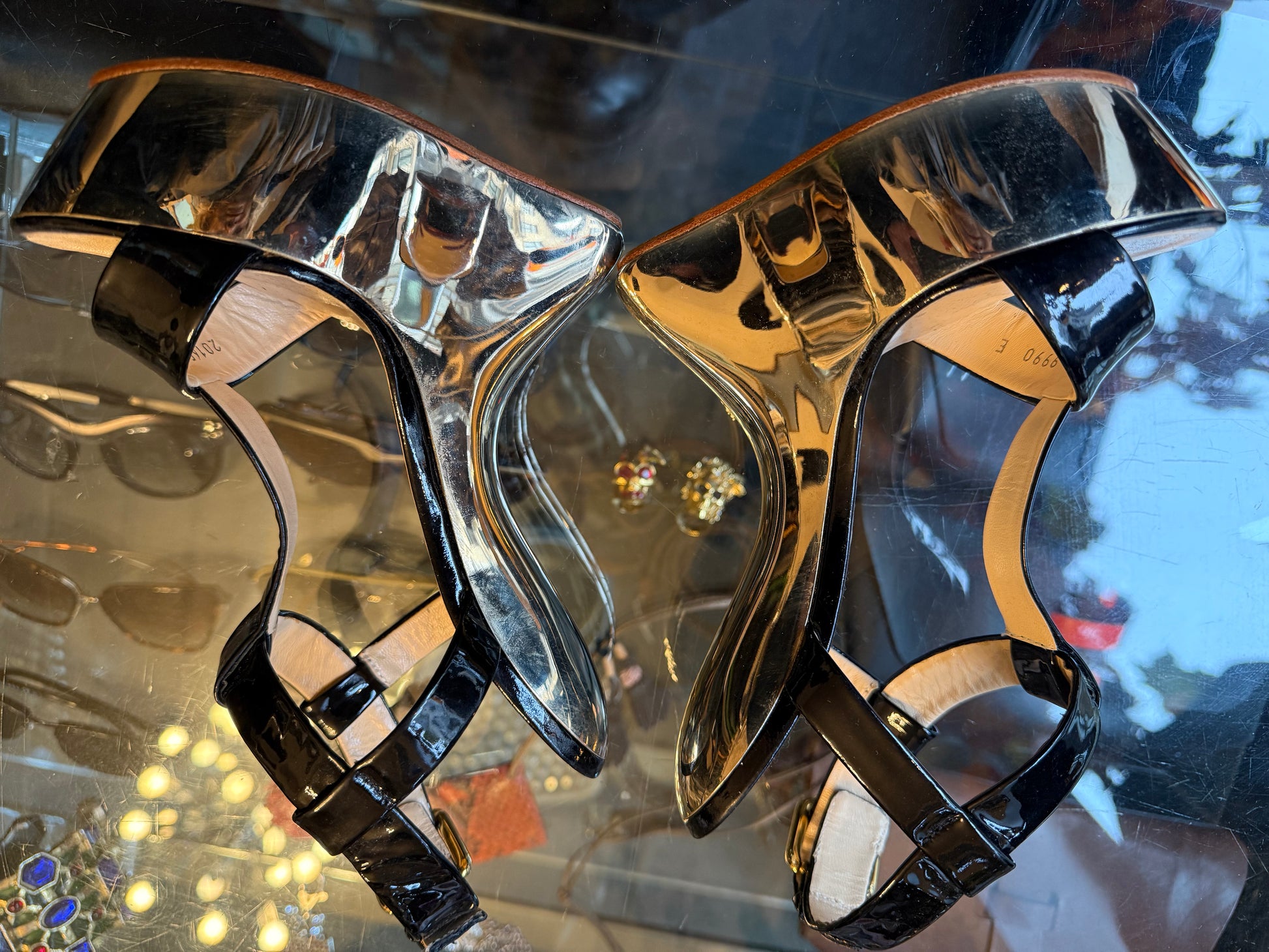 Sculptural Guiseppe Zanotti “floating” golden mirror wedge heels with patent leather straps