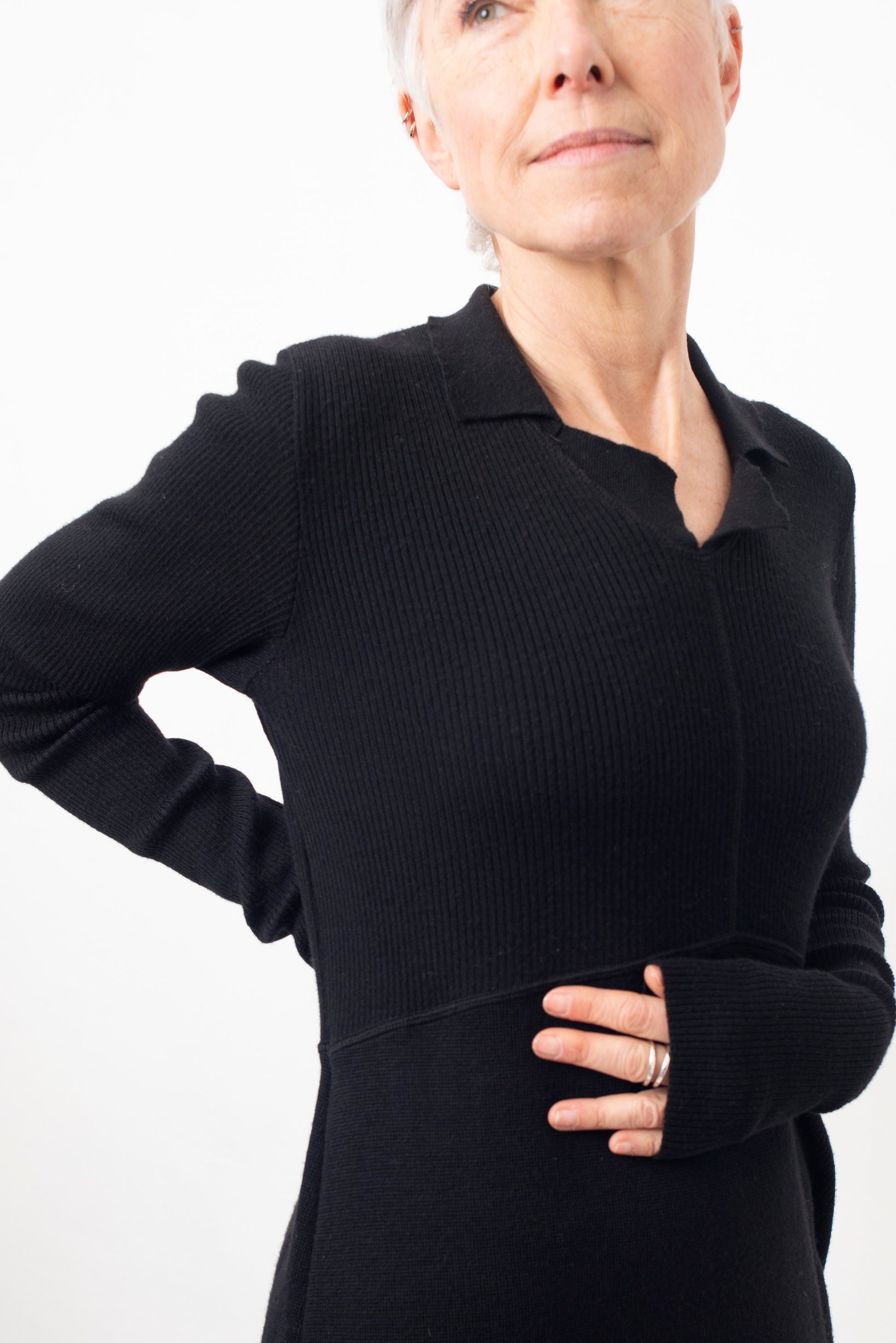 Ribbed wool knit maxi dress by Belgian designer Helena van Haeren with extra long sleeves and a large pocket on the left side, giving an interesting asymmetric shape to the dress.