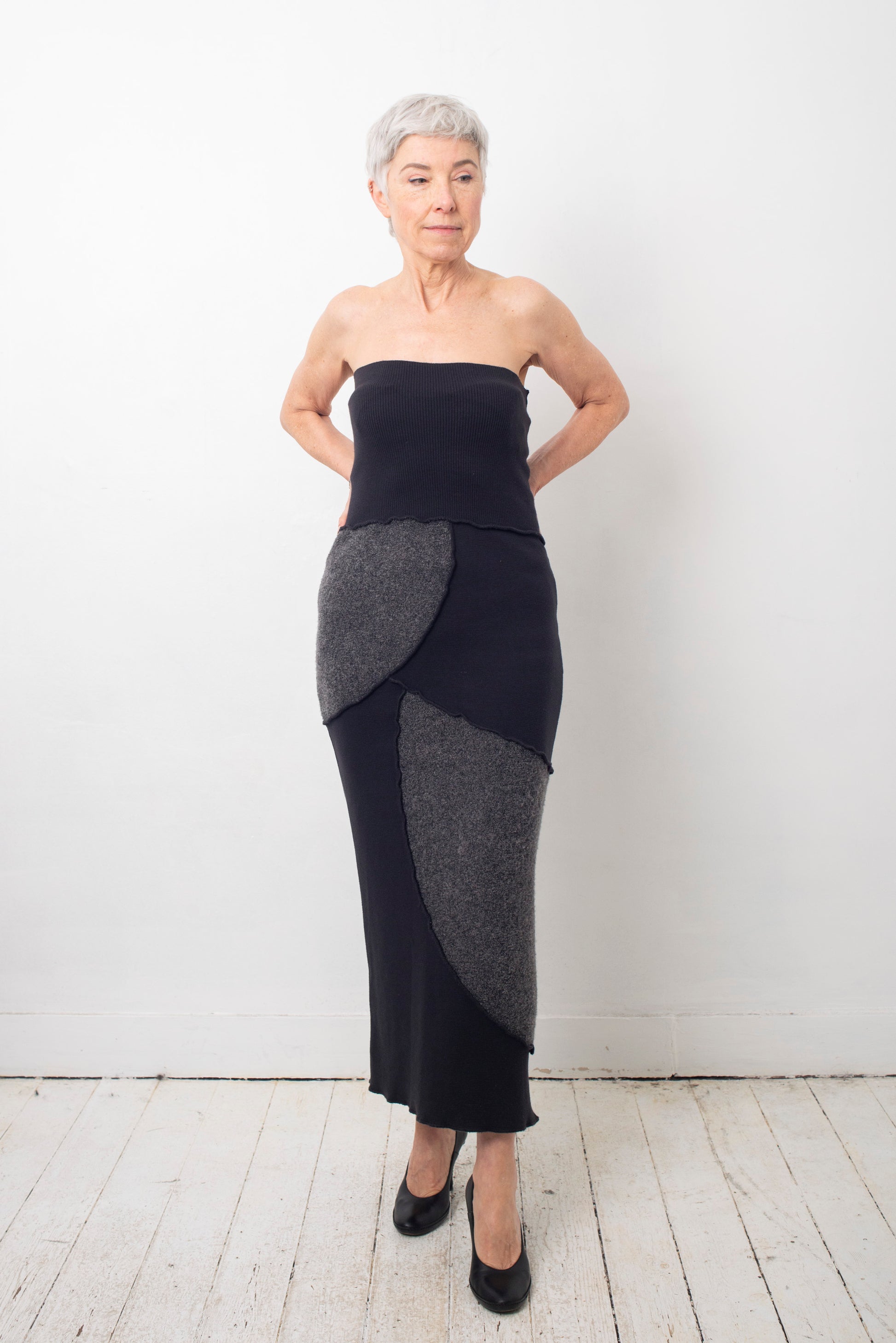 The piece is made from a black ribbed cotton and a grey wool geometric figure patches, its stretchy nature give it a beautiful figure hugging shape.