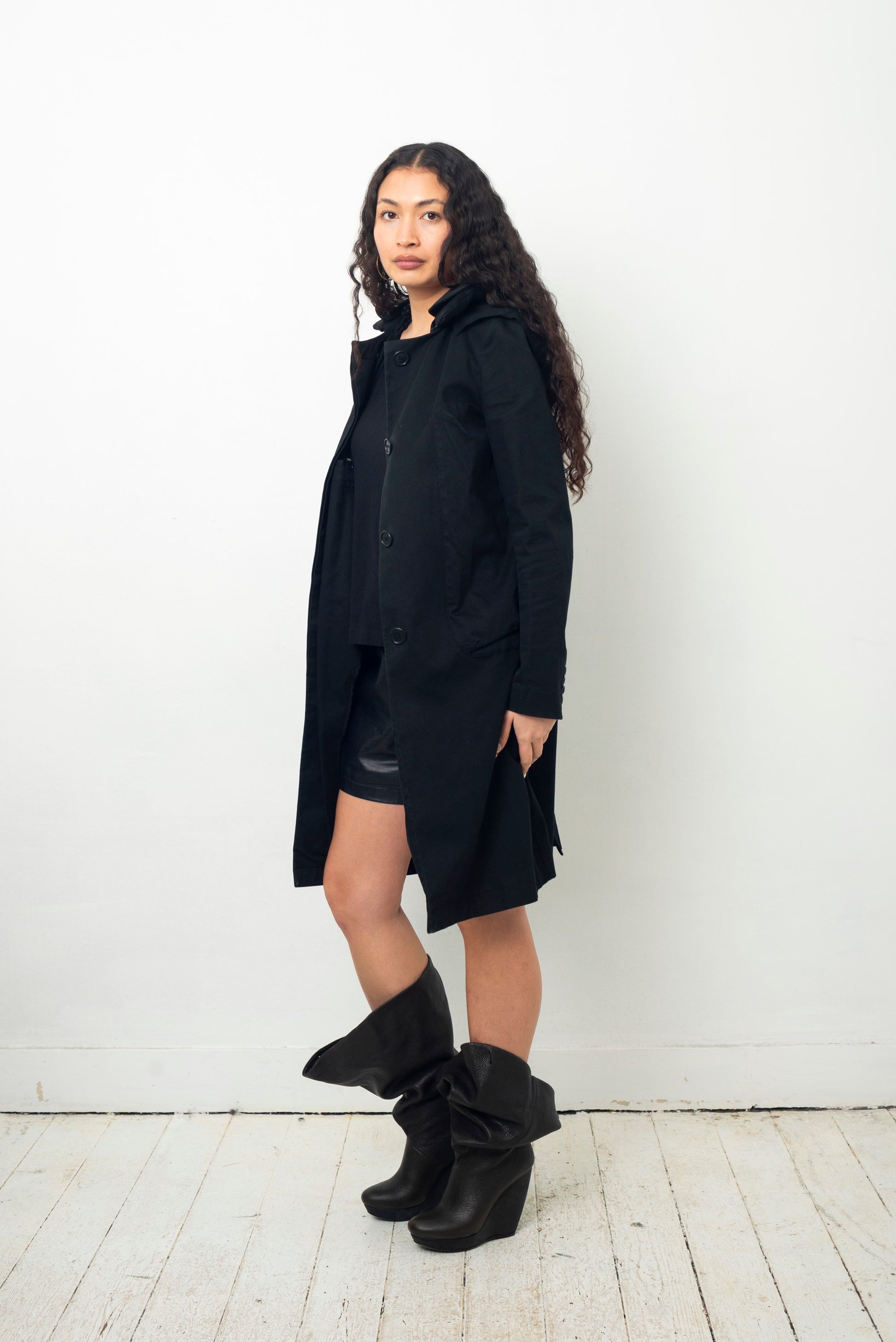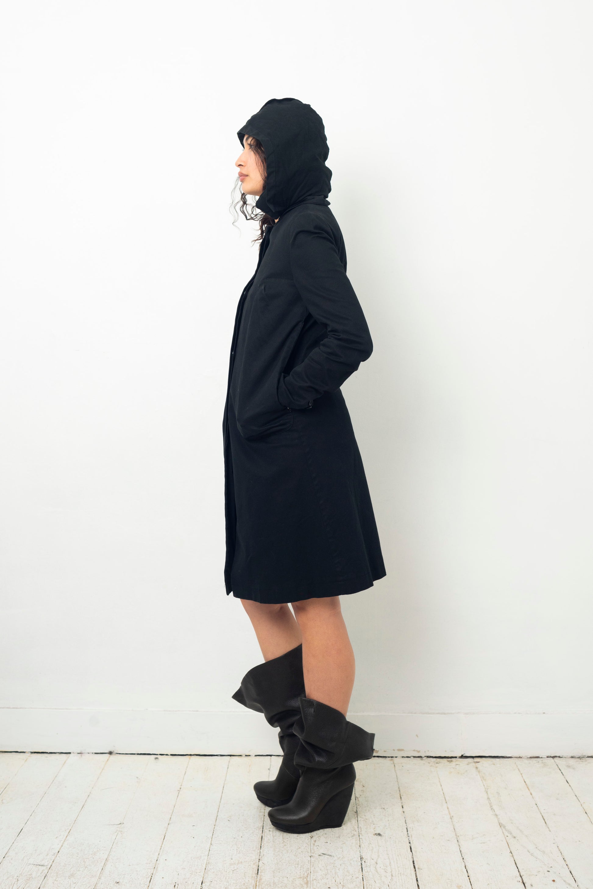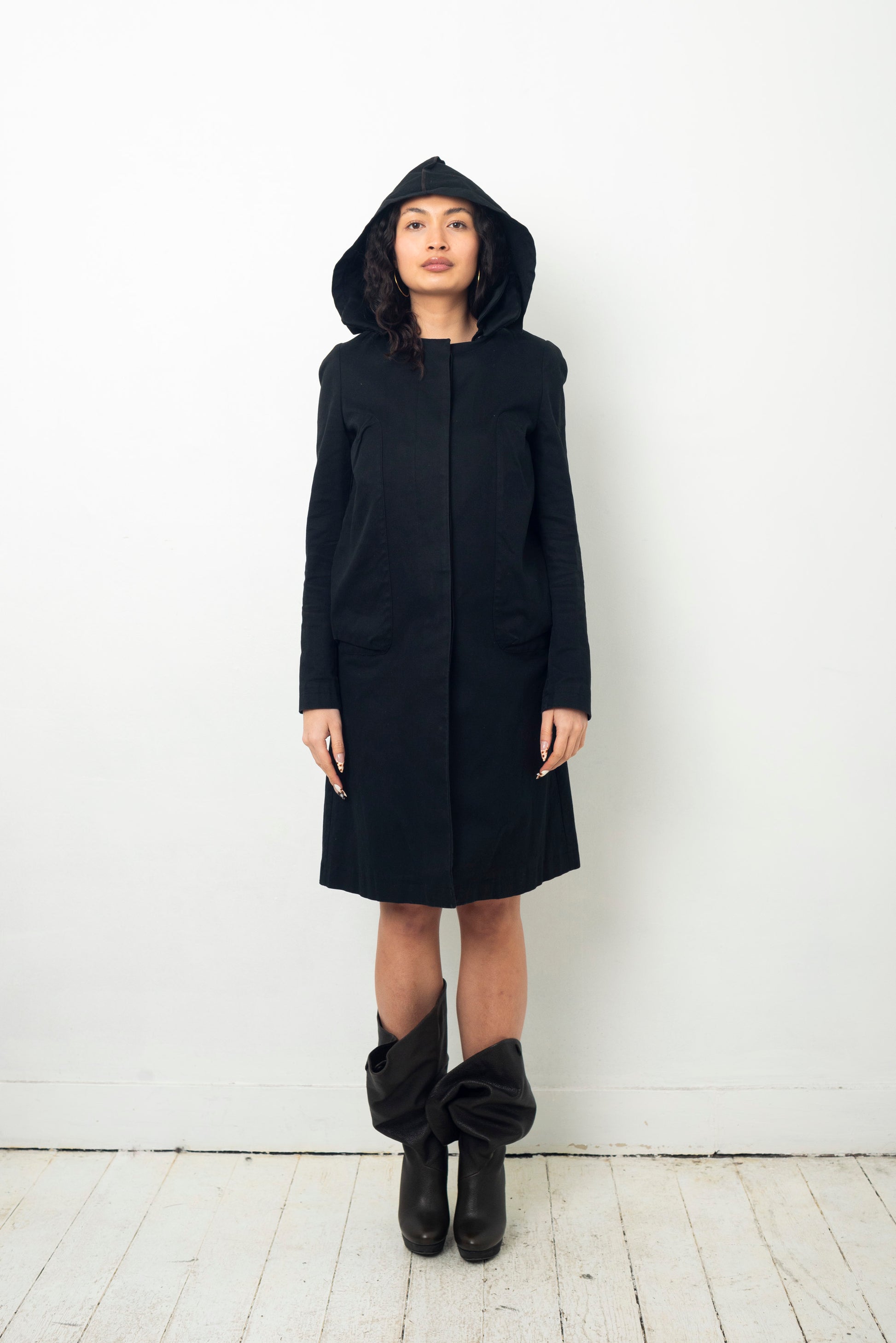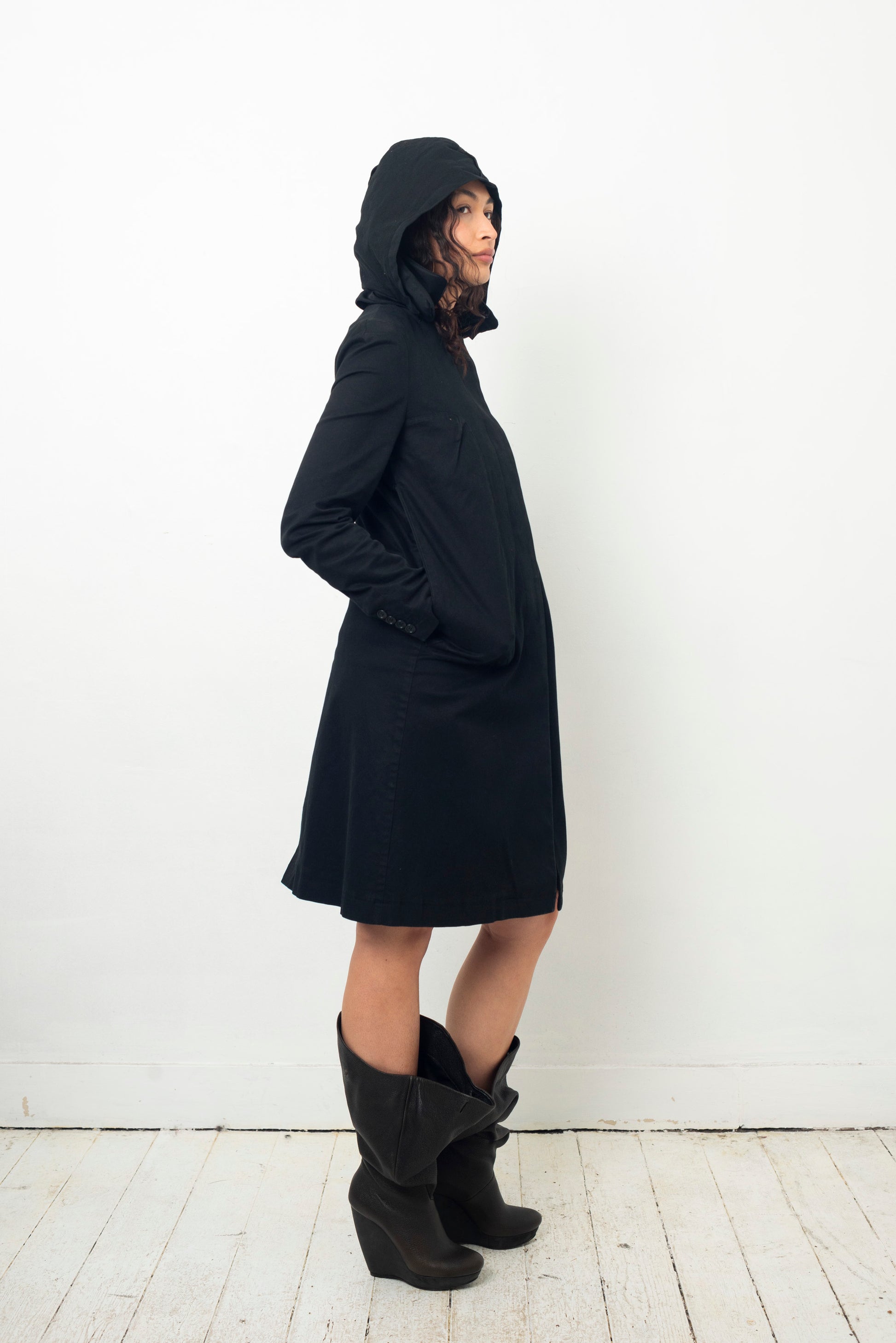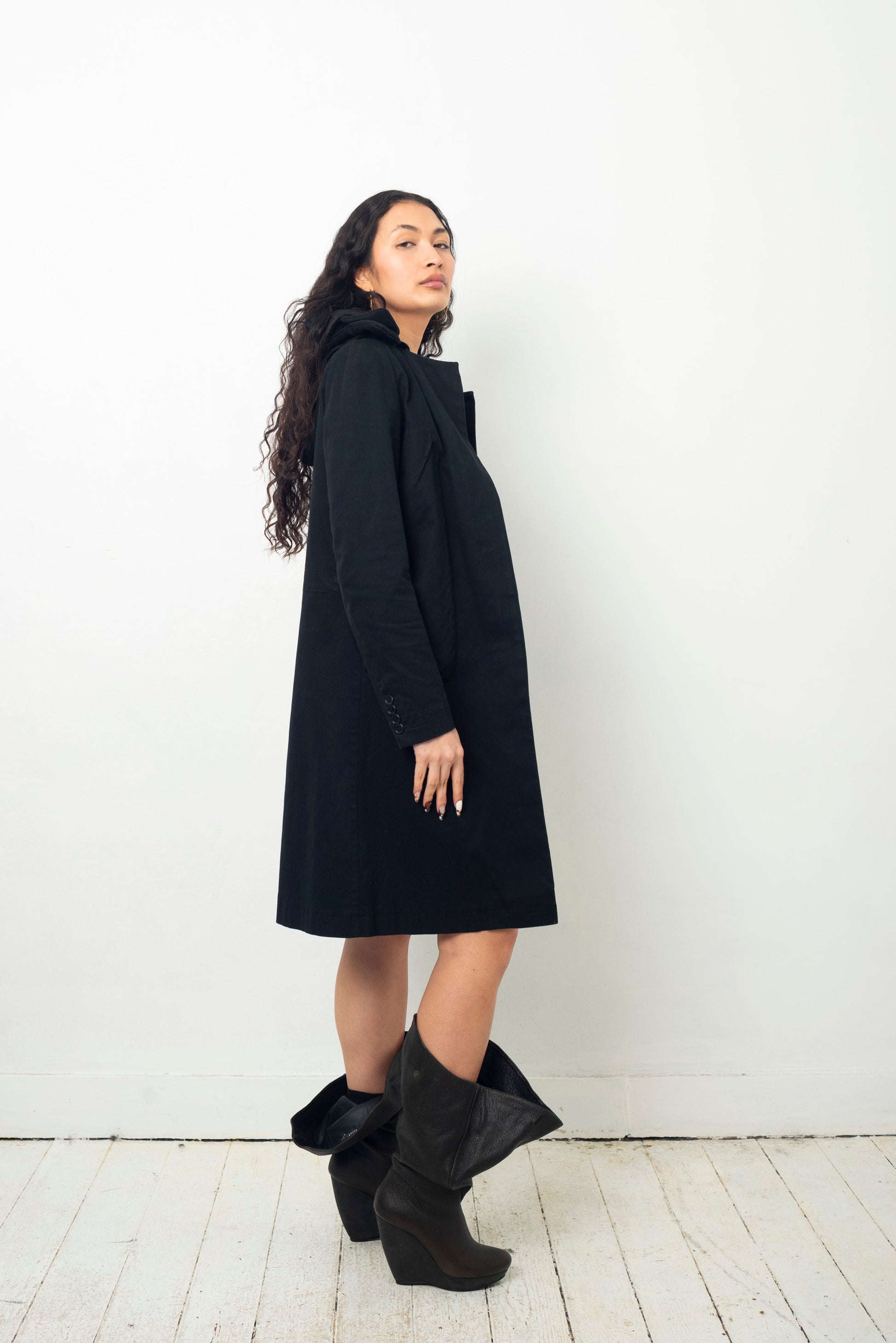 This version from SS 2000, is made from a thick, soft cotton, comes with extra large side pockets and a removable silk double collar holding a hood.