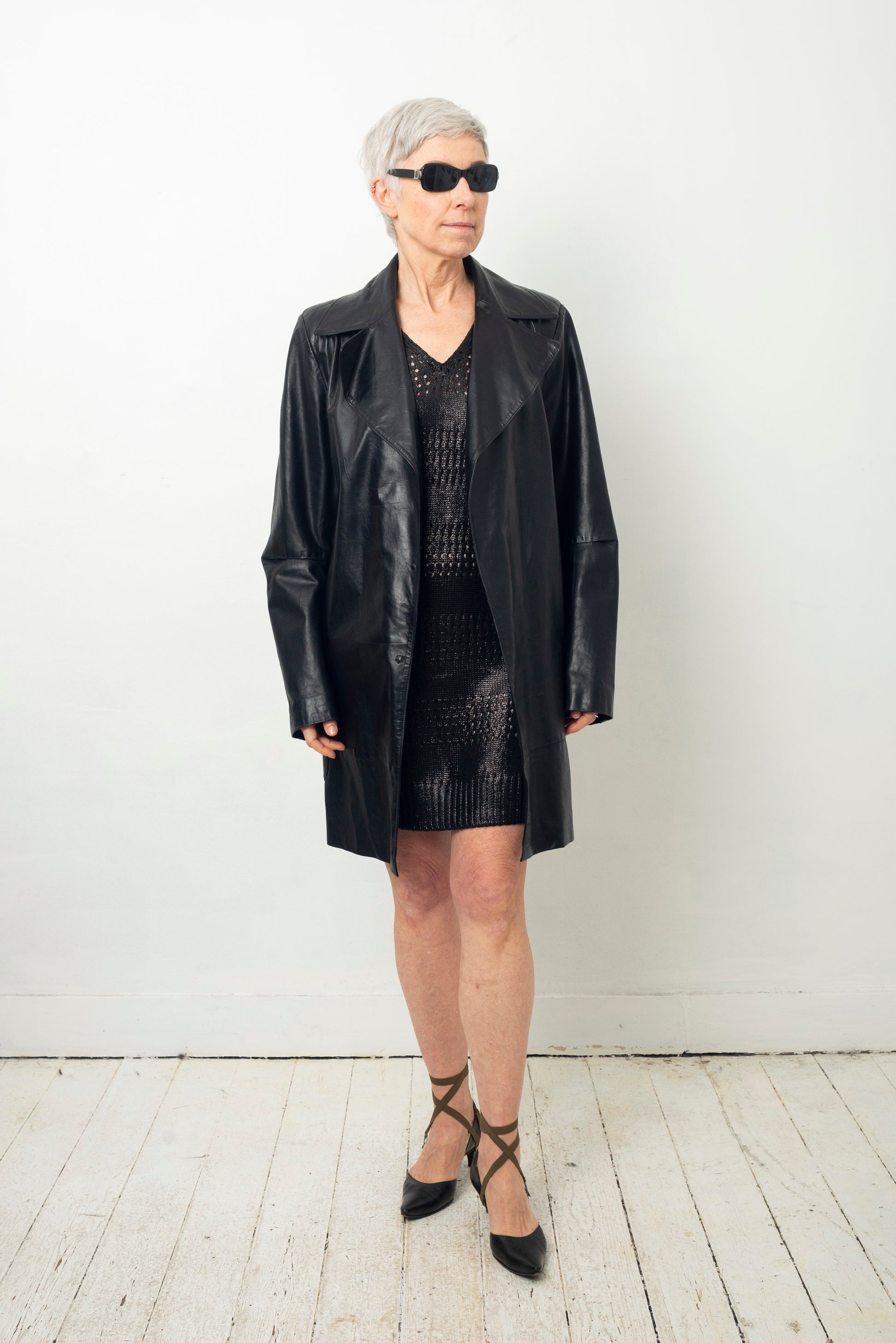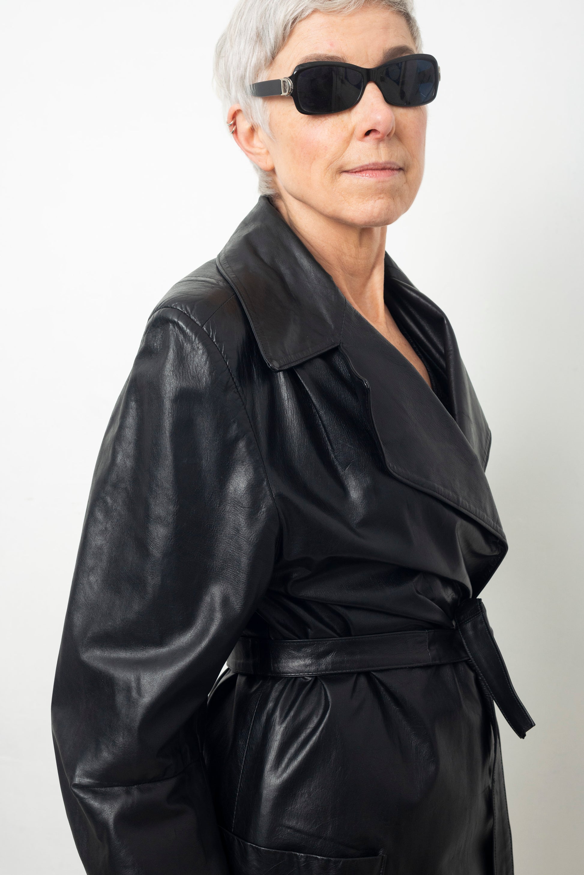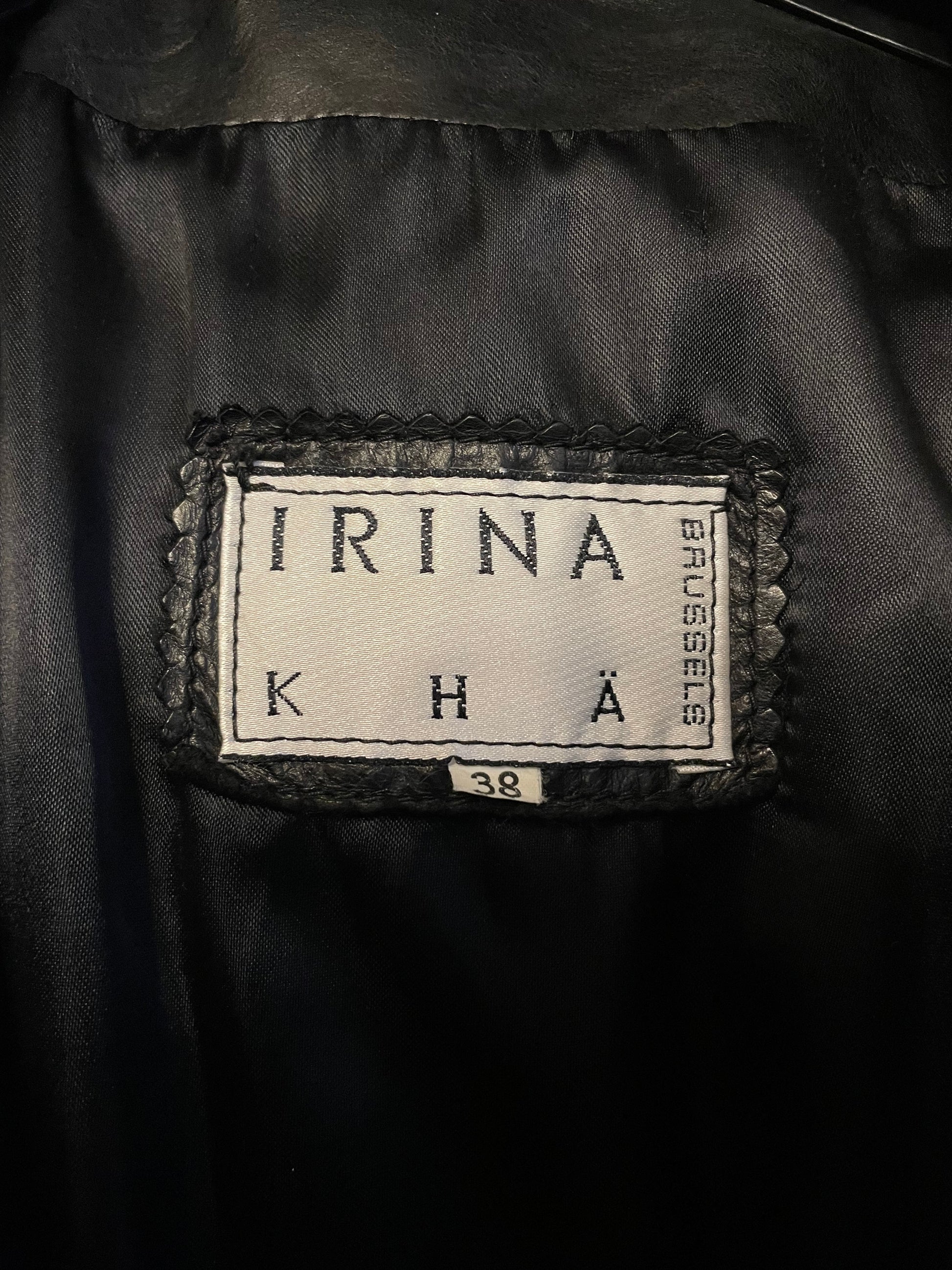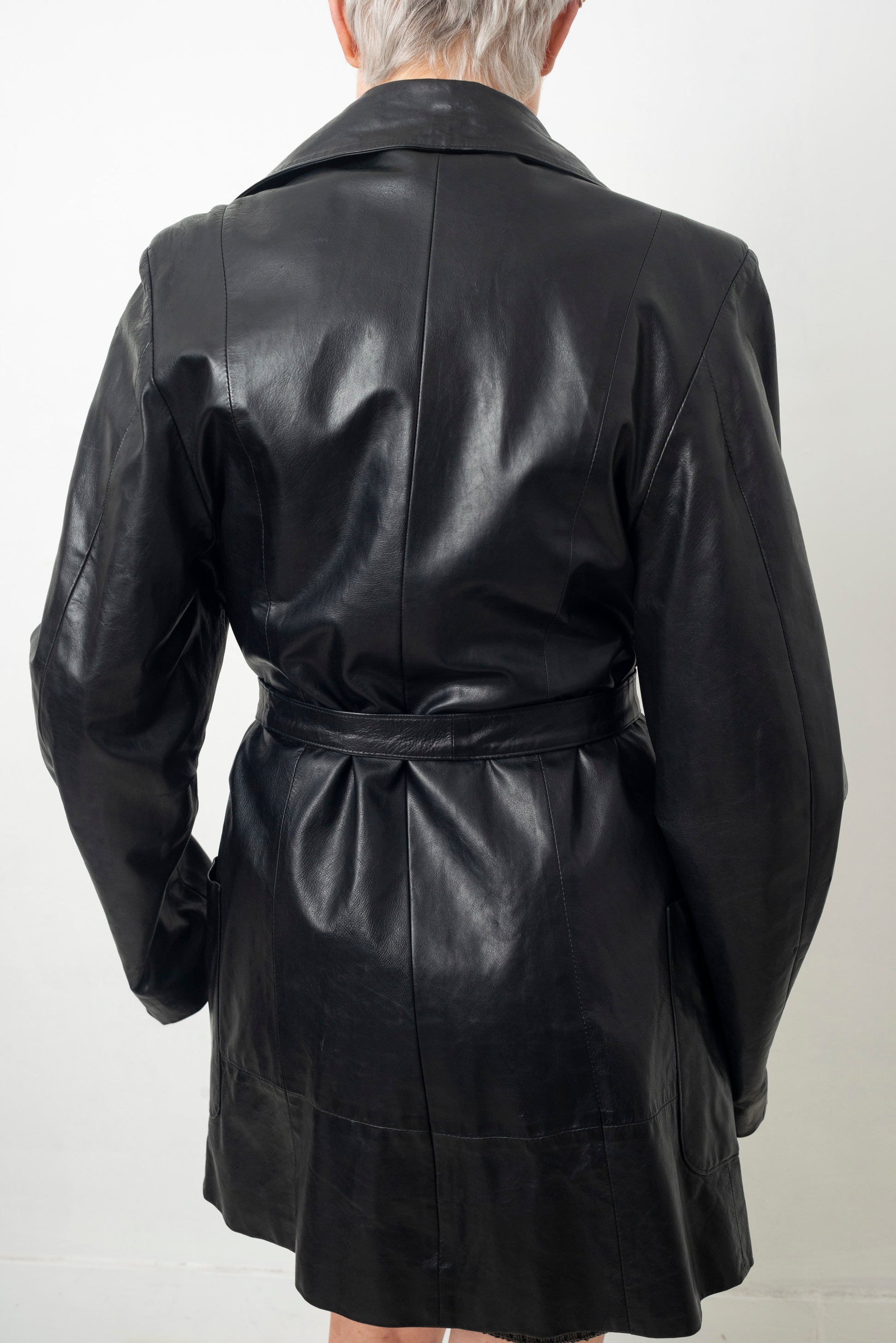 Classic 90's mid-length leather jacket from Belgian designer Irina Kha with two large front pockets and a leather belt closure.