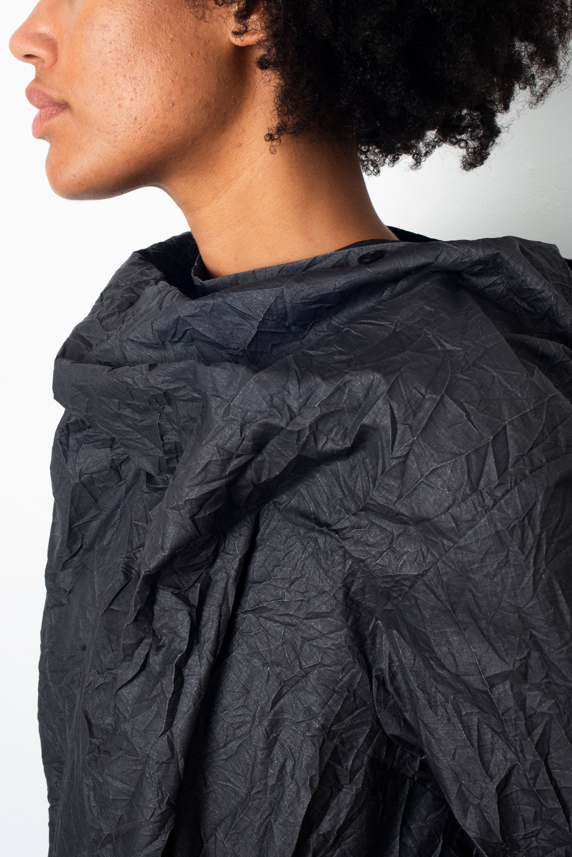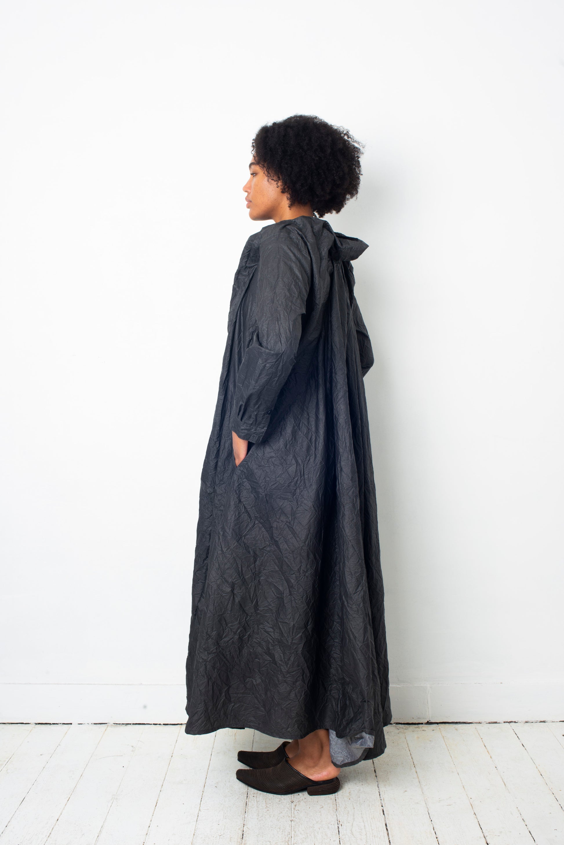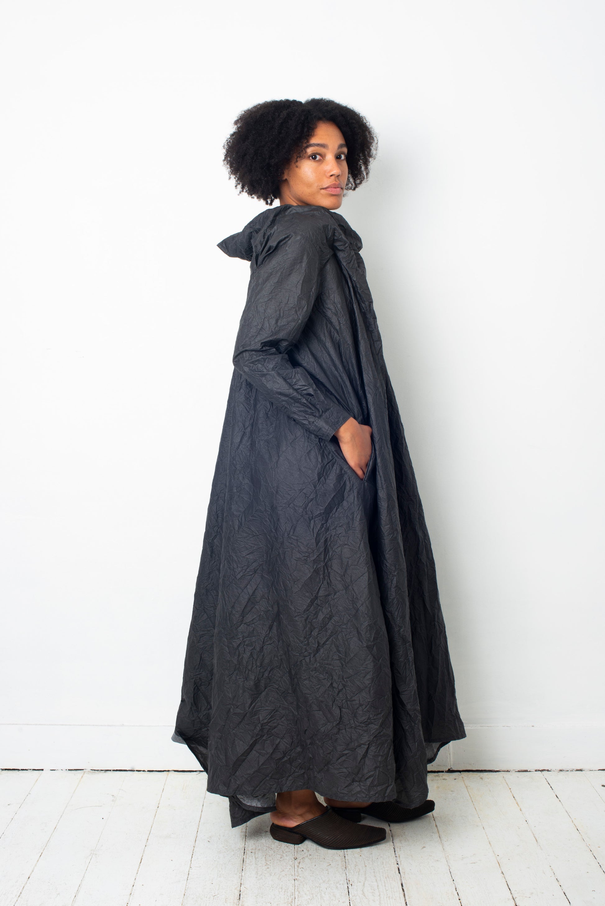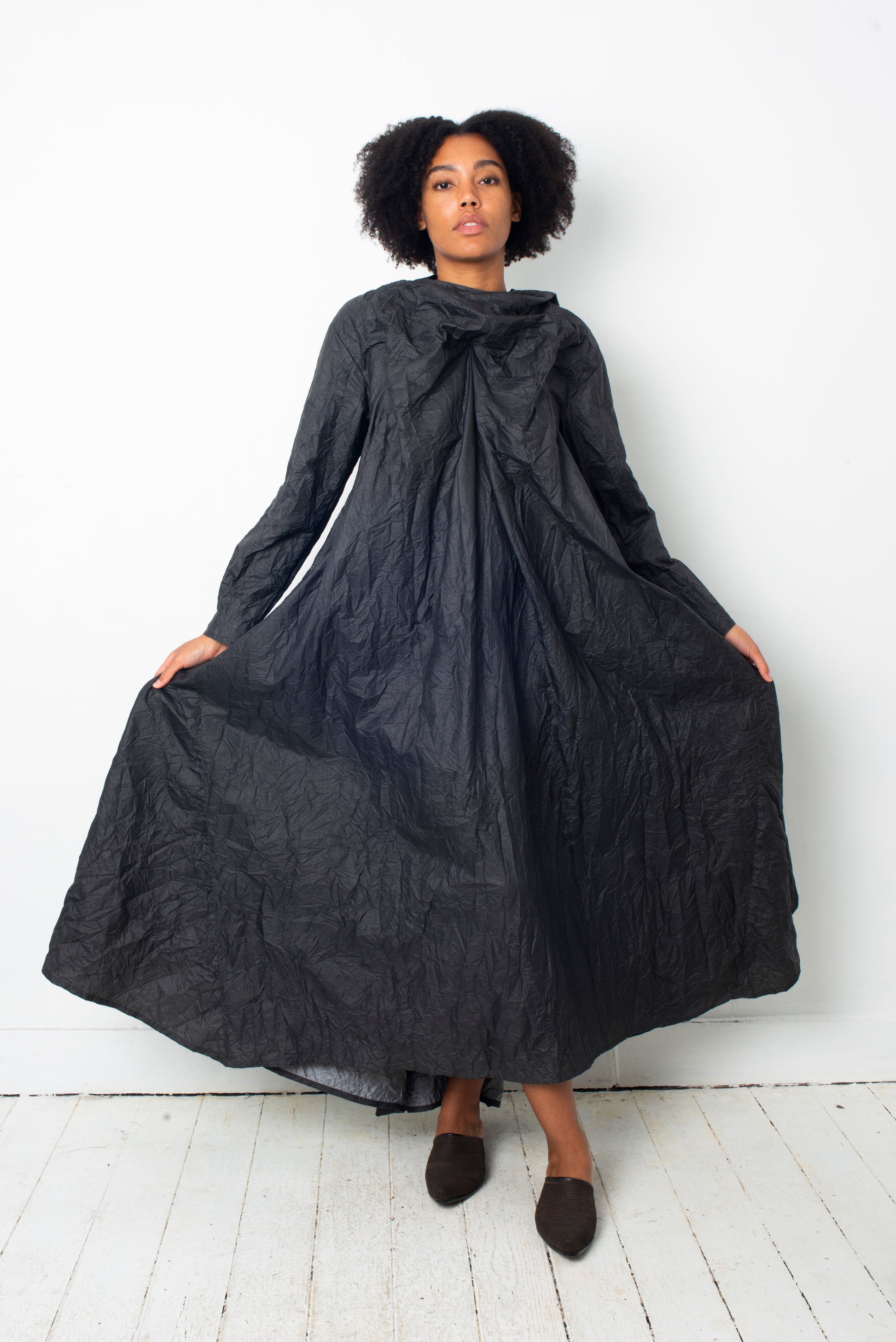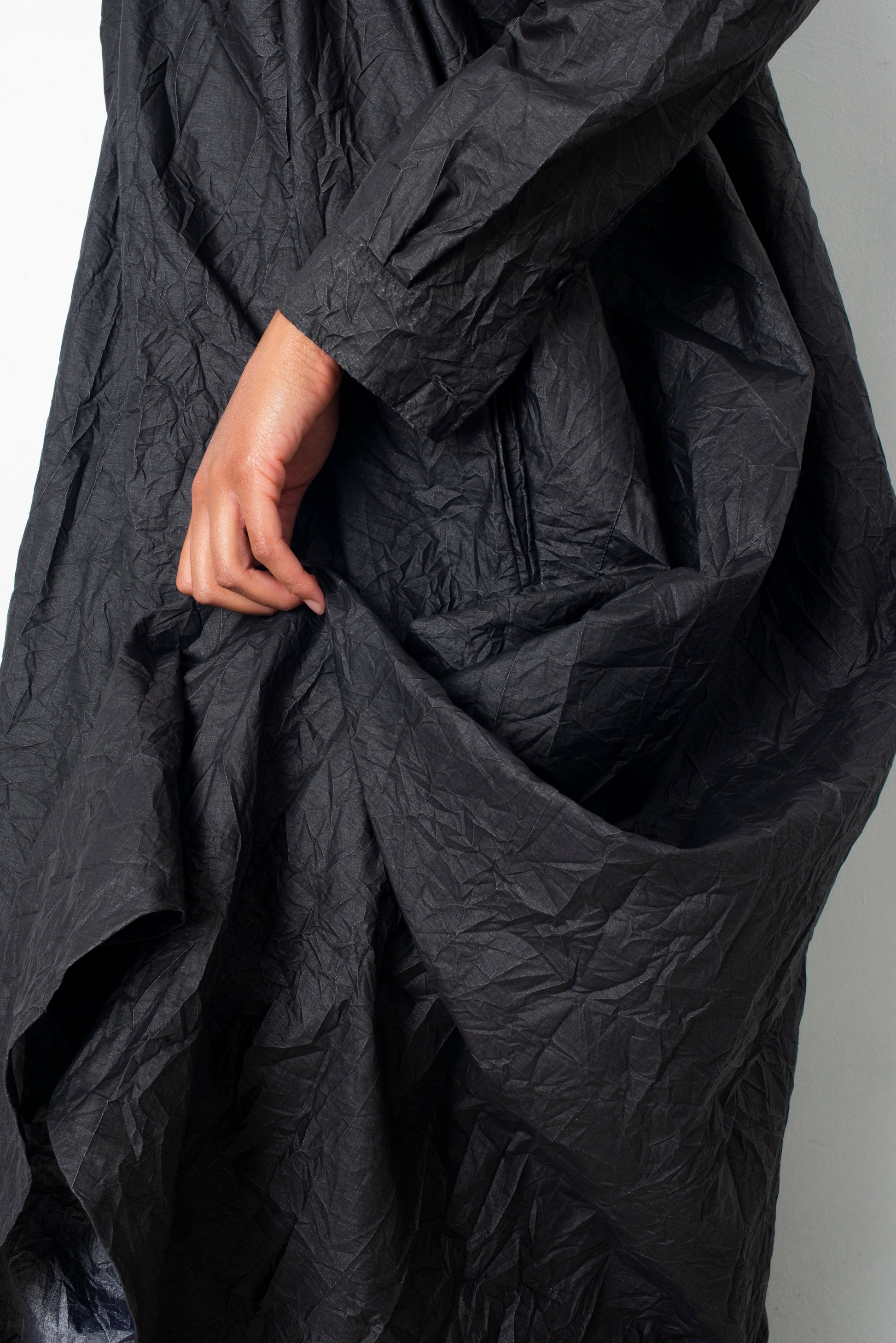 The dress is made of a paper-like wrinkled fabric, with the outside being of a dark grey color while inside is silver.
