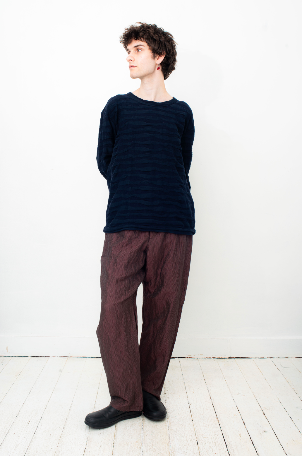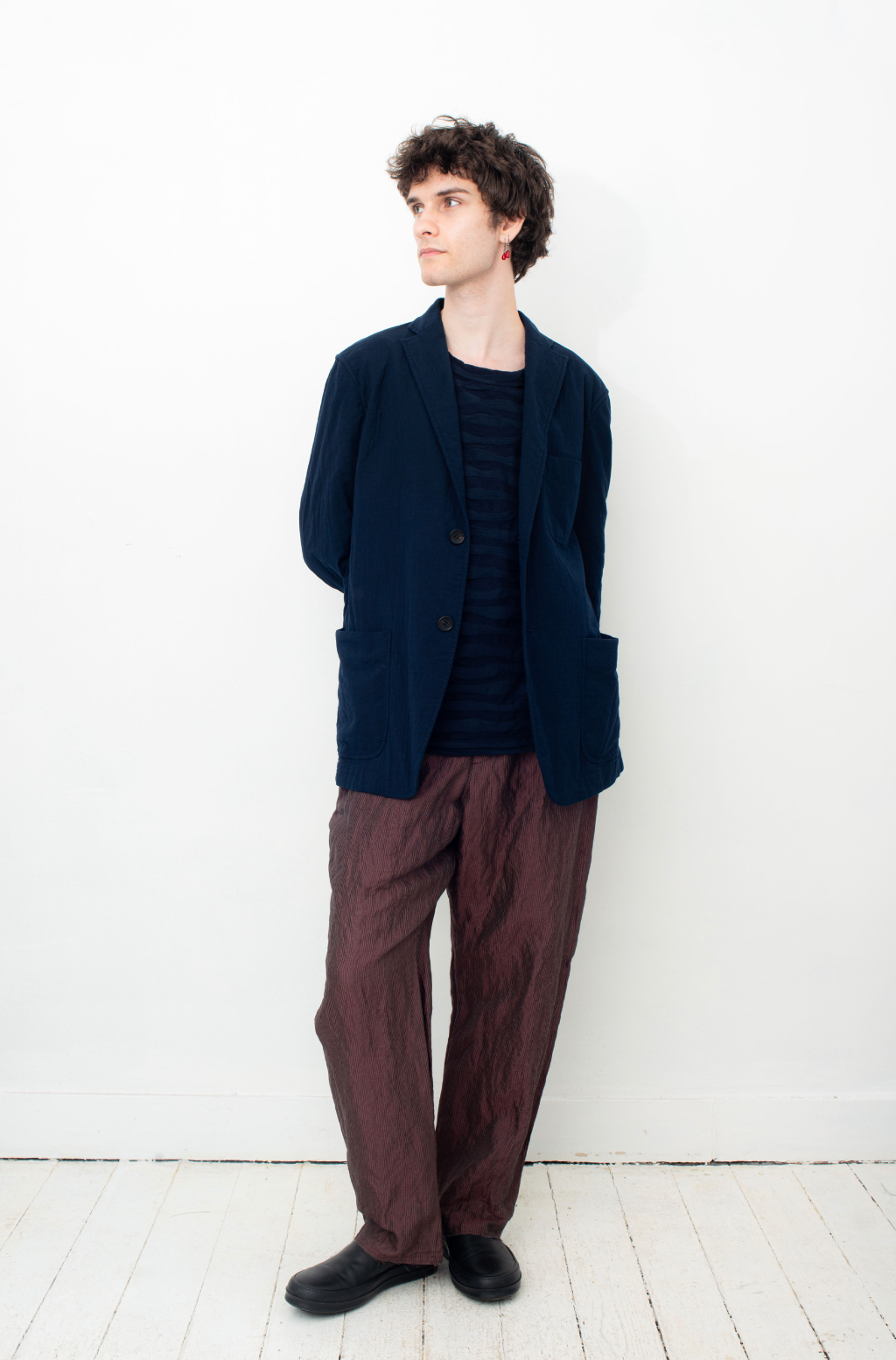 Here worn with Devoa trousers and Issey Miyake blue cotton jacket, both available online
