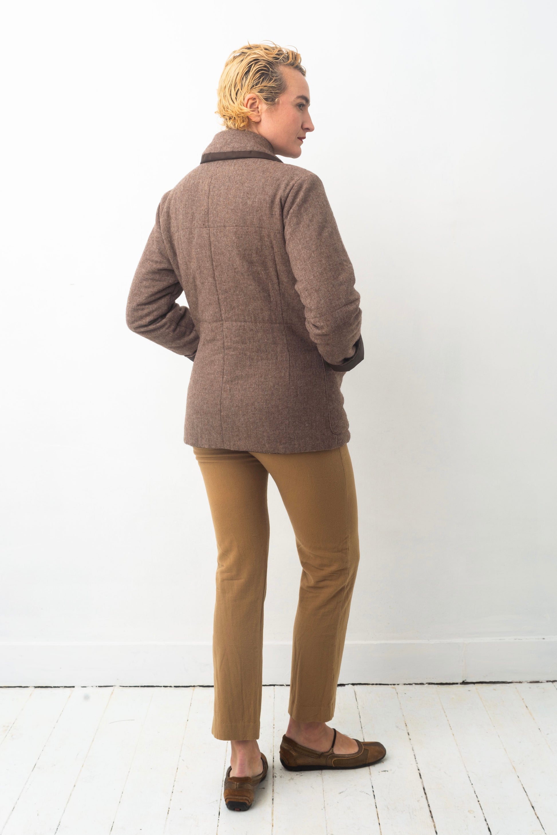 On a day like today, while I’m writing this short item description, where clouds are gathering and rain seems imminent, I image being out on the streets, wearing this jacket, woollen side out, until I feel the first drops of rain falling down from the sky.