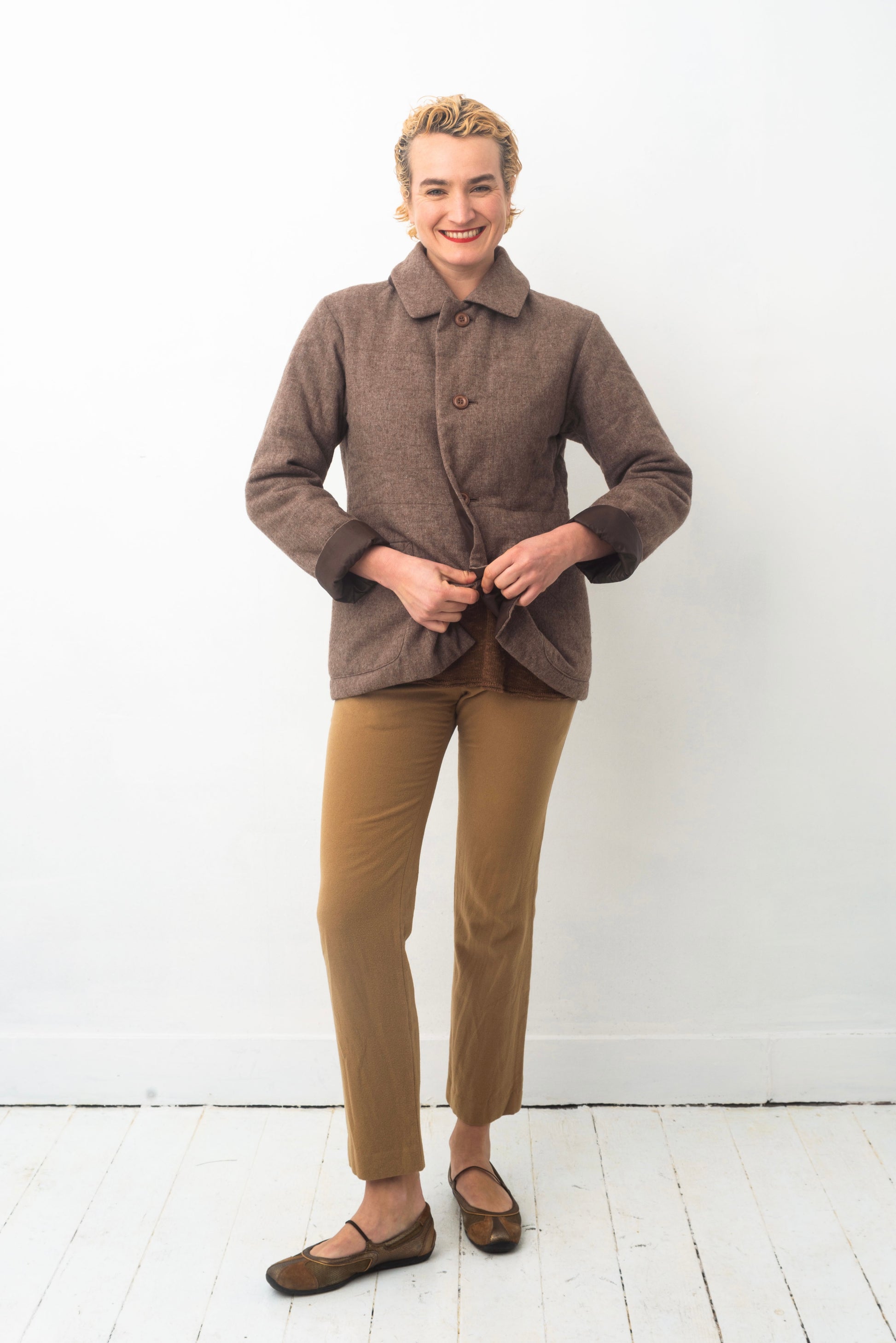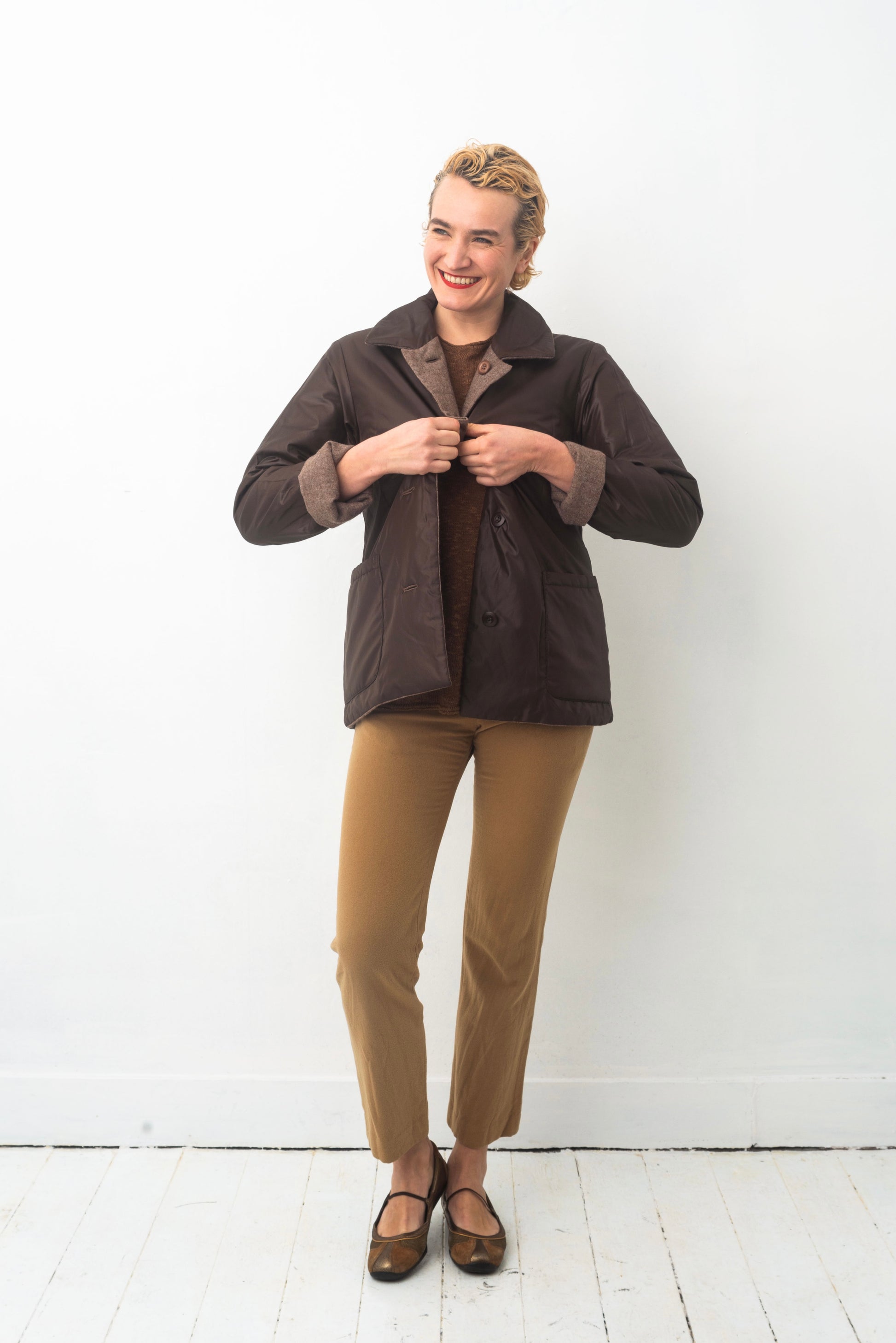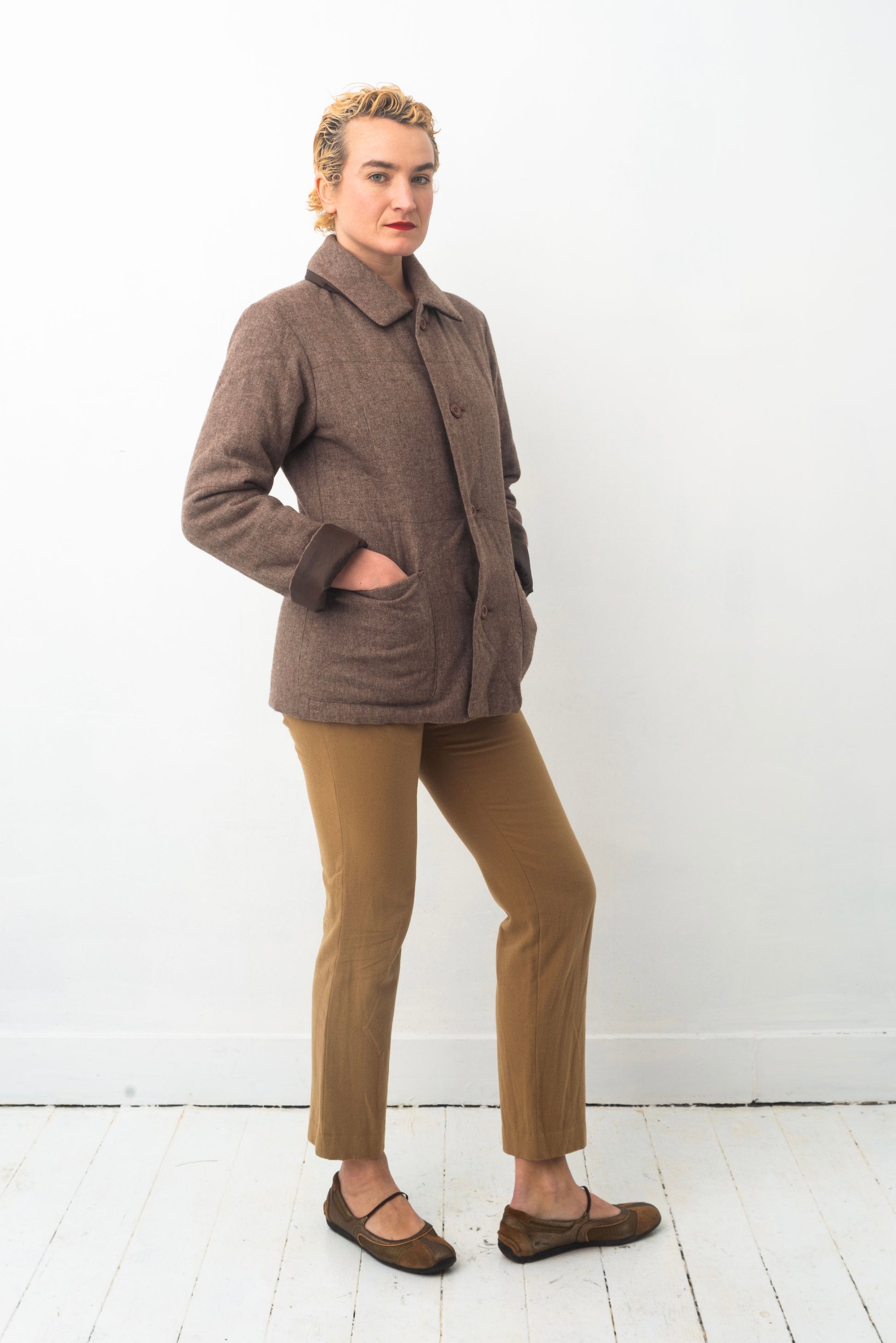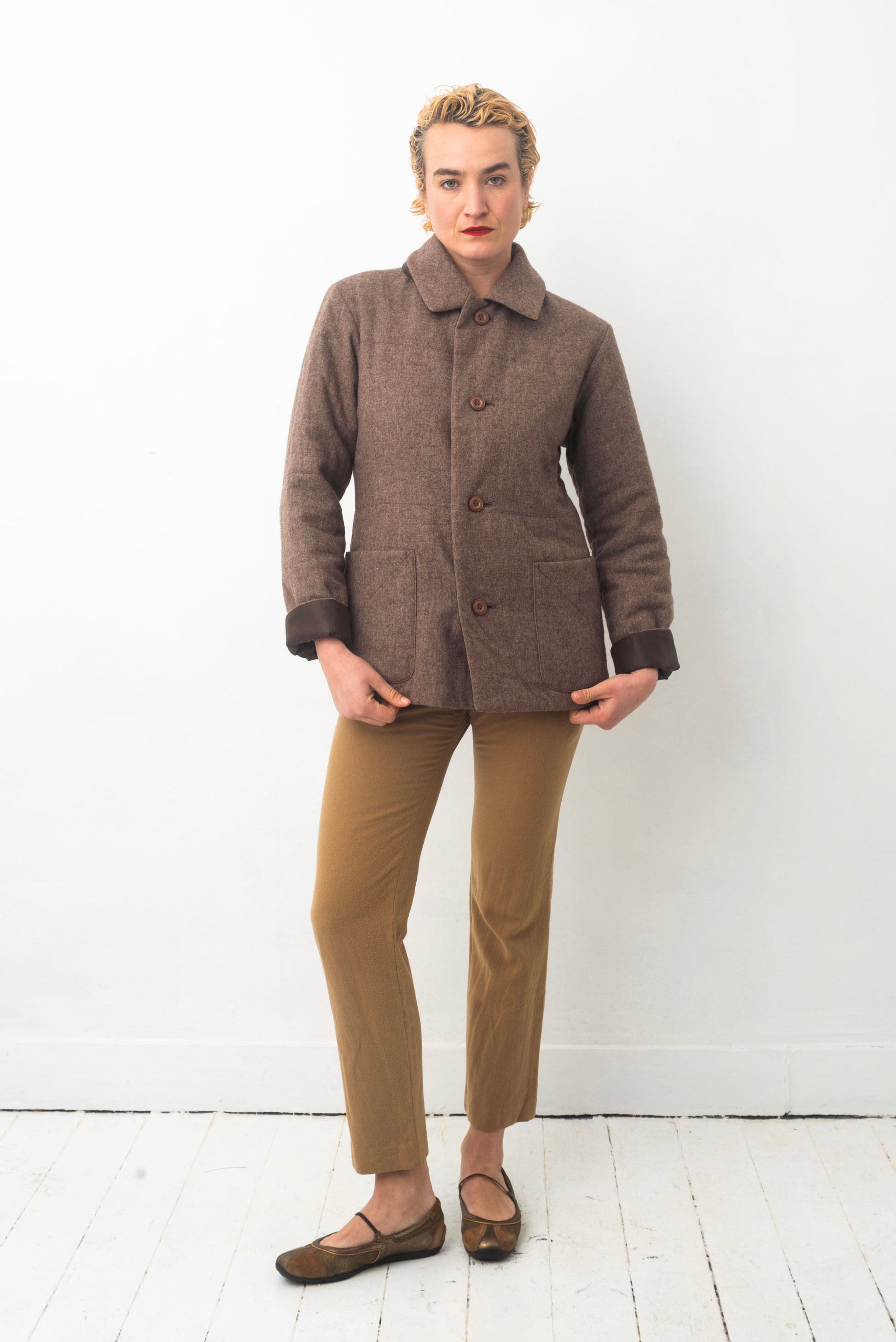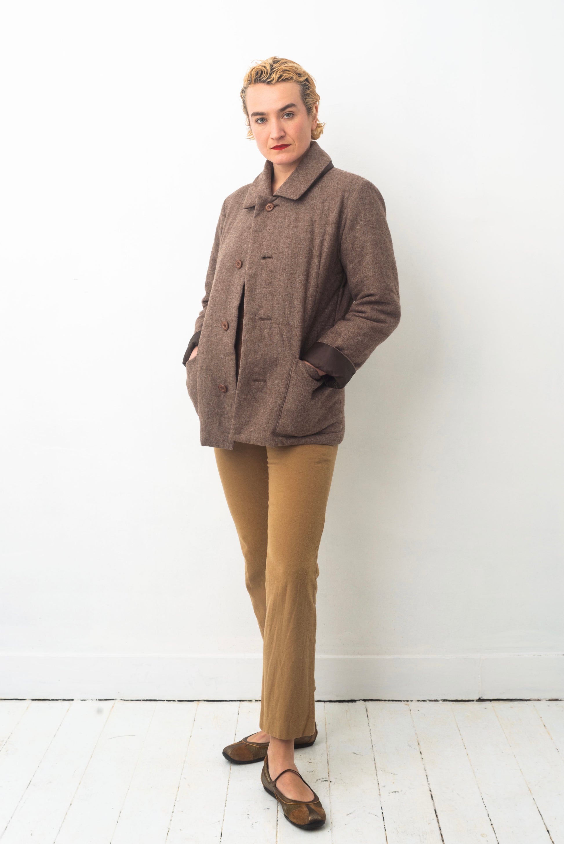 The jacket has a simple straight forward cut with two (actually 4) large bottom pockets and closes with a single row of brown buttons.