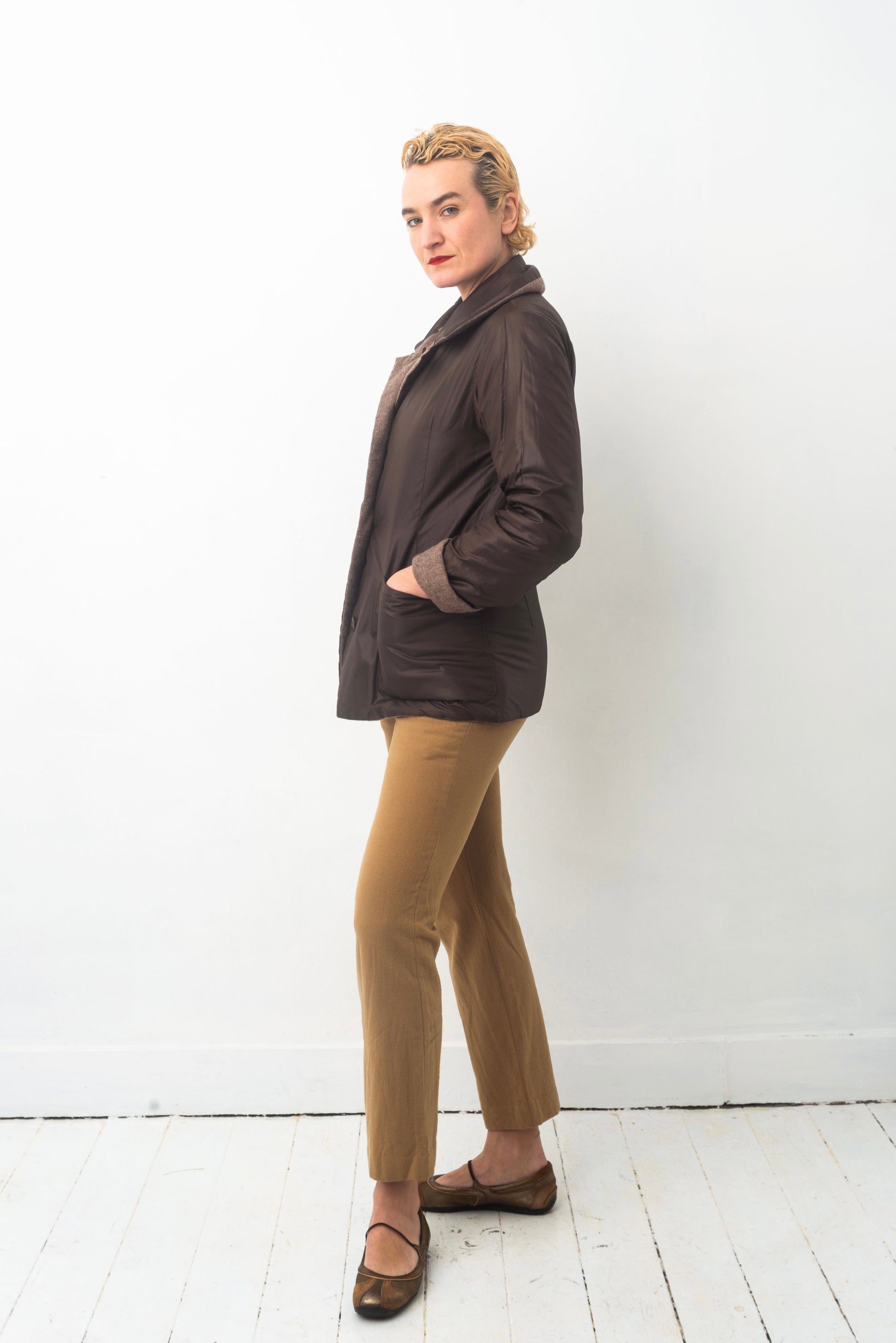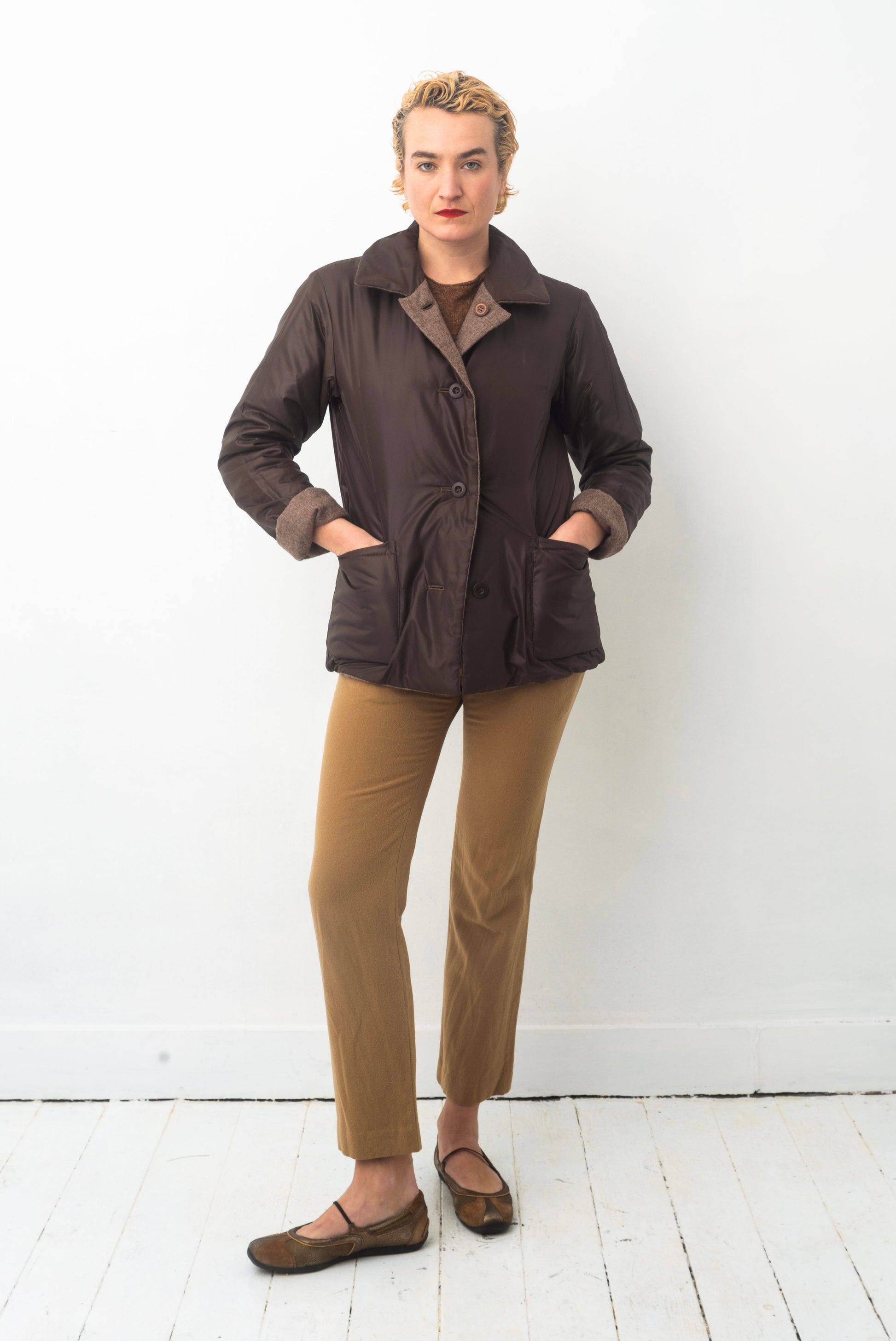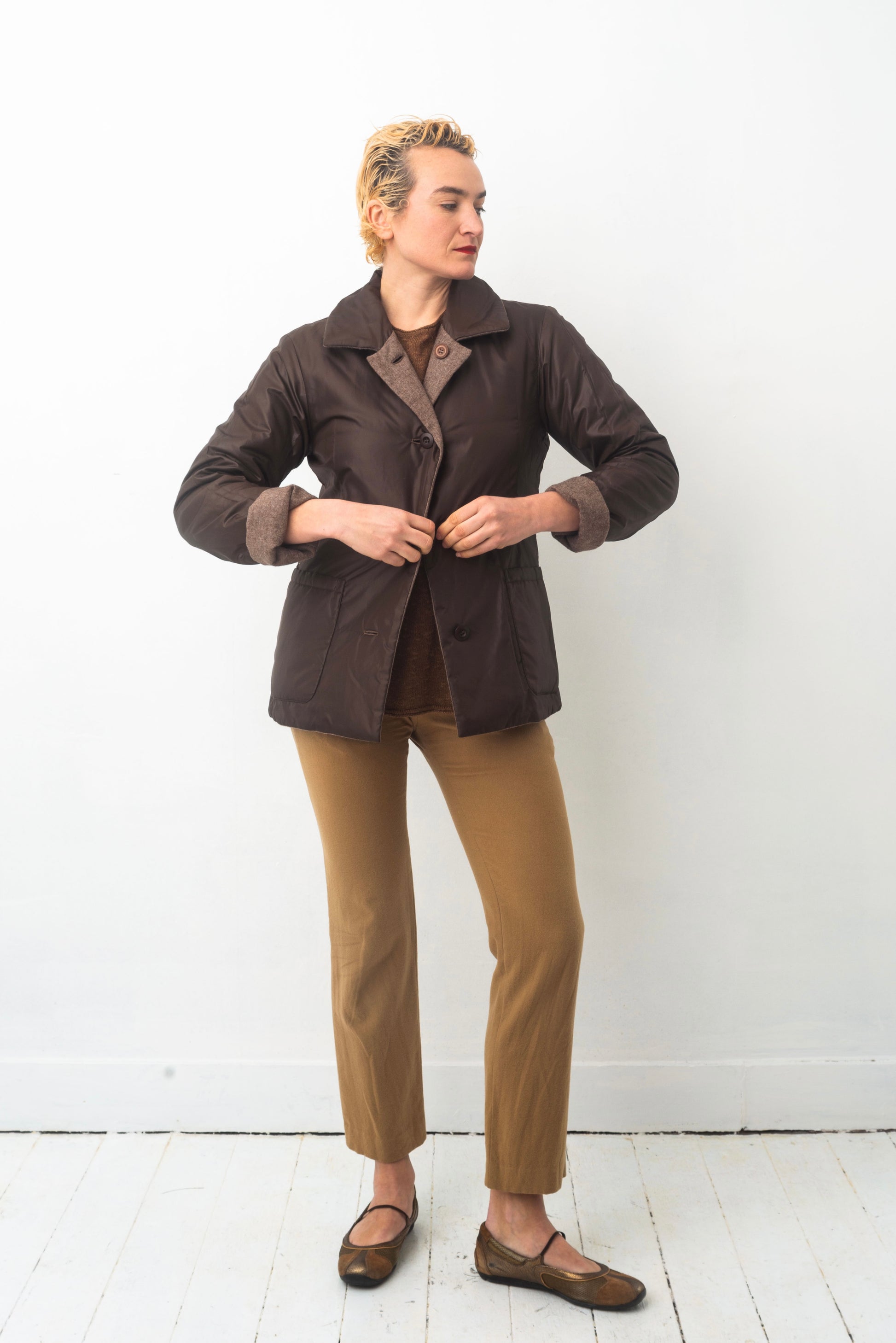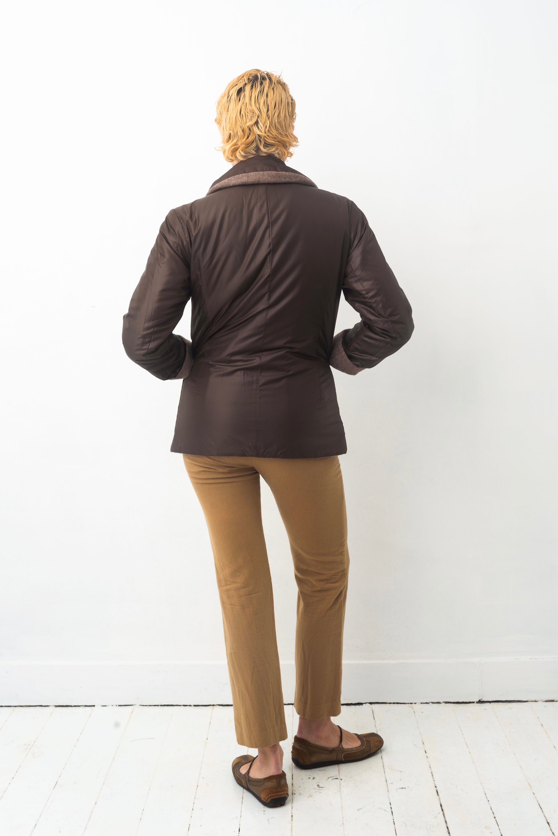 As is the case with this fantastic Issey Miyake Plantation 90’s reversible jacket: wooly, greyish brown and soft on the one side, sporty, chocolate & nylon on the other.