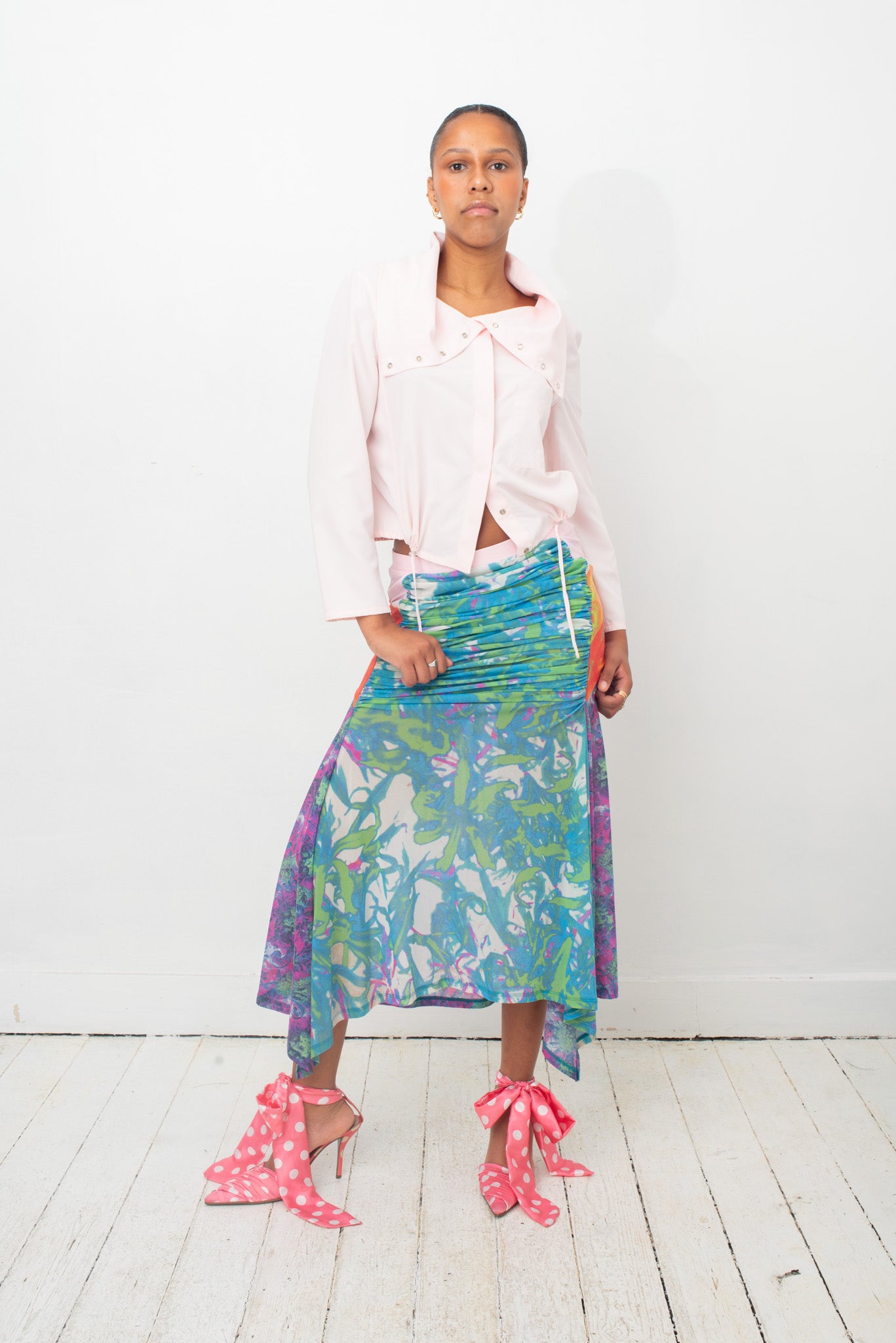 This skirt, made from a stretchy nylon, features an abstract pattern reminiscent of a tropical garden or warmth sensor imagery.