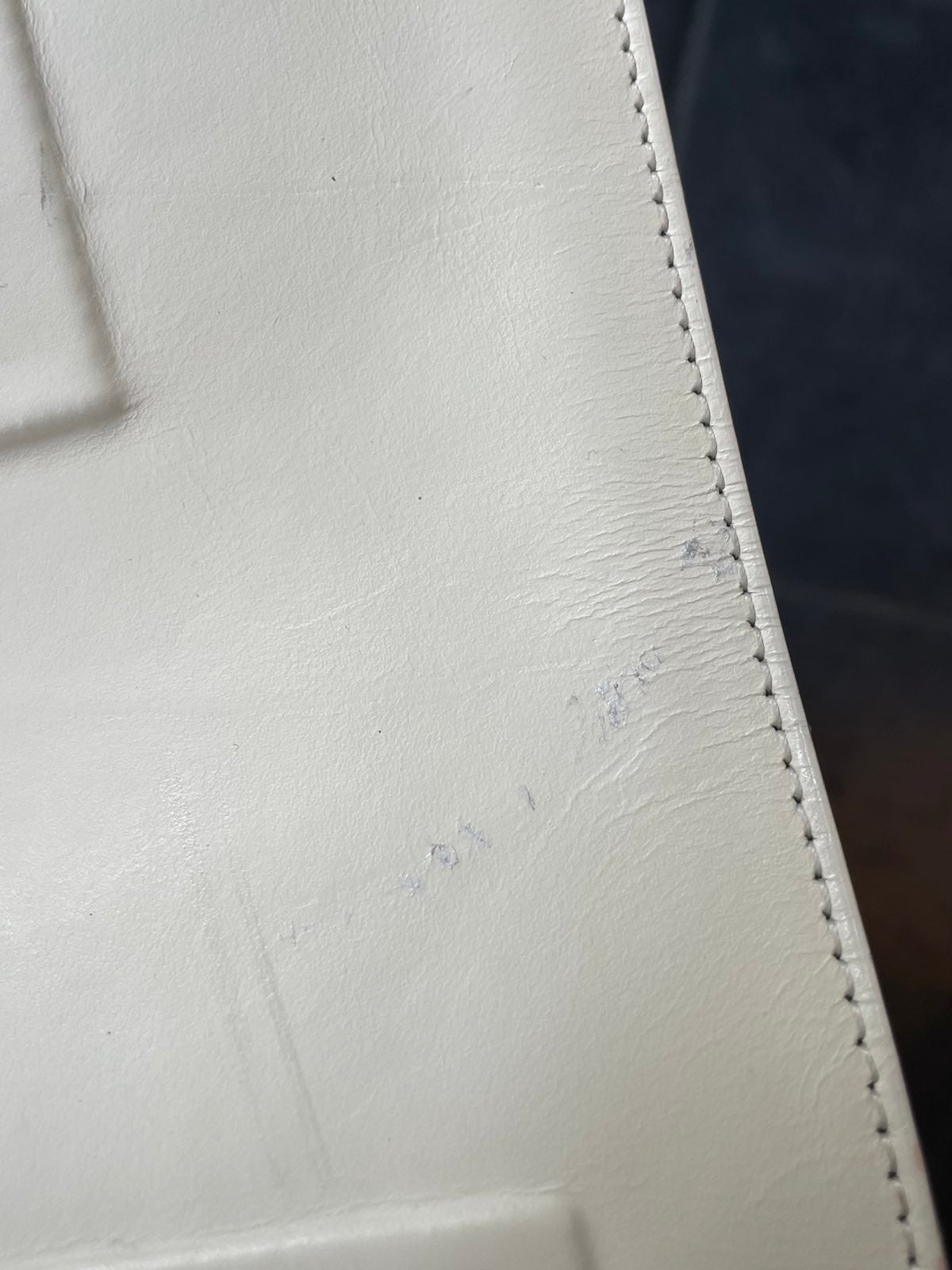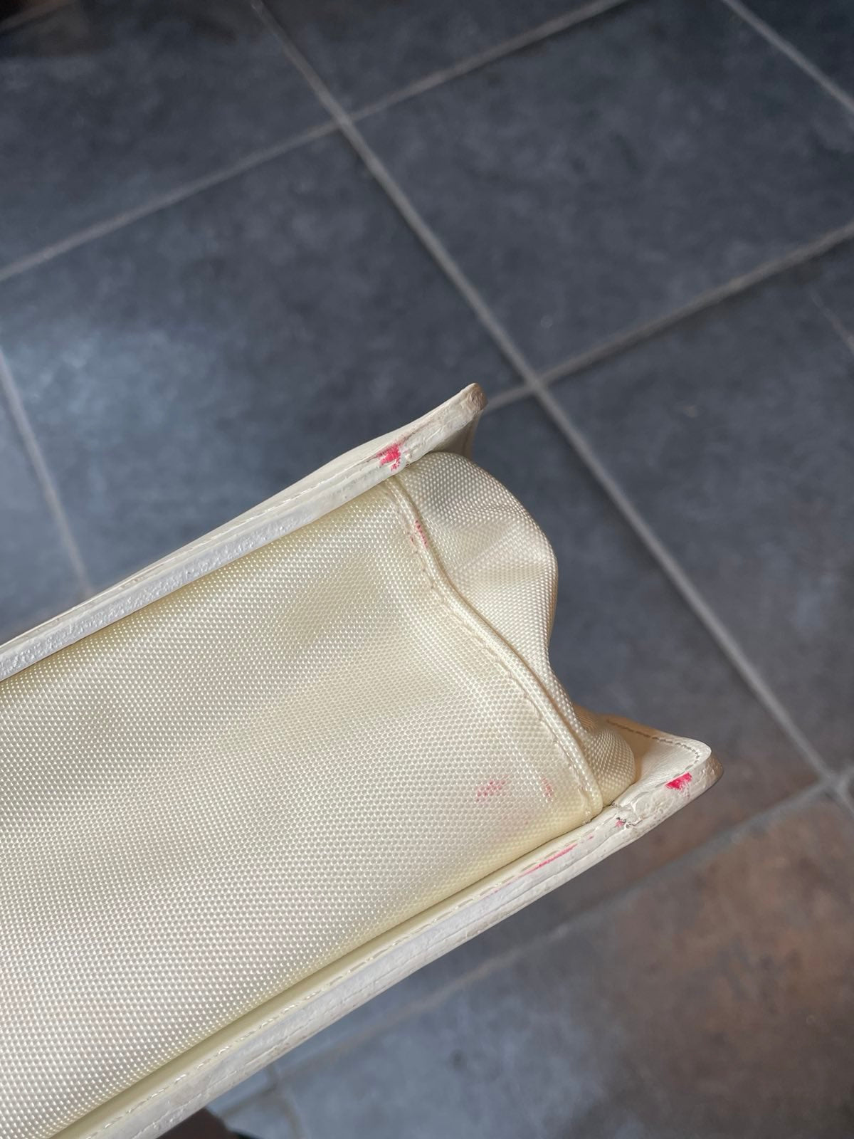 Condition : Good, small imperfections appear on front, as well as small red stains on the bottom of the bag, referenced in photos.