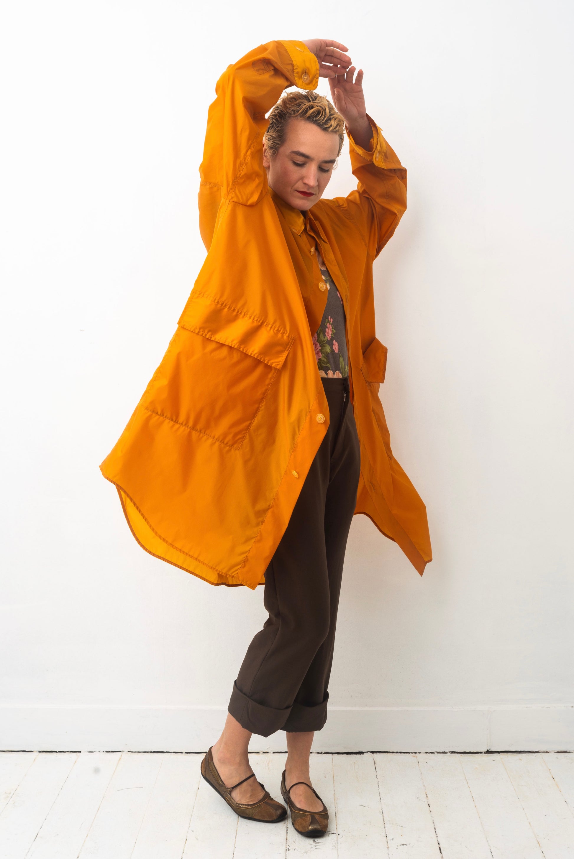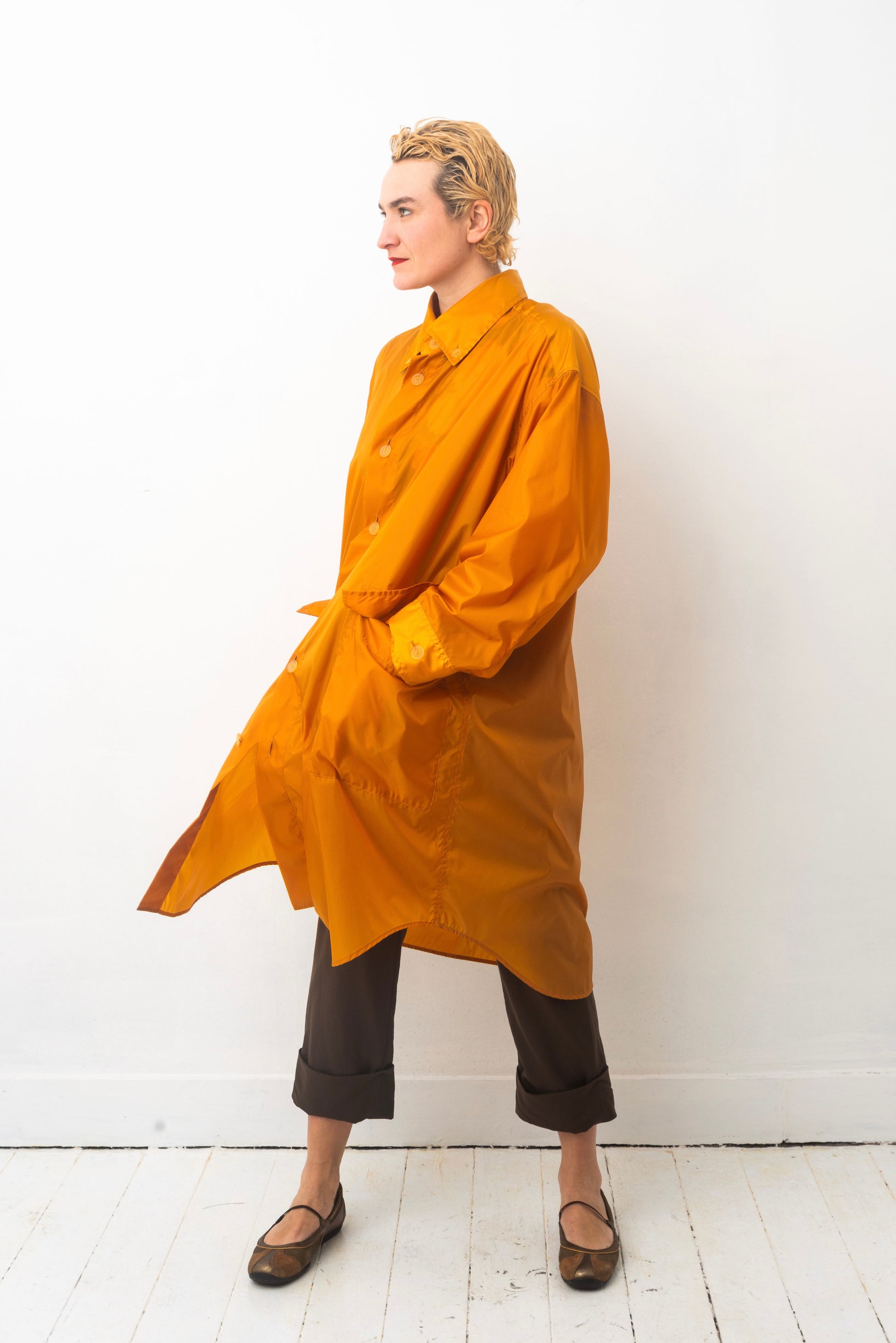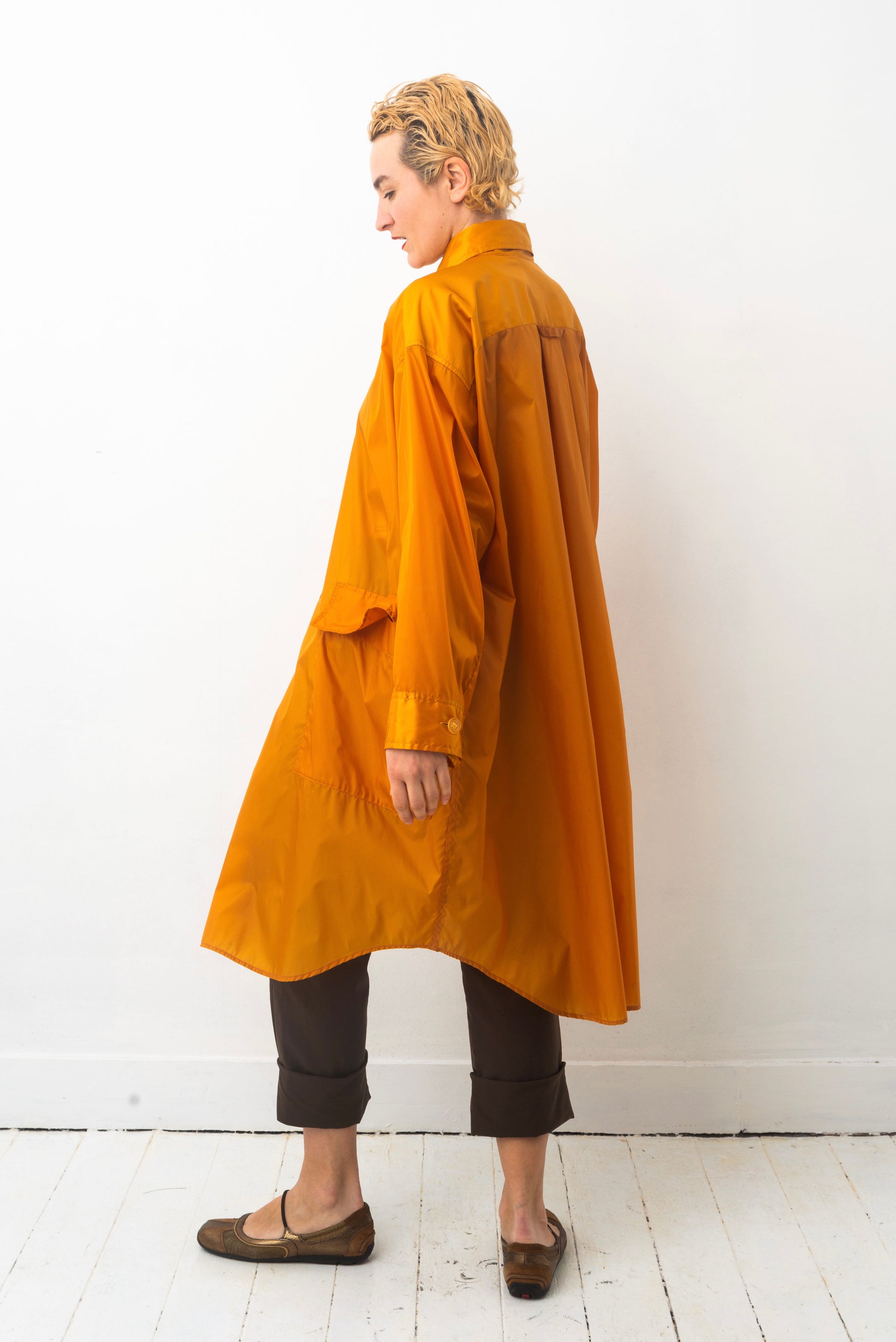 The design: oversized, light and floaty, generous in its use of fabric, with big pockets and an elegant fold in the back. A single row of orange buttons closes the coat, and two smaller buttons keep the collar in its place. The rounded hem of the coat is reminiscent of that of a button down shirt, adding a casual aspect to its overall design.