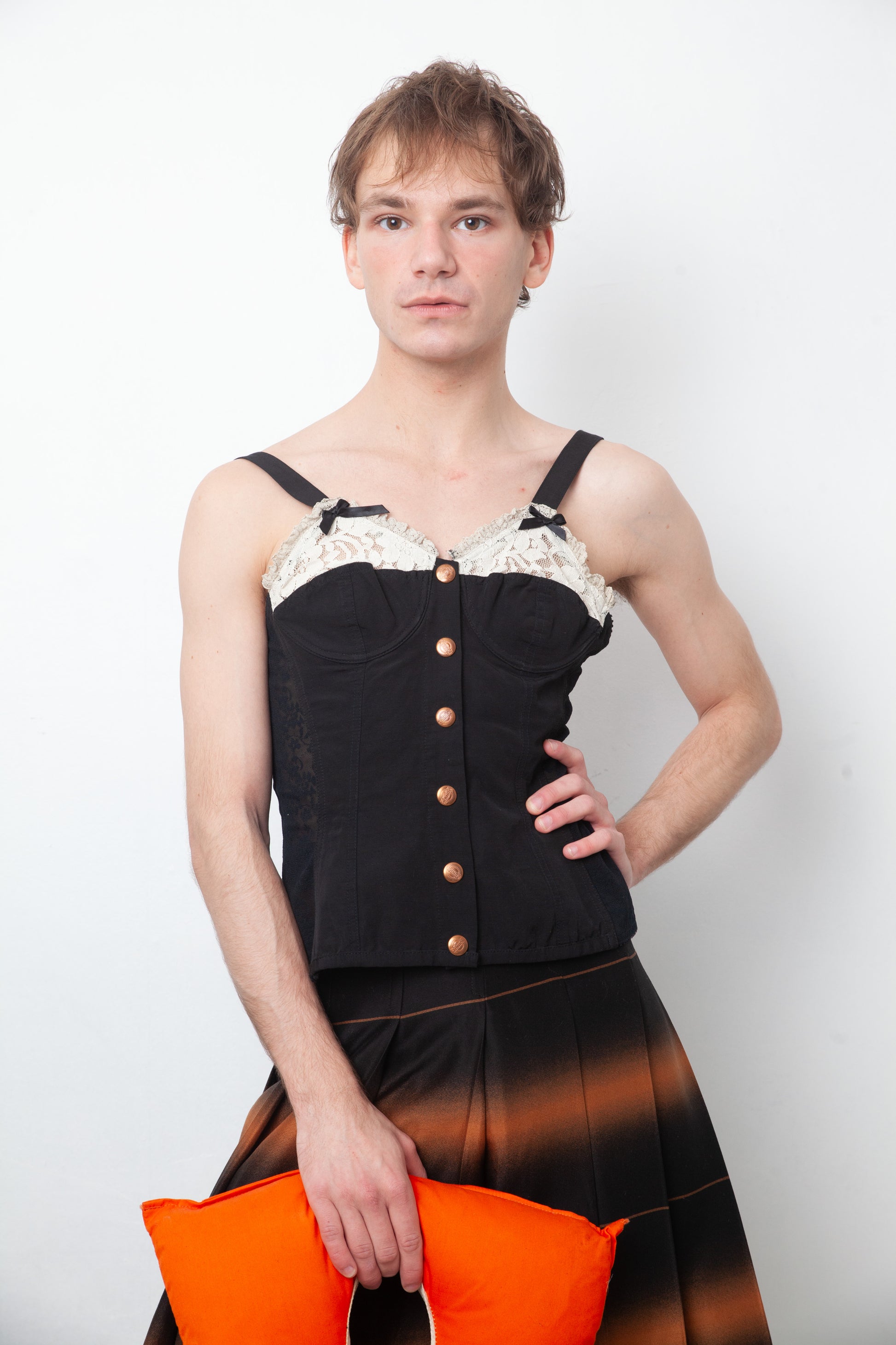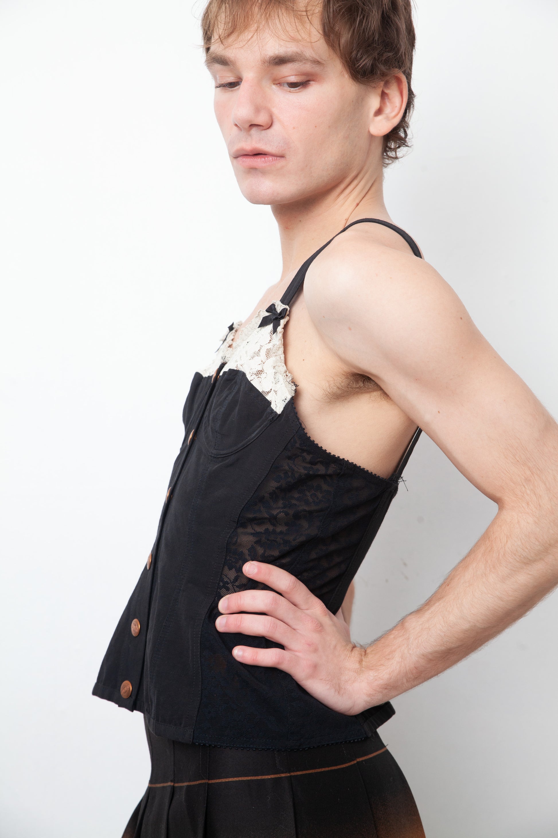 The top closes in the front with copper snap buttons, has a bra cup topped with white lace and two playful black ribbons, ending with shoulder straps. The sides of the top are made of black semi transparent lace.