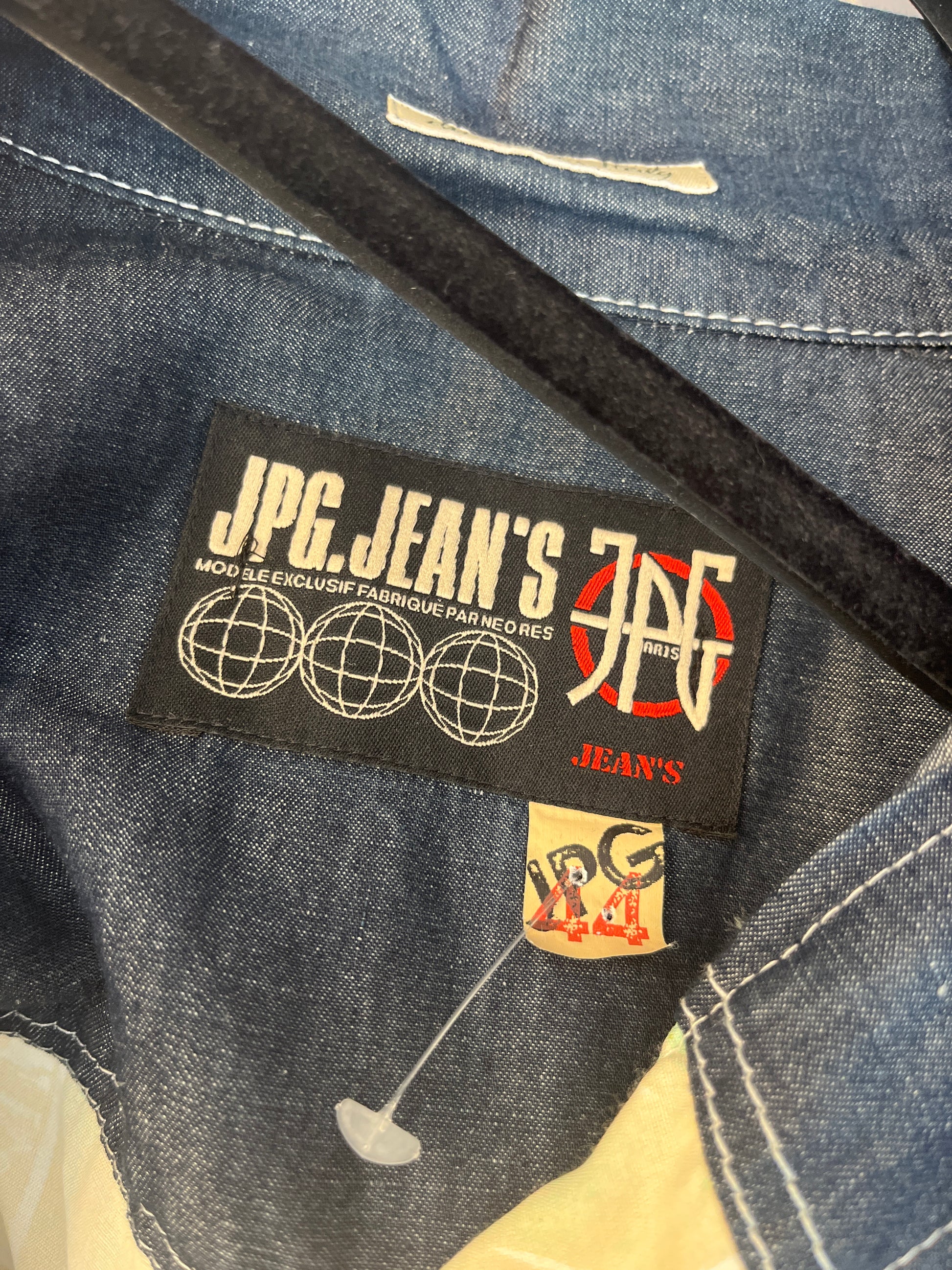 This piece proudly carries a pinch of Jean Paul’s naughty sense of humor. It’s made of blue denim that is decoratively sewn with contrasting white thread and on the chest, hips and sleeves, there are stripes of colorful fabric depicting spicy scenes from a comic book.