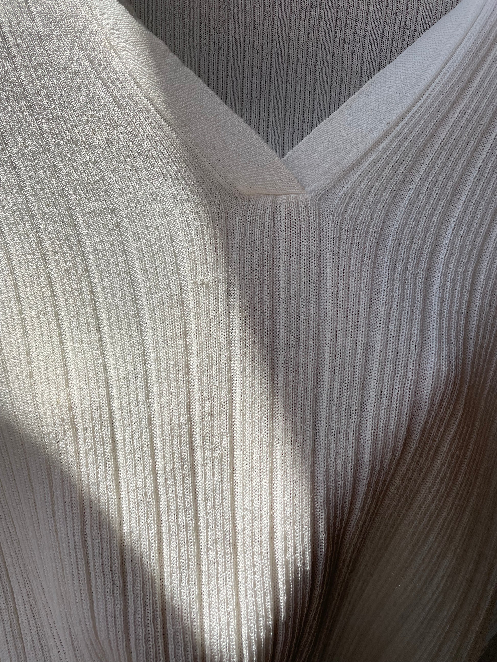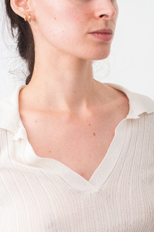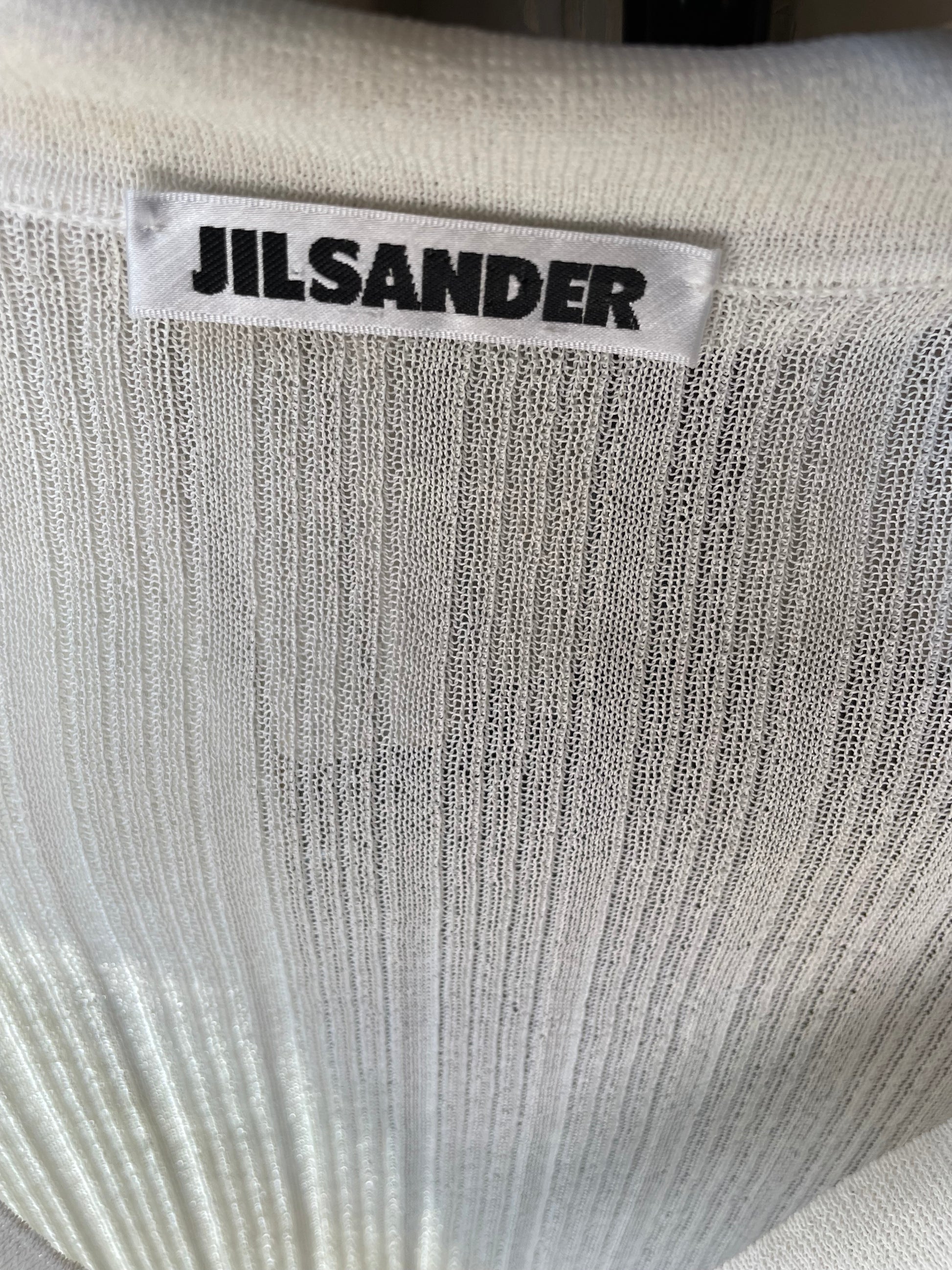 Delicate stretchy off-white knit shirt by Jil Sander from the 90’s. The shirt is made from a semi transparent, ribbed knit with a v neck and a small polo collar.