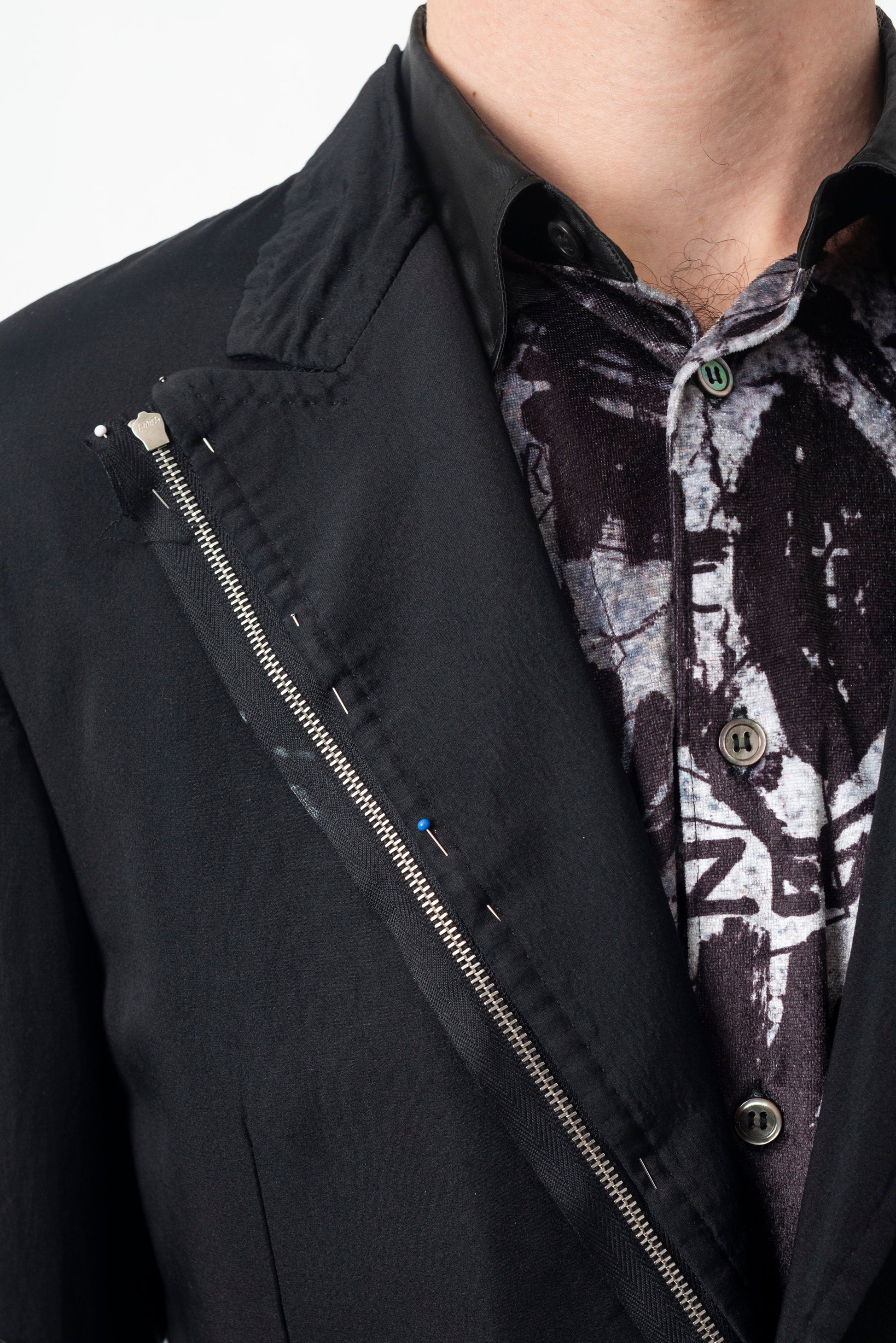 John Richmond silk and cotton black blazer with a punk spirit manifested by the various decorative zipper details at the sleeves as well as at the collar, where a white paint stained zipper is attached with glass head pins to the right lapel of the jacket. Create the illusion that the jacket comes straight from the workshop and is still in the process of being finished.