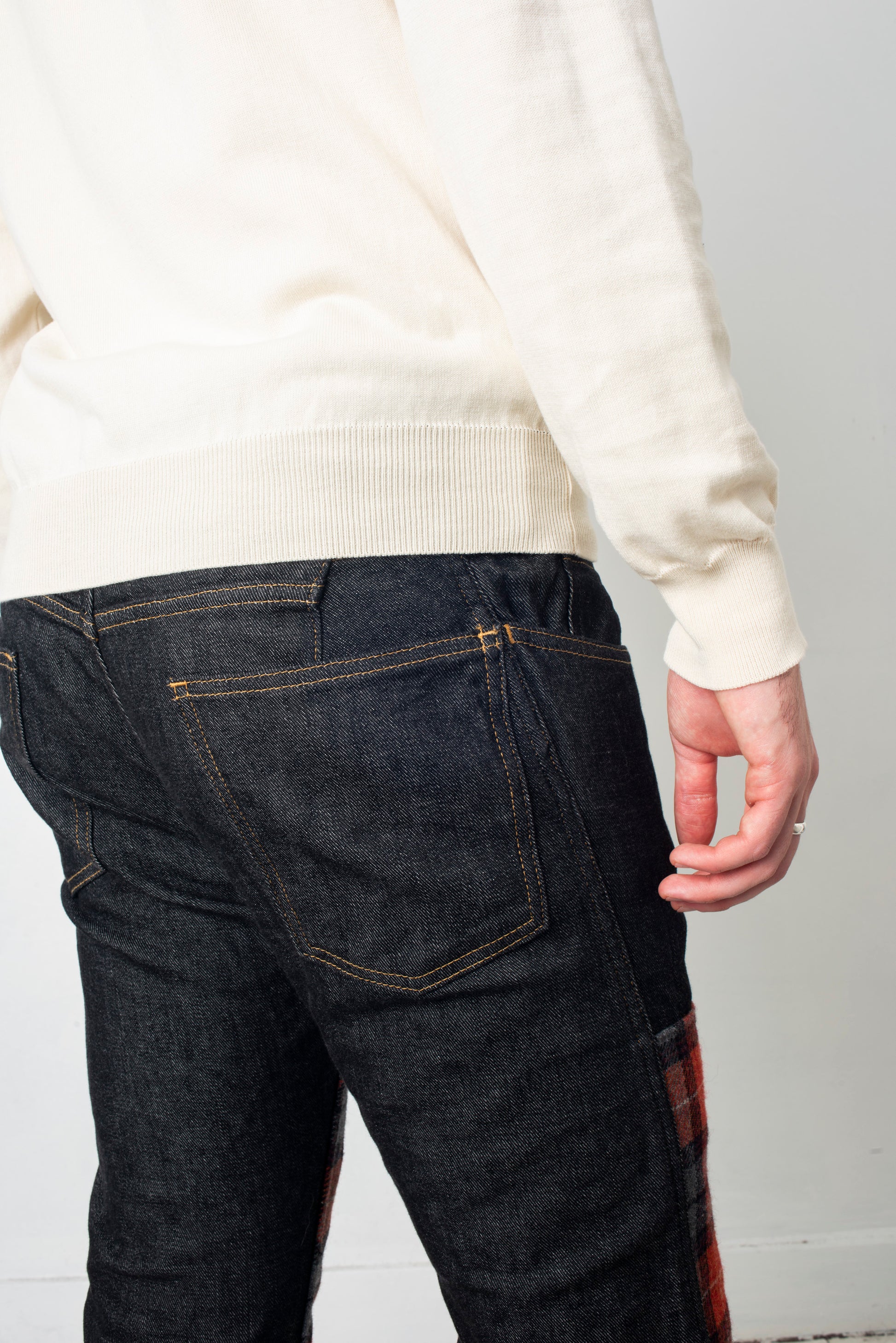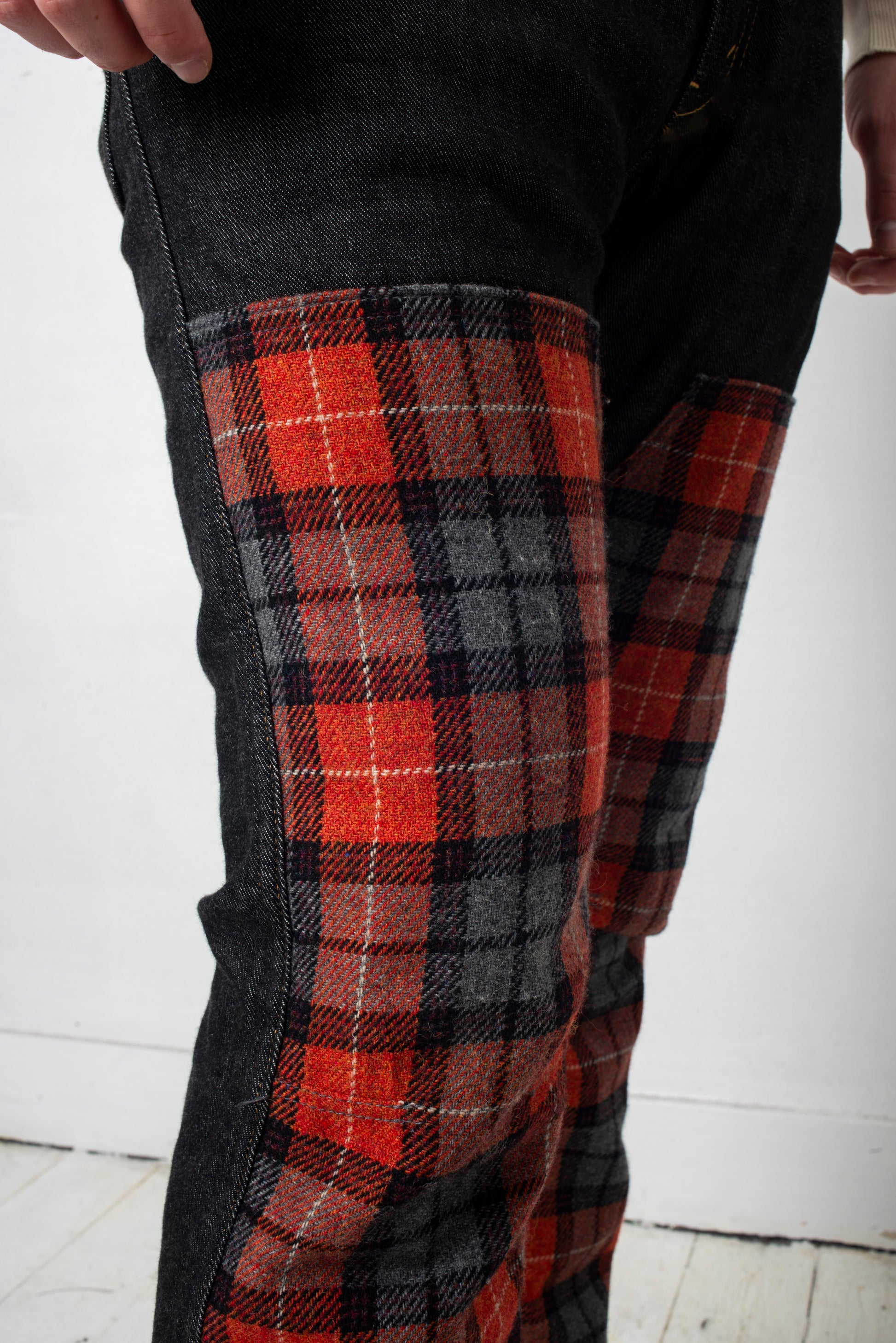 The trousers are denim with a large vertical orange tartan patchwork in front.