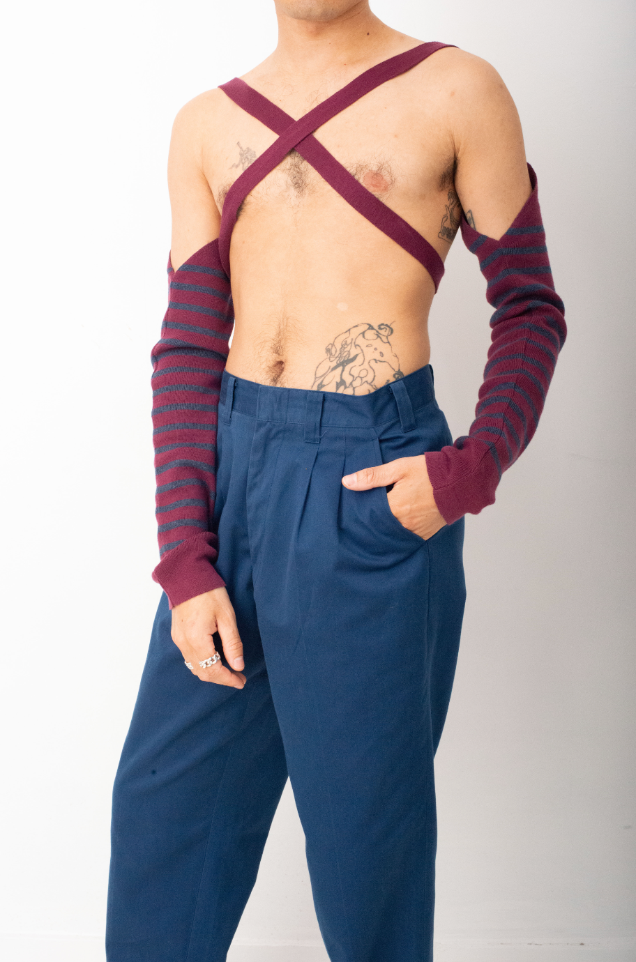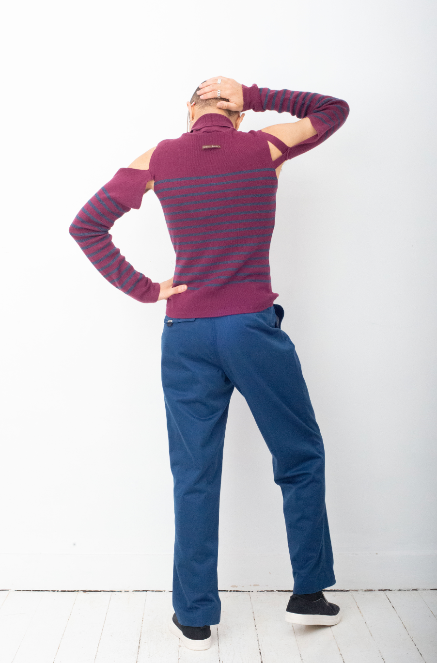Here worn with a Jean Paul Gaultier striped knit turtleneck, also available online.