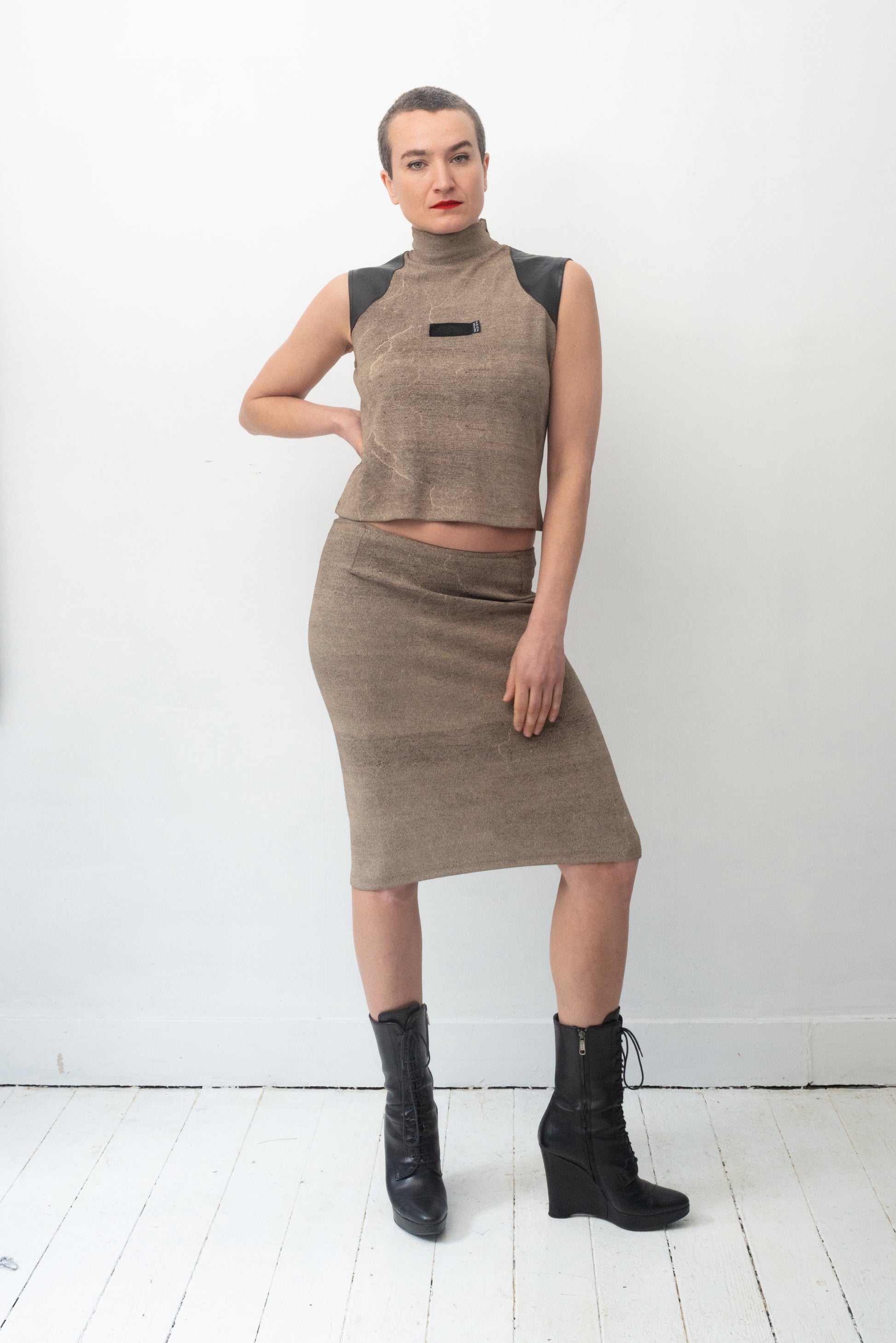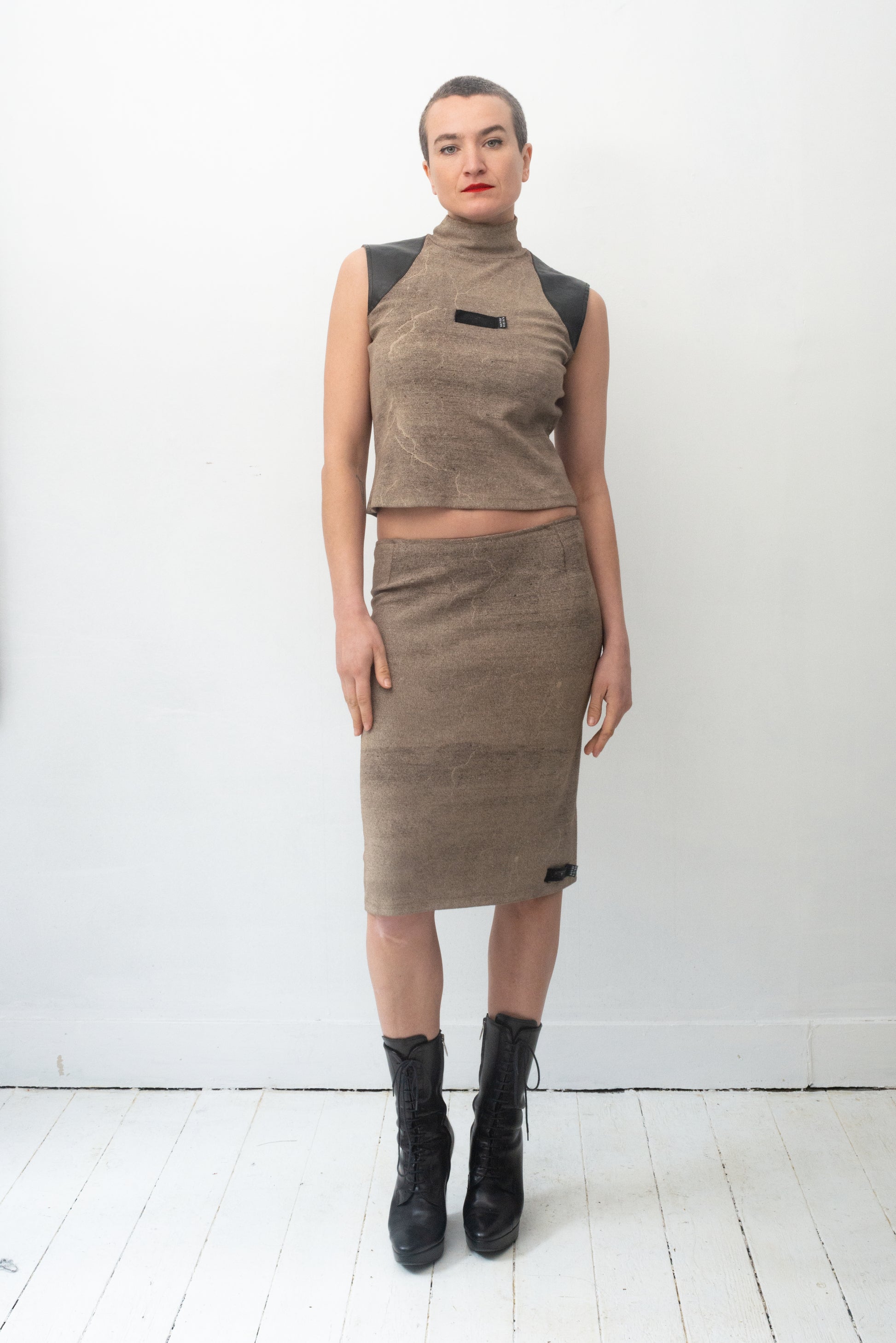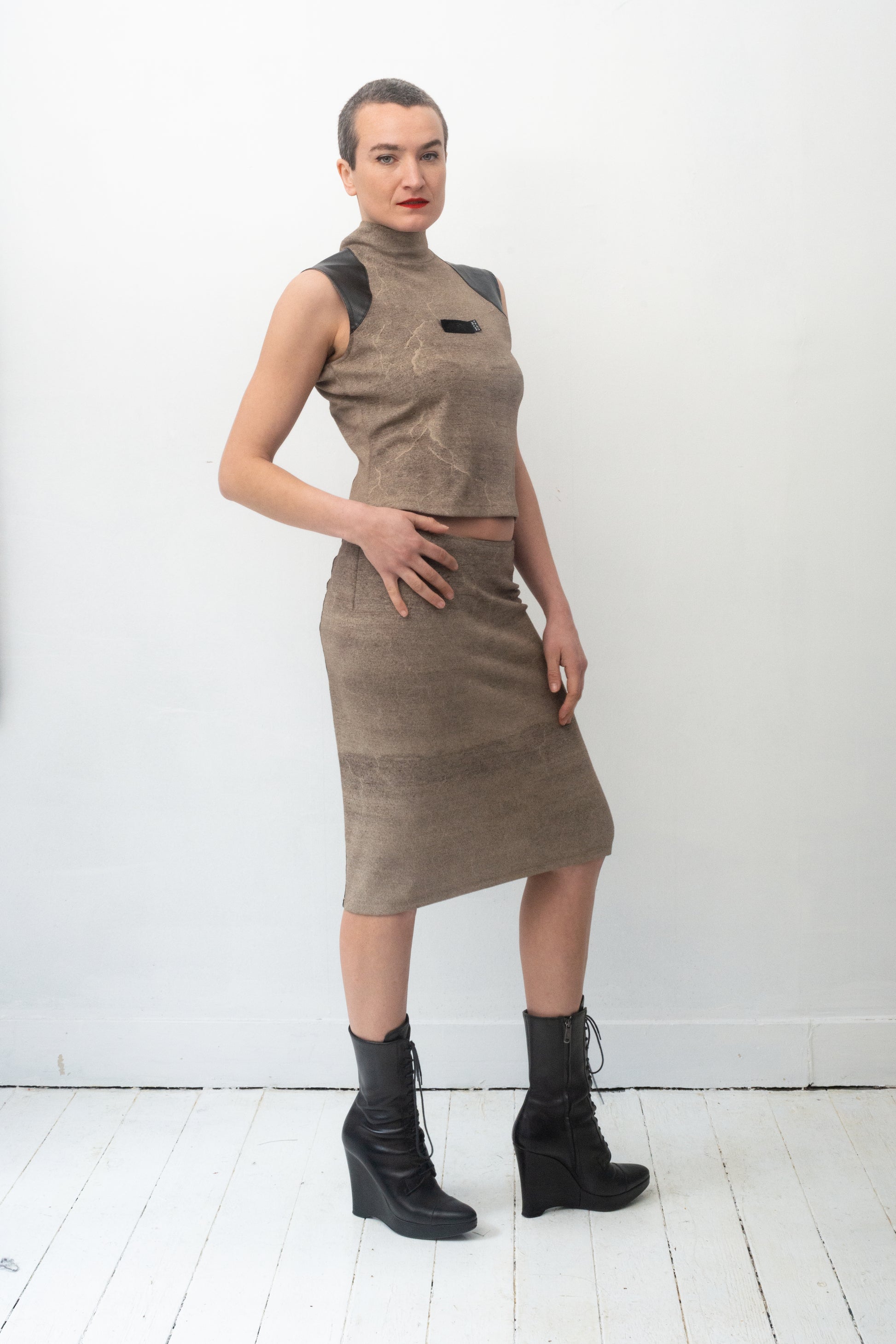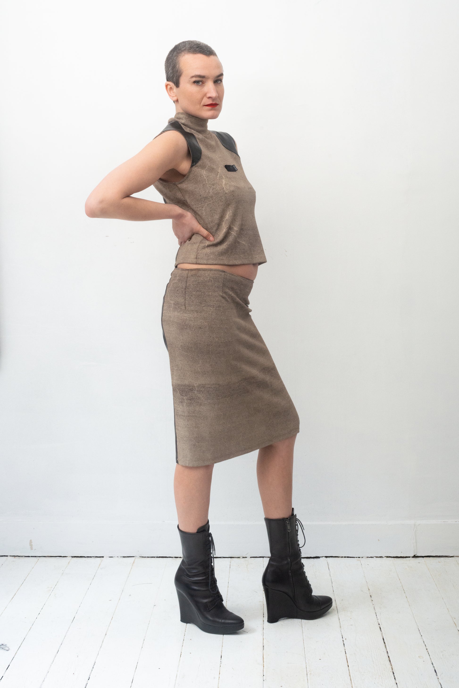 Super cool set by Krizia from the 90's composed of a pencil skirt and a sleeveless top with a turtleneck.