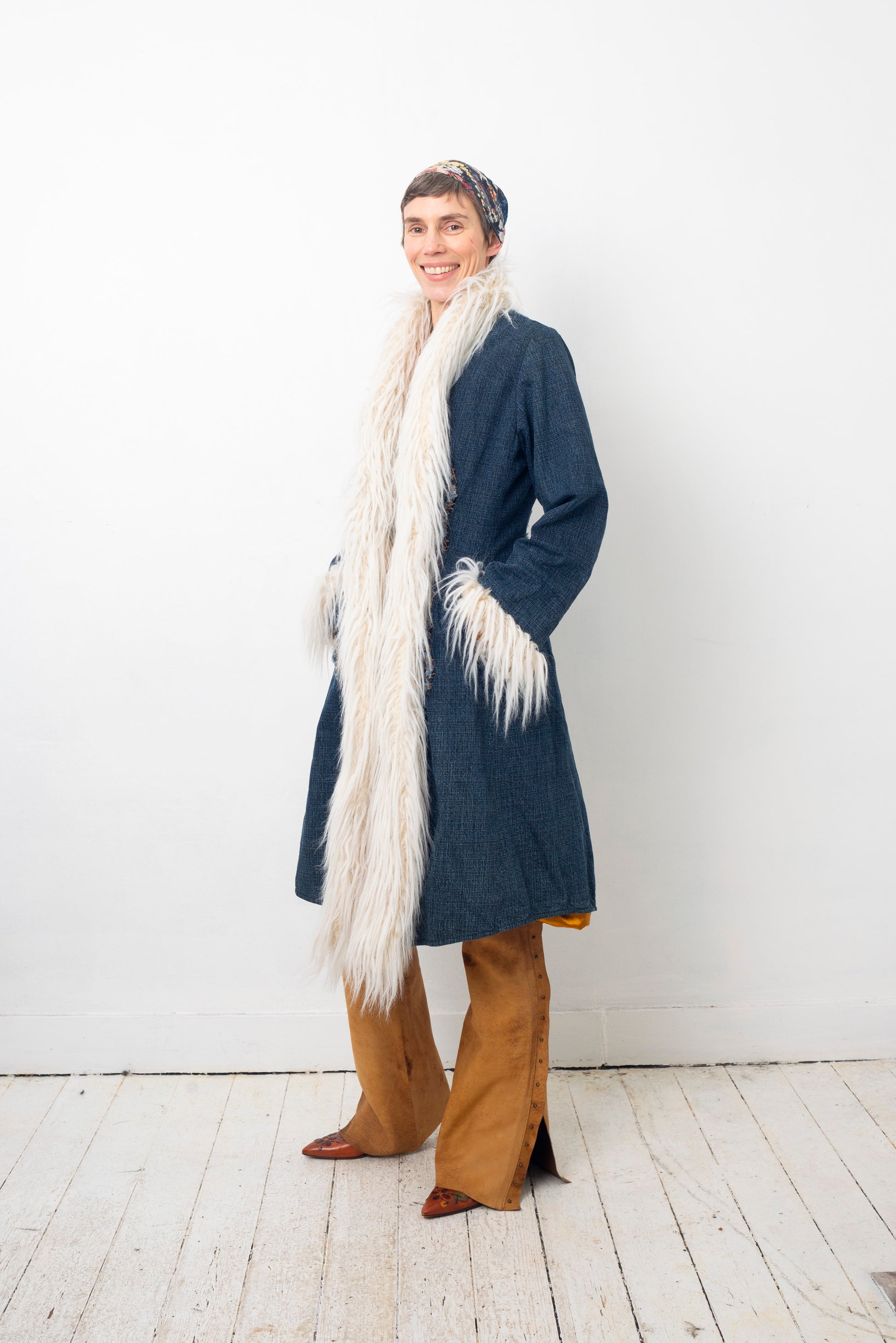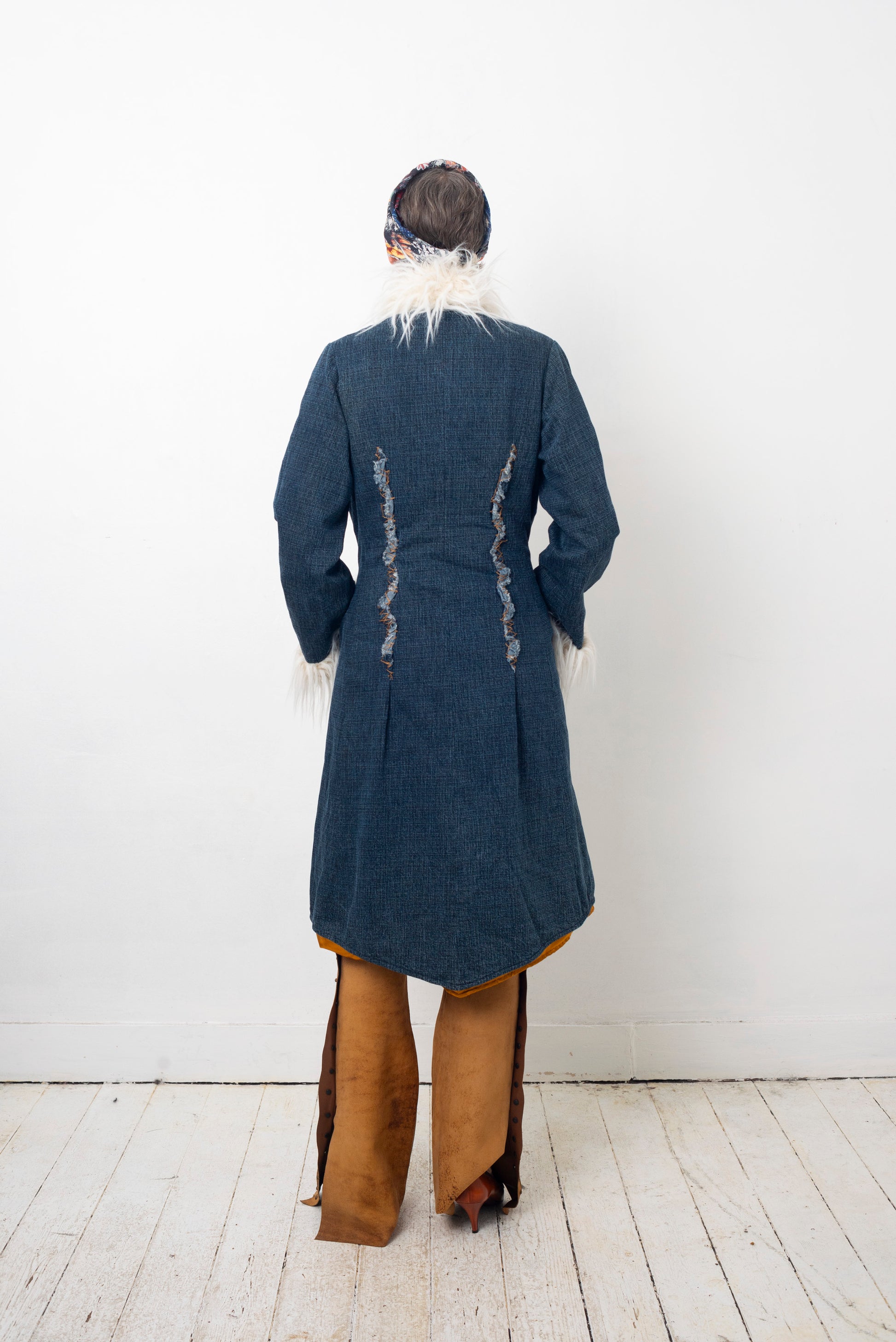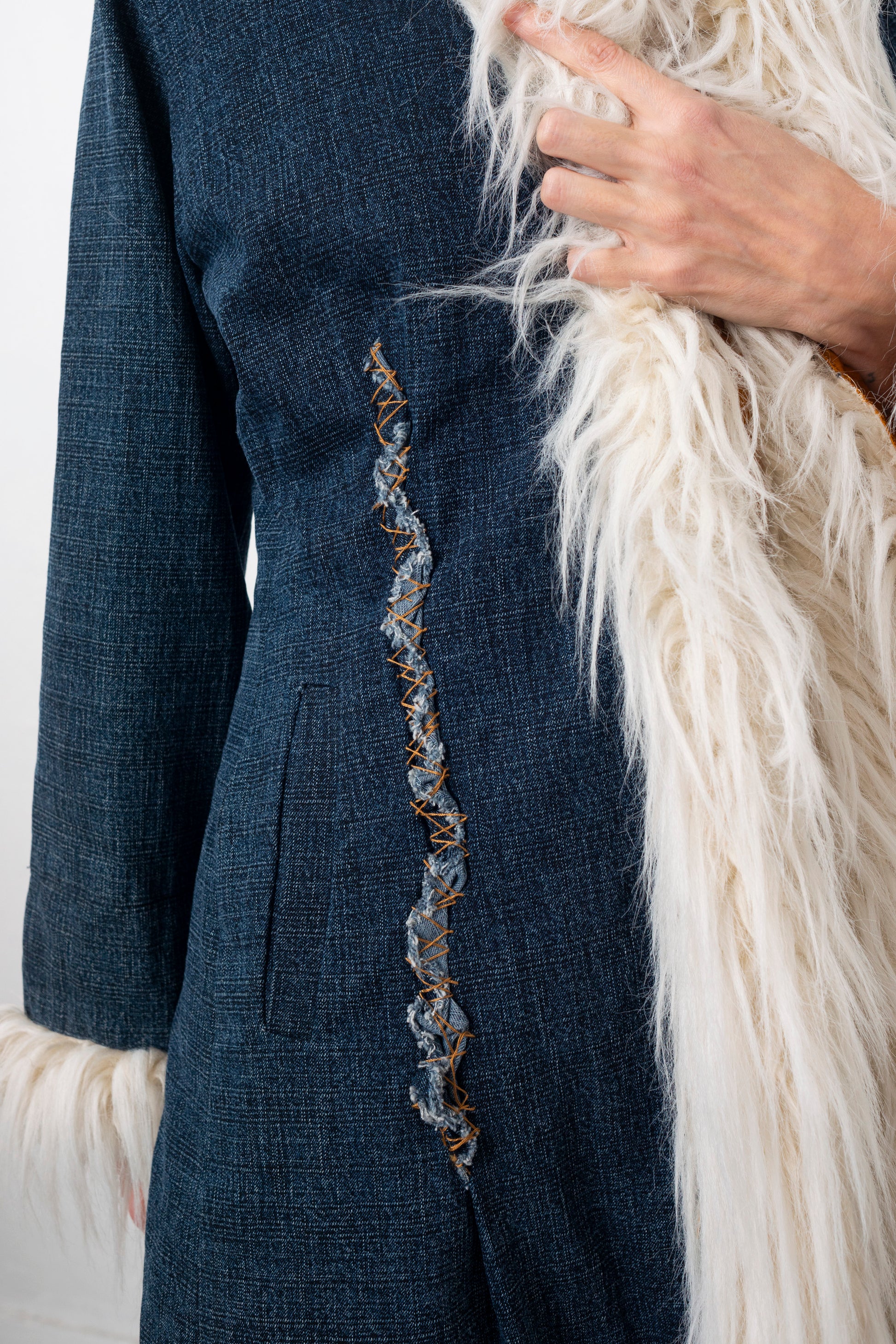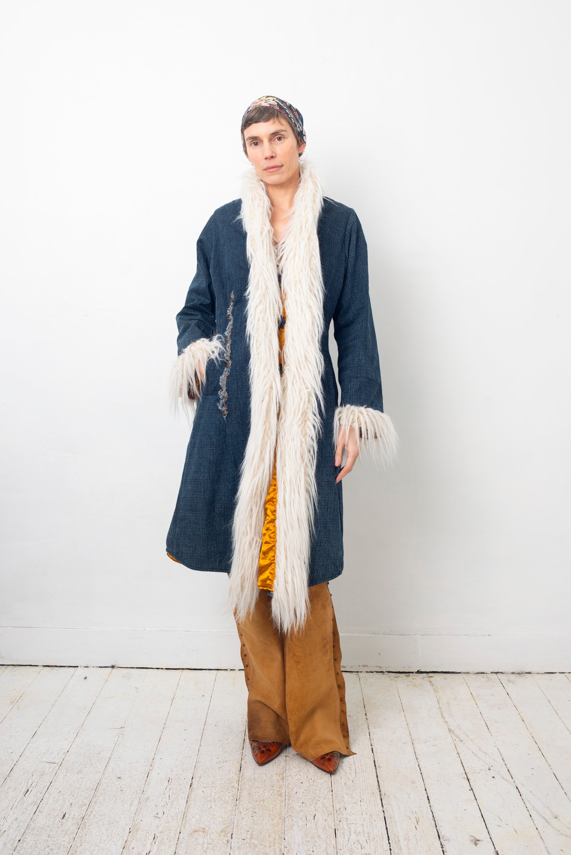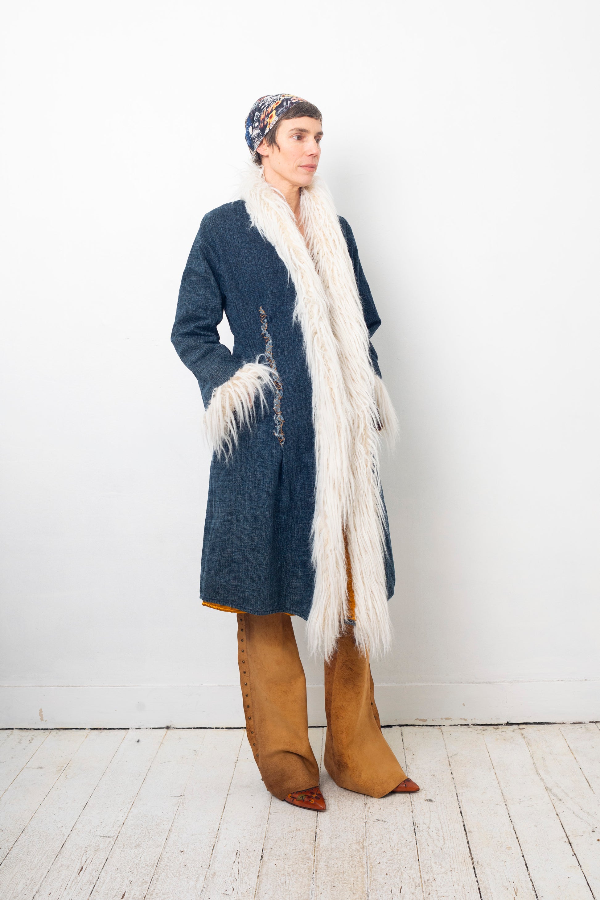 Fabulous denim coat from Indian-French designer duo Lecoanet Hemant with white fluffy faux fur trims, collar and cuffs.