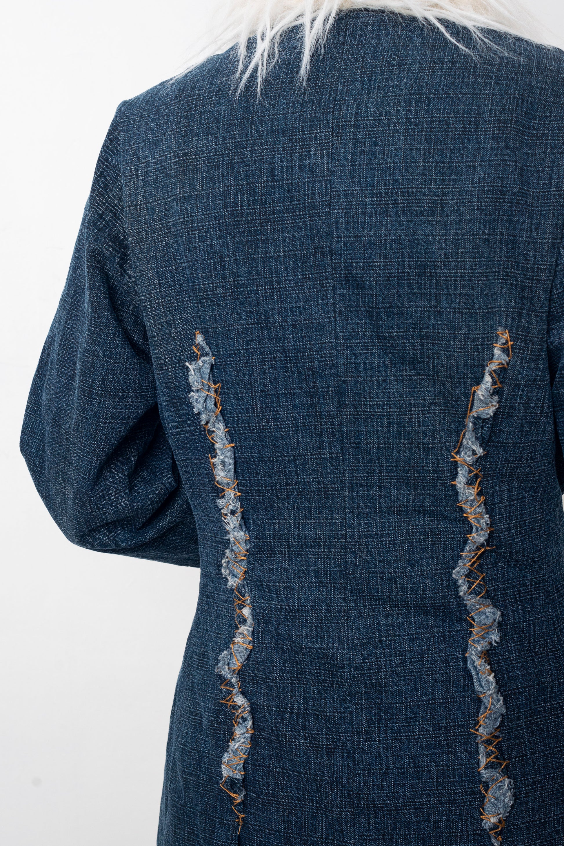 The coat has two outer pockets and is decorated with folded denim vertical lines that are irregularly sewn on the coat with bright orange thread in the front and back of the coat.