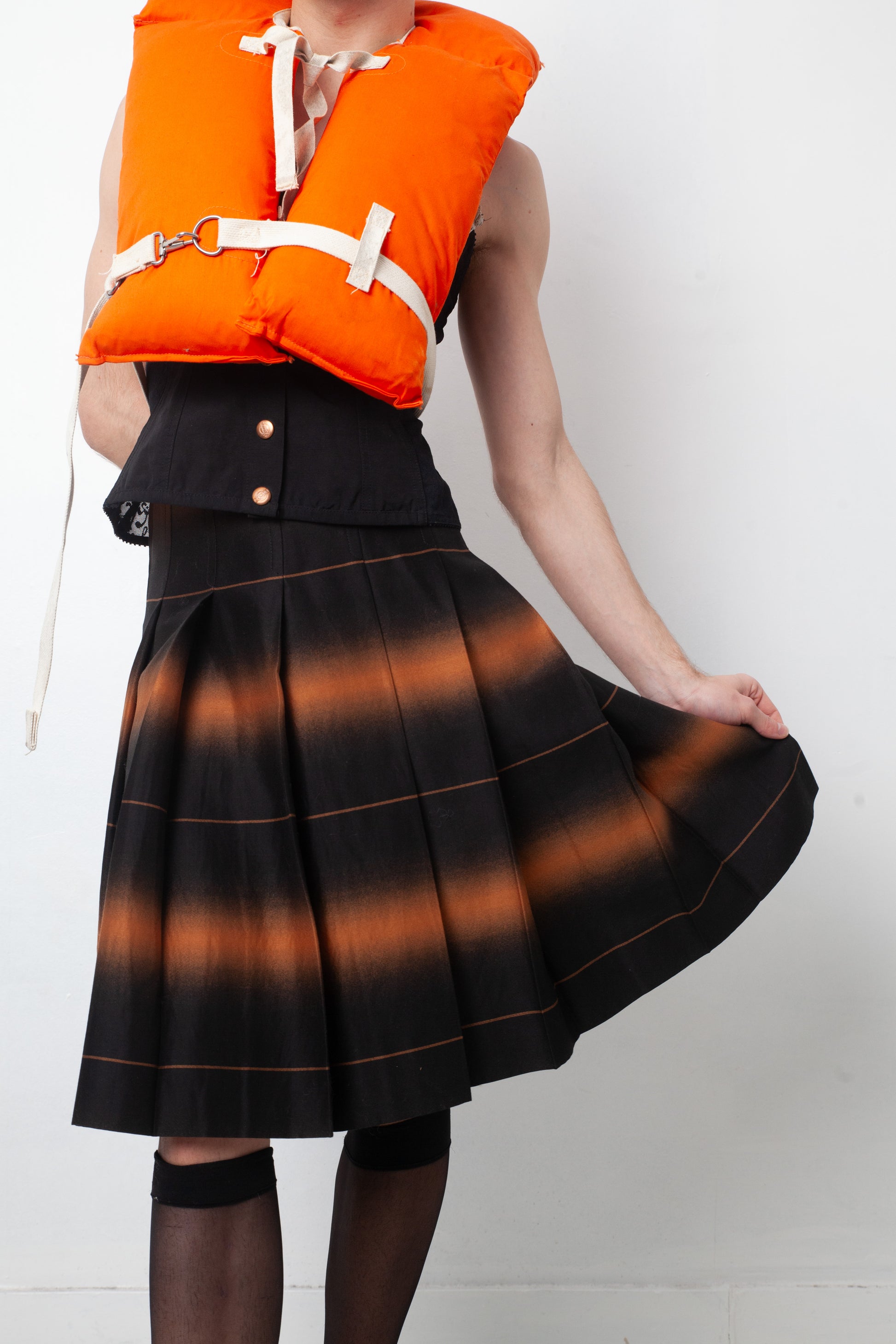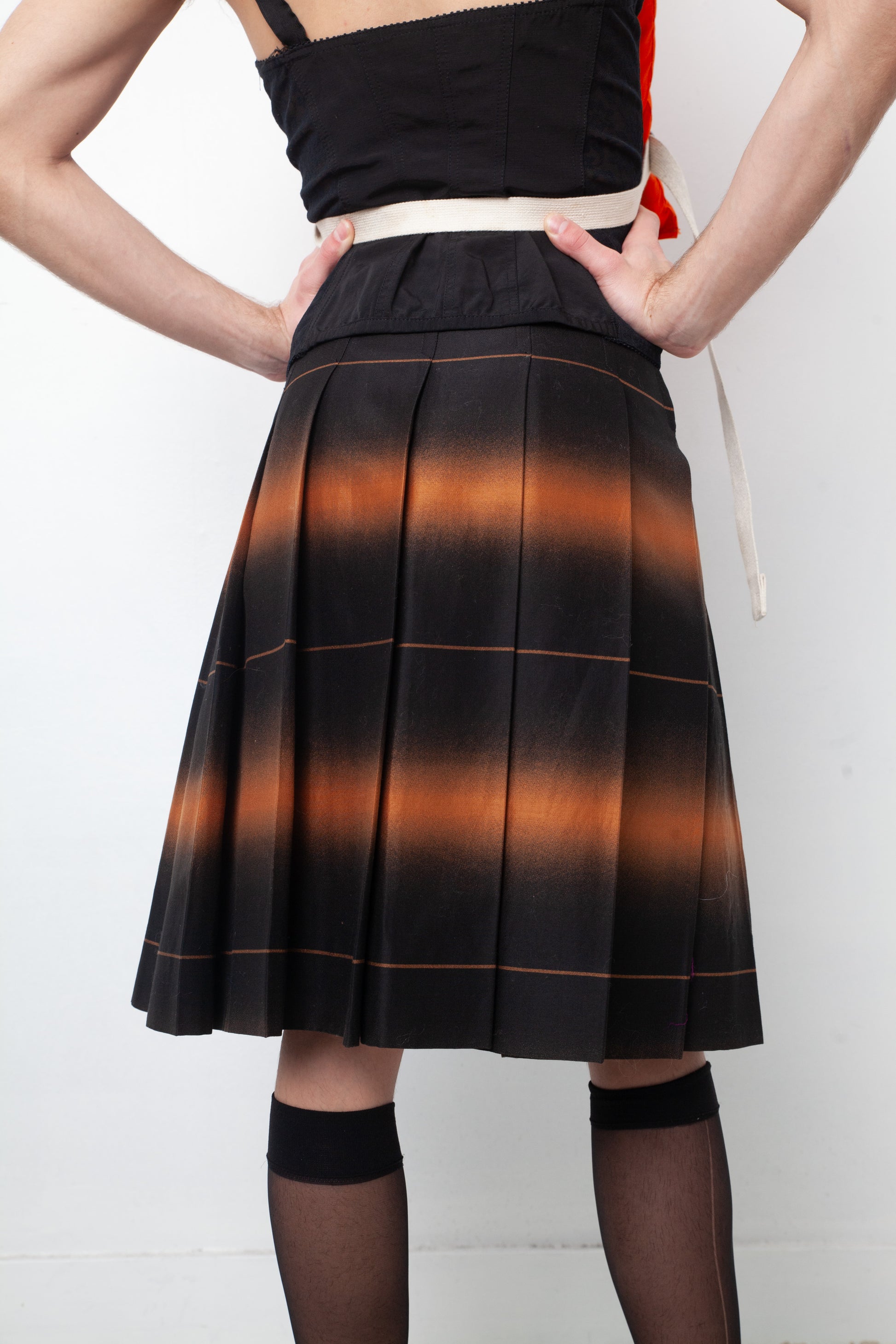 Marc by Marc Jacobs 2010's pleated knee length A-line cotton and silk skirt in black with blurred orange horizontal lines.