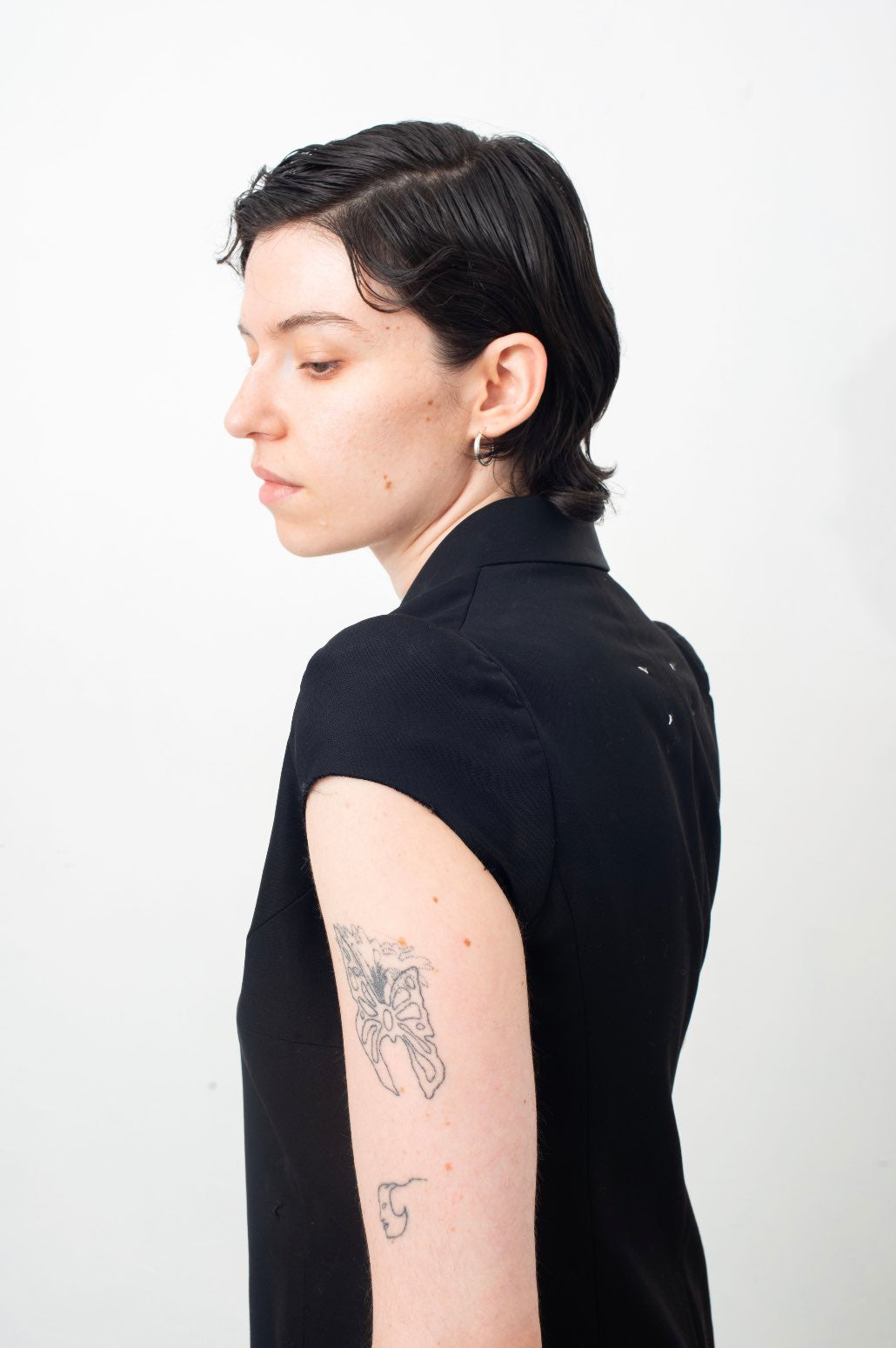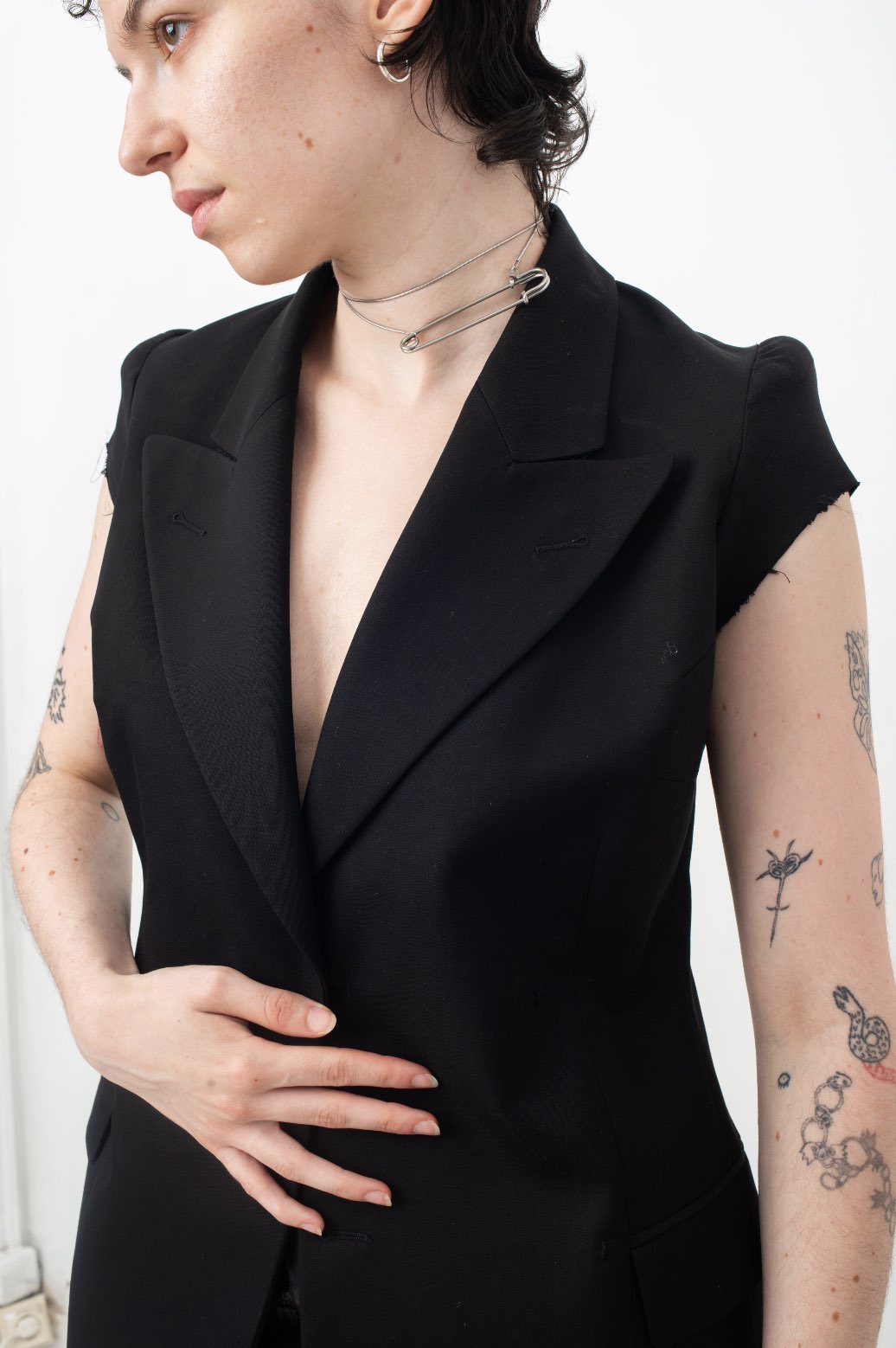 Almost each and every look had that then/now familiarity and surprise about it. As for this remarkable deconstructed cigarette jacket, the original one dates from his first collections, beginning of the 90's. It features the same slightly puffed Edwardian shoulders, narrow waistline and thin side pockets. The slight changes are the missing buttons around the collar, that emphasize the elegance and sobriety of the silhouette. Although the unfinished and raw hems of the shoulders add a certain edge to the piece.