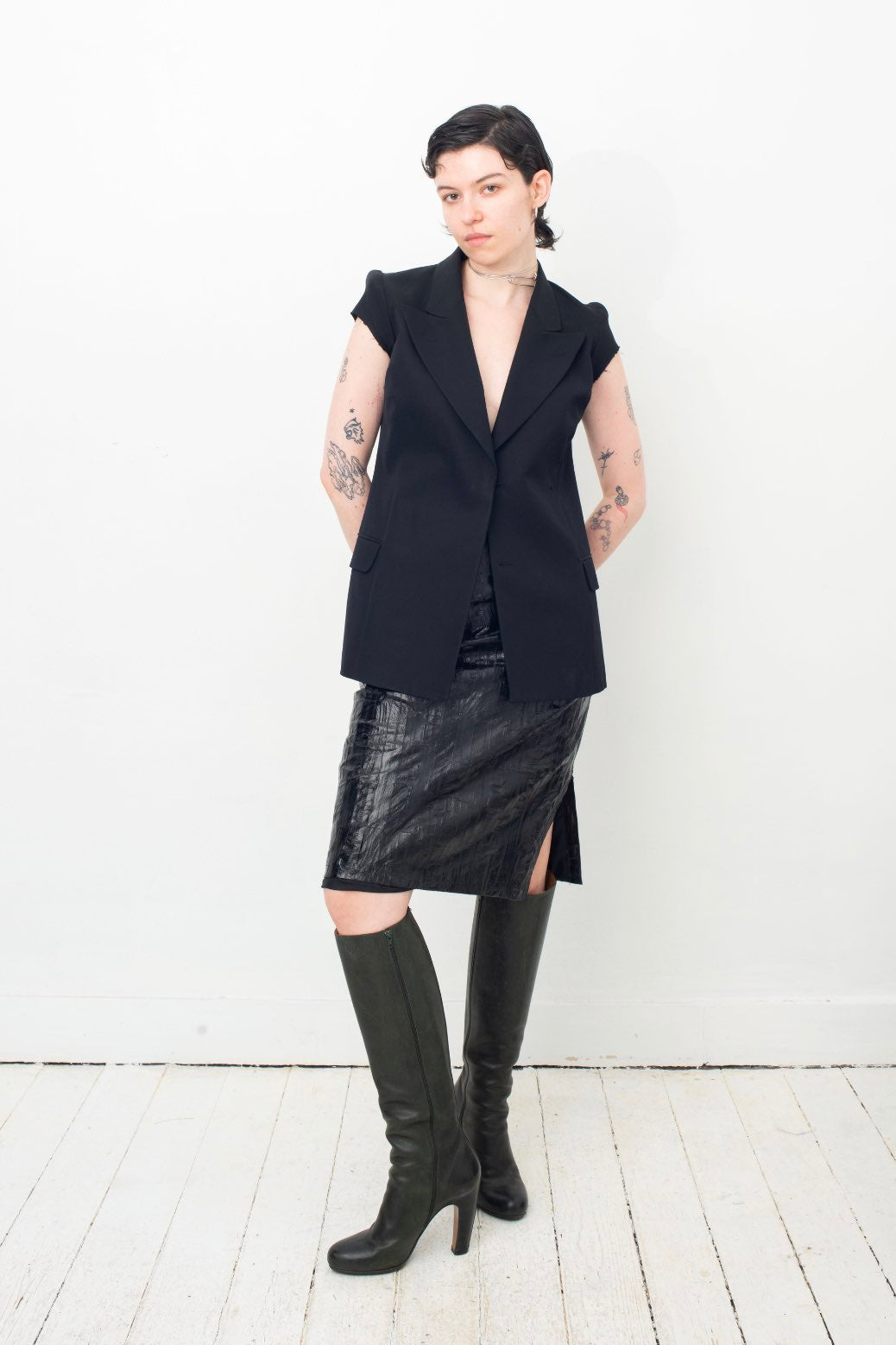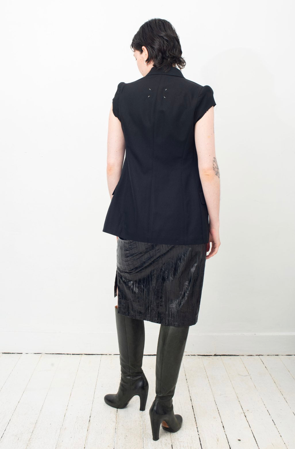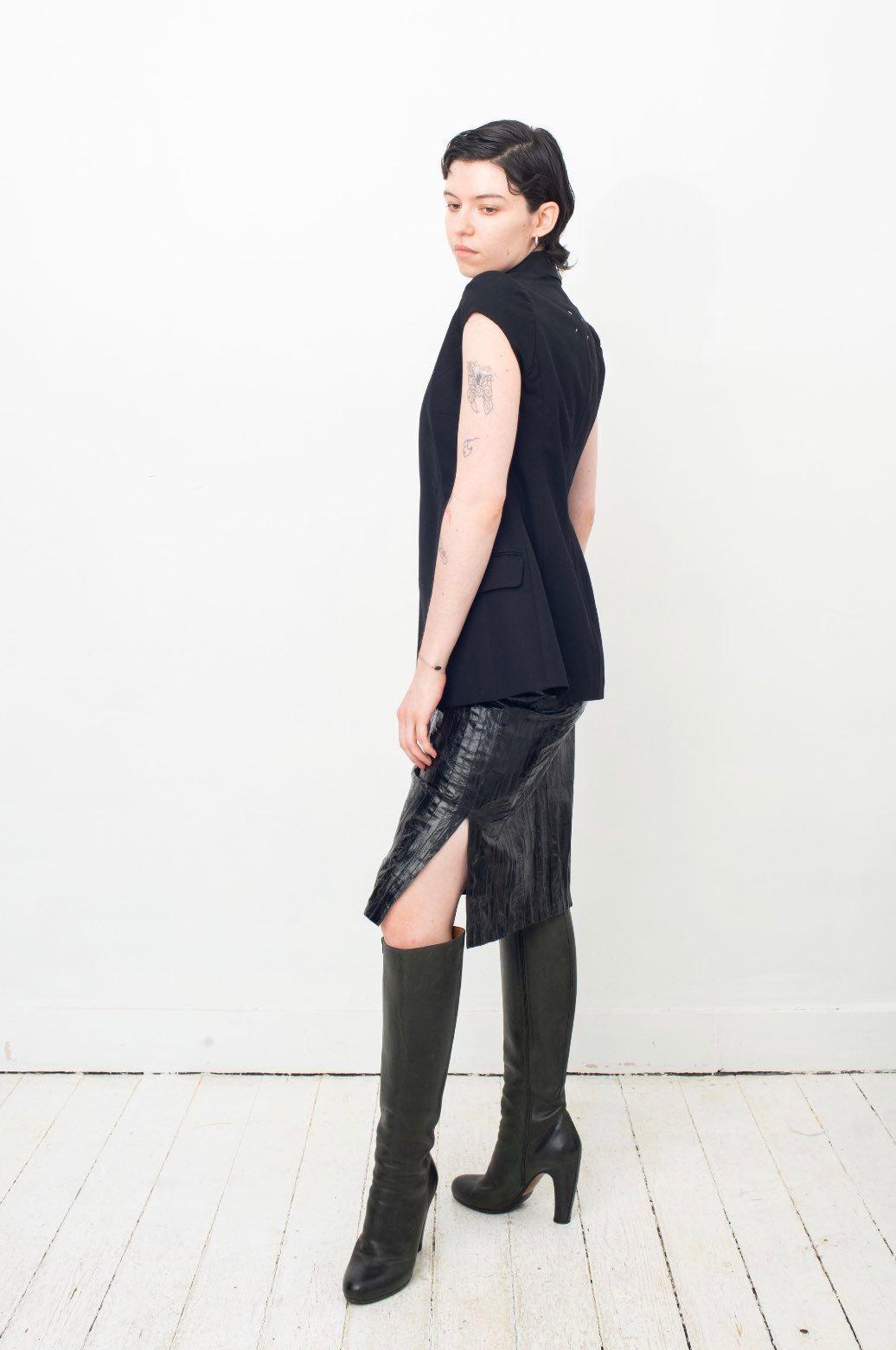 Here worn with Krizia black eel leather skirt and Margiela dark green leather boots, also available online.