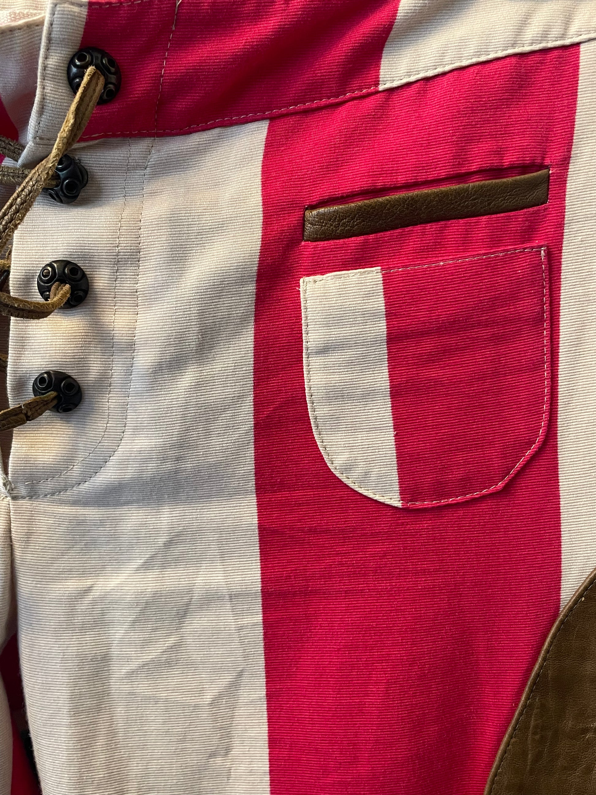 Composed of a patchwork of cotton and leather, she features two small overlapping pockets in the front, and closes with crossed leather laces at the front.