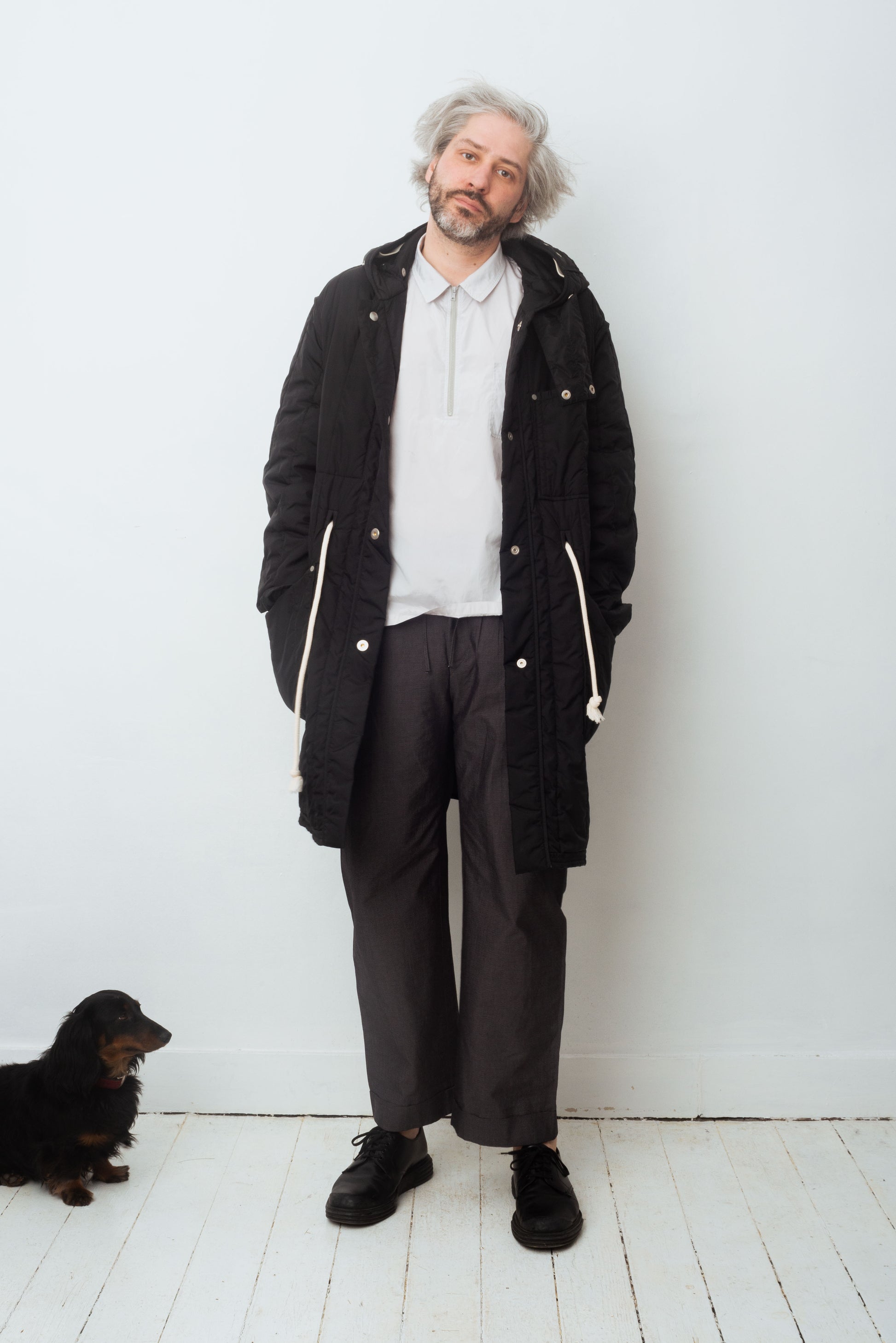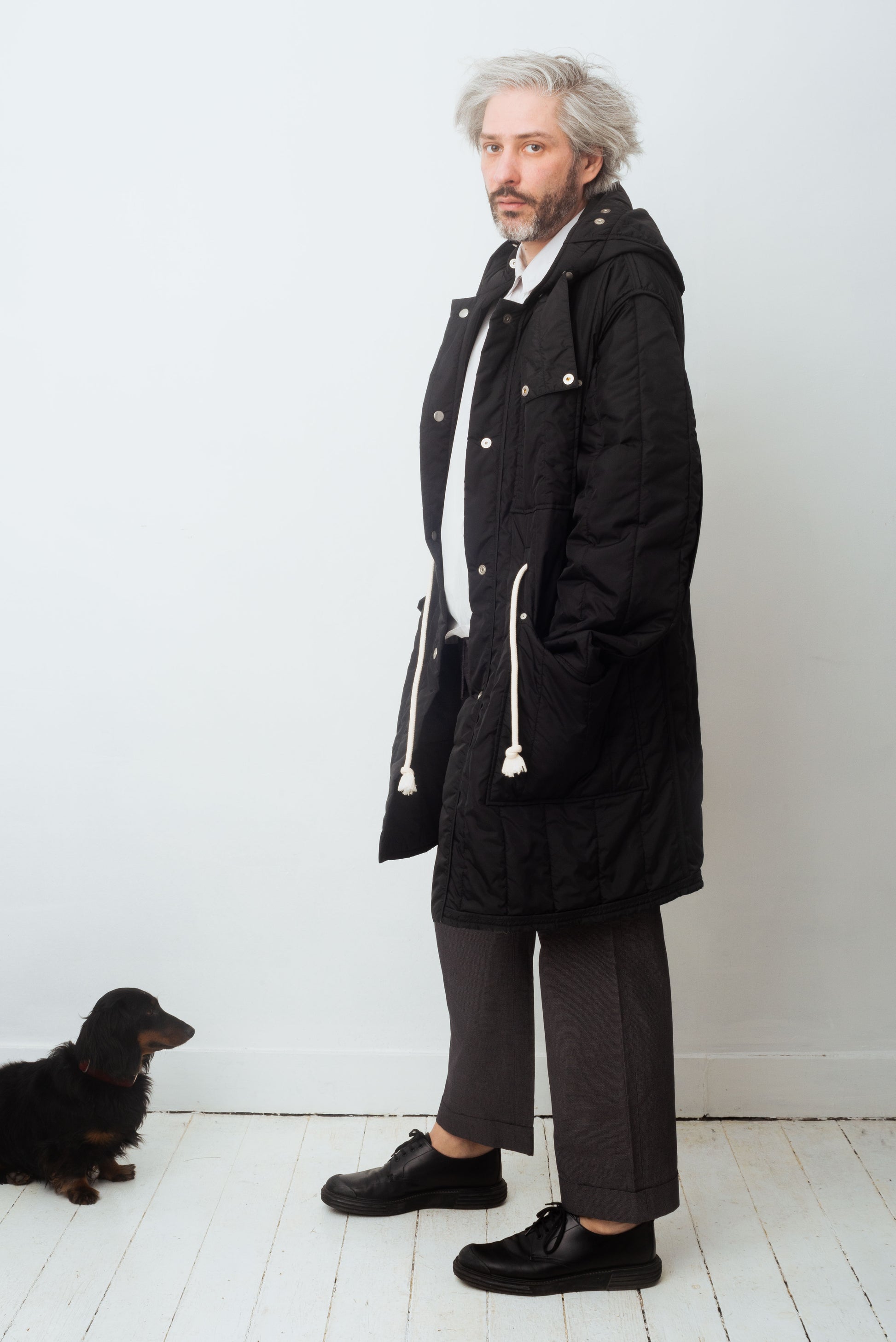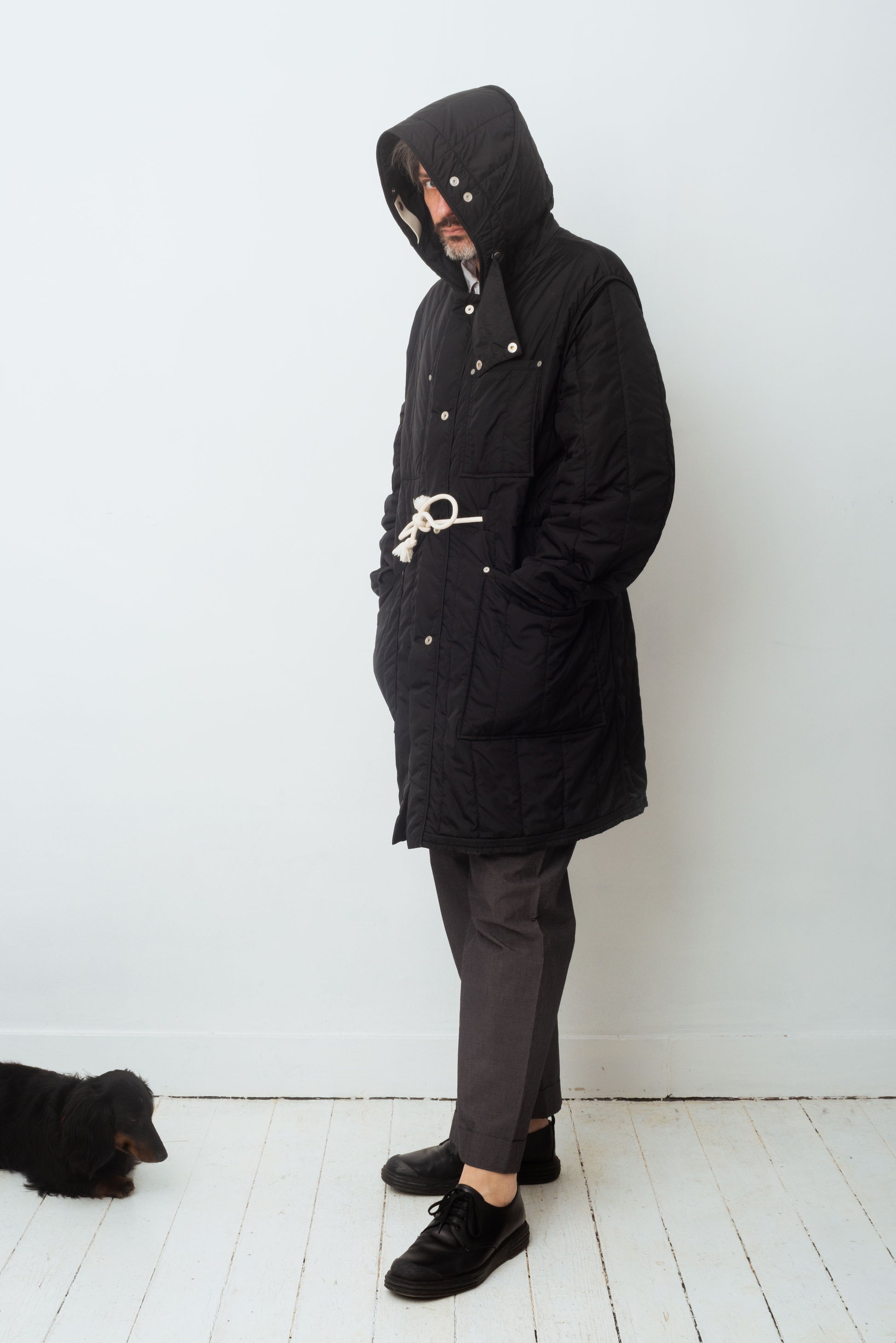 Two big side pockets are featured as well as a small one on the left chest and an interior pocket. The hood can easily be detached from the coat with snap buttons and a big white drawstring crosses the waistline allowing or a more fitted silhouette. The coat closes in front with a classic line of snap buttons, which are however reversely stitched, giving another twist to the fit.