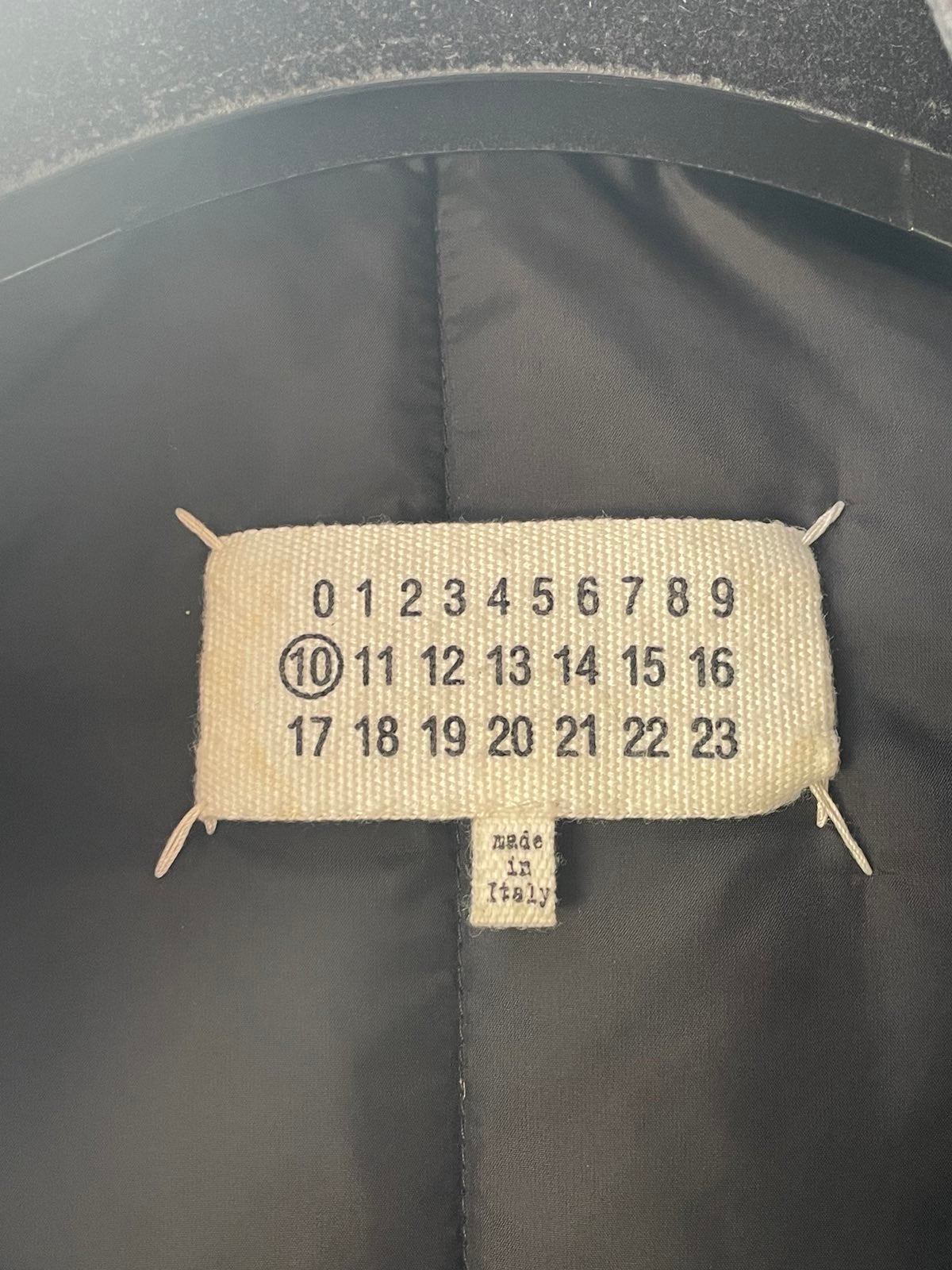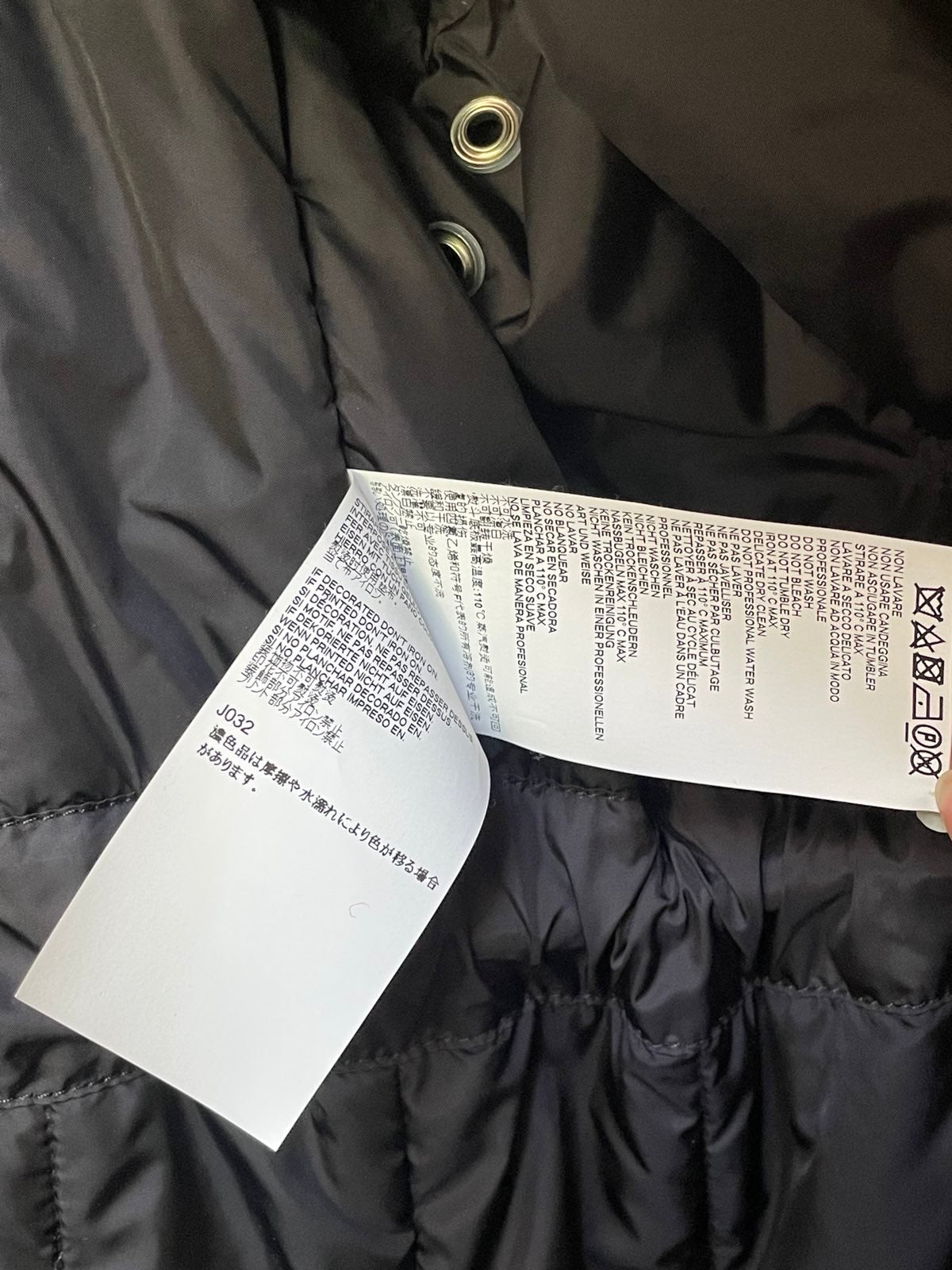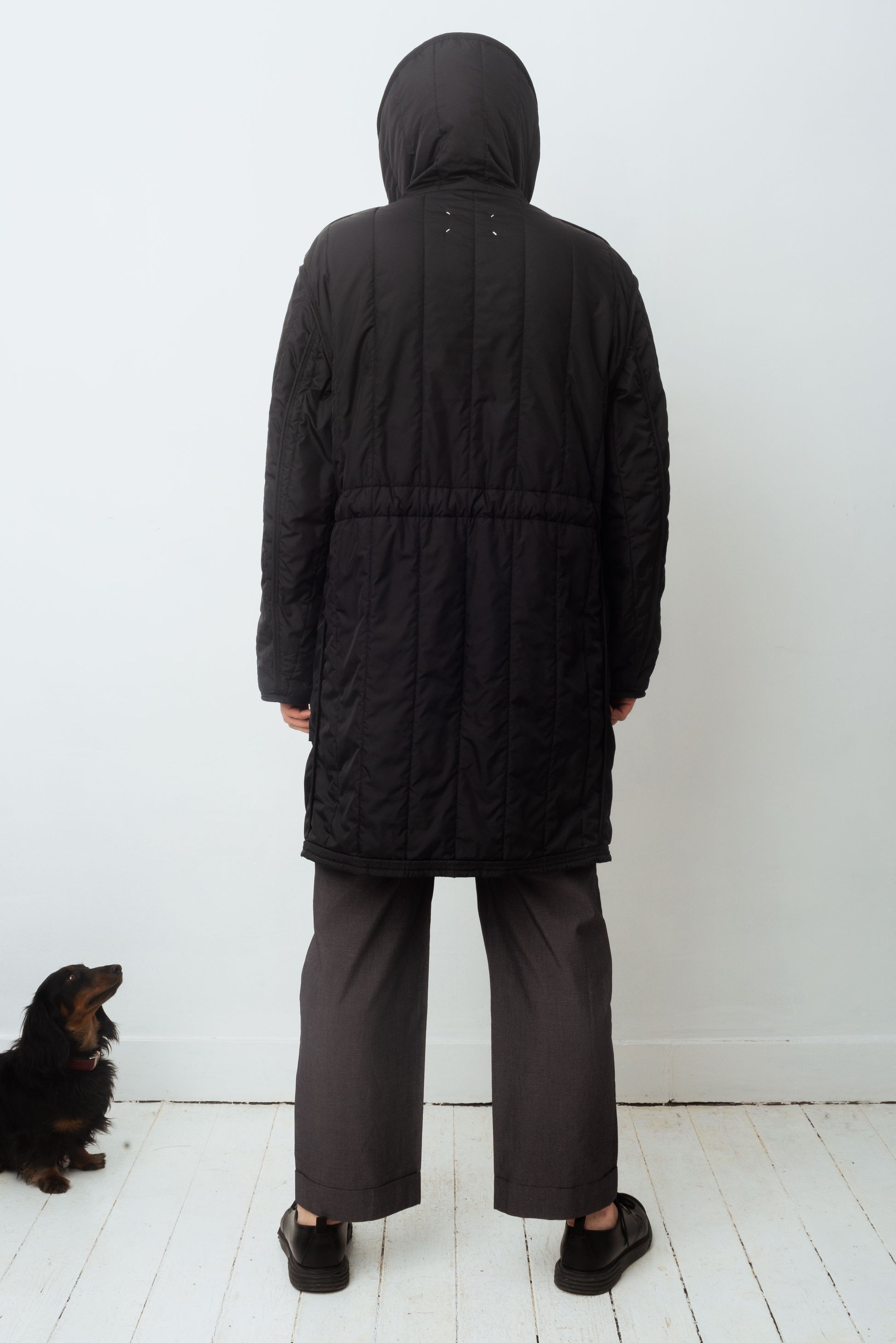 Two big side pockets are featured as well as a small one on the left chest and an interior pocket. The hood can easily be detached from the coat with snap buttons and a big white drawstring crosses the waistline allowing or a more fitted silhouette. The coat closes in front with a classic line of snap buttons, which are however reversely stitched, giving another twist to the fit.