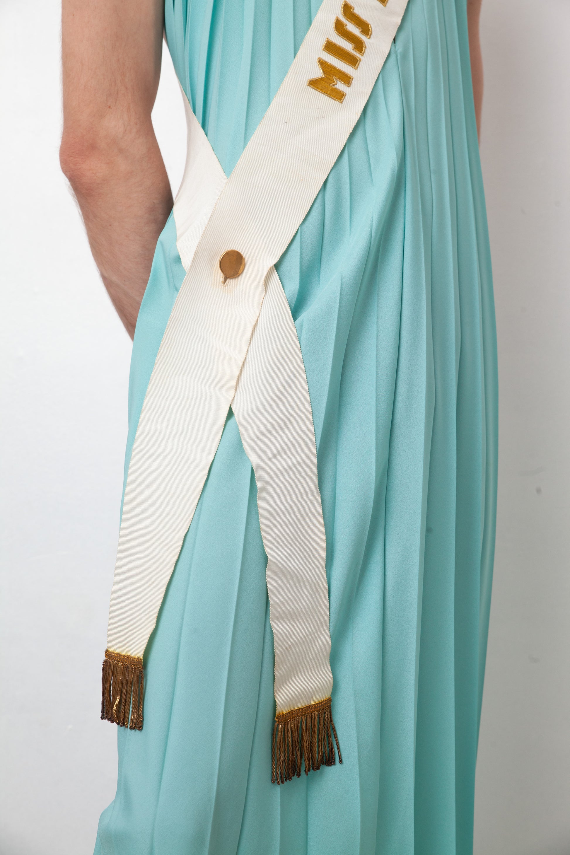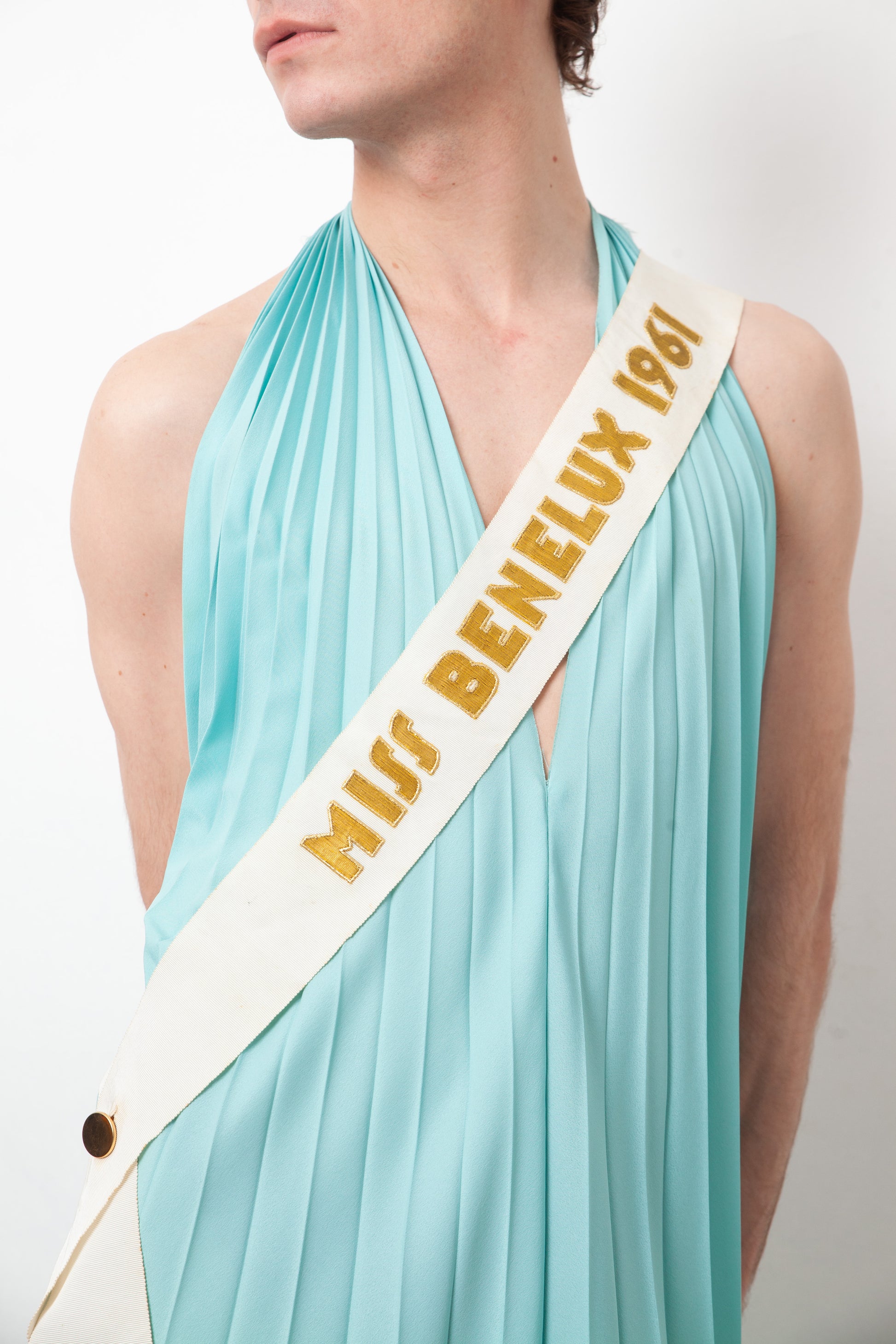 A vintage gem: this Miss Benelux (Belgium - Netherlands - Luxemburg) 1961 pageant sash in golden embroidered letters on white cotton ribbed fabric, worn from shoulder to hip. The sash closes on the hip with a golden double button and is finished with fringes at the bottom.