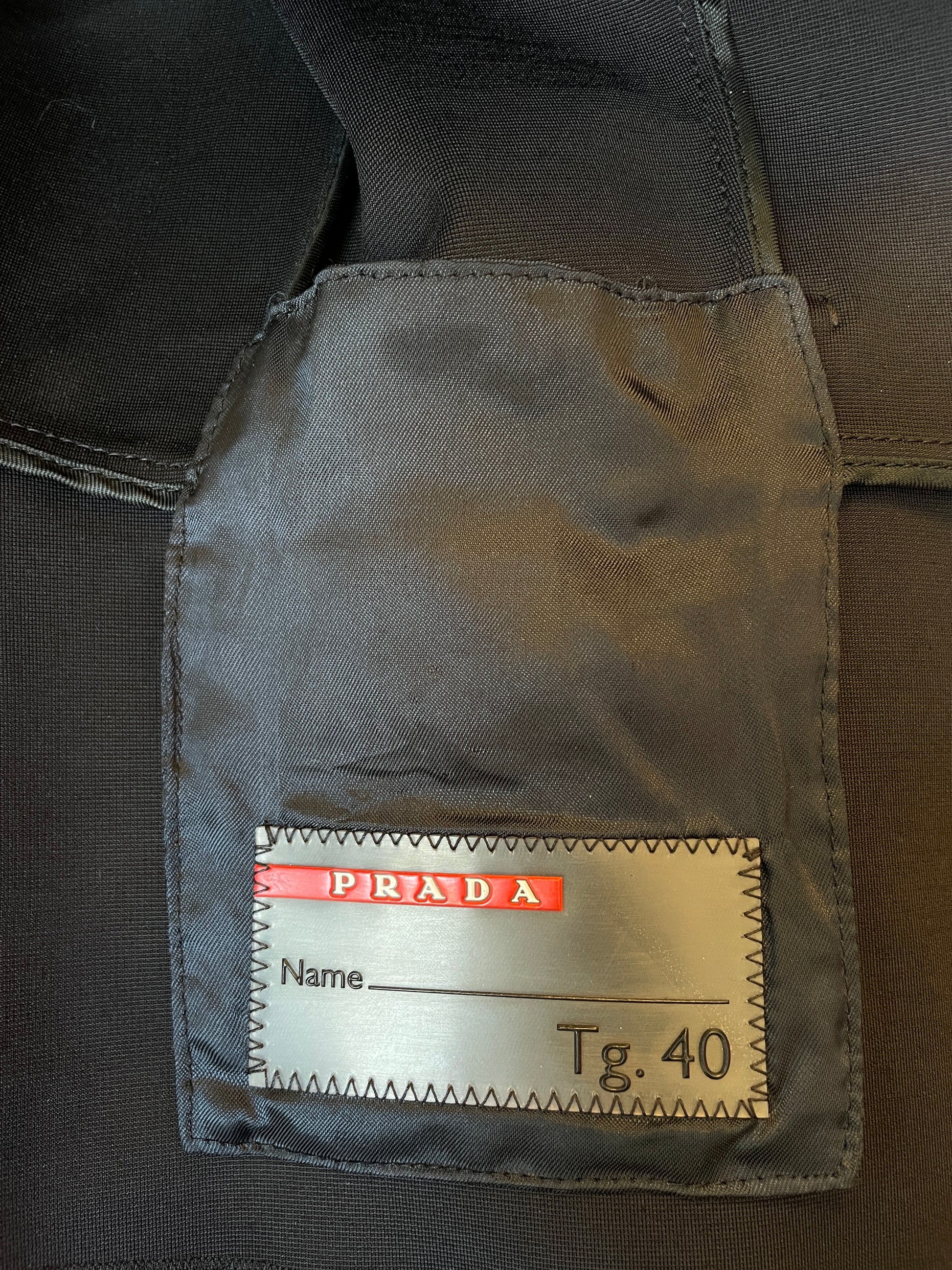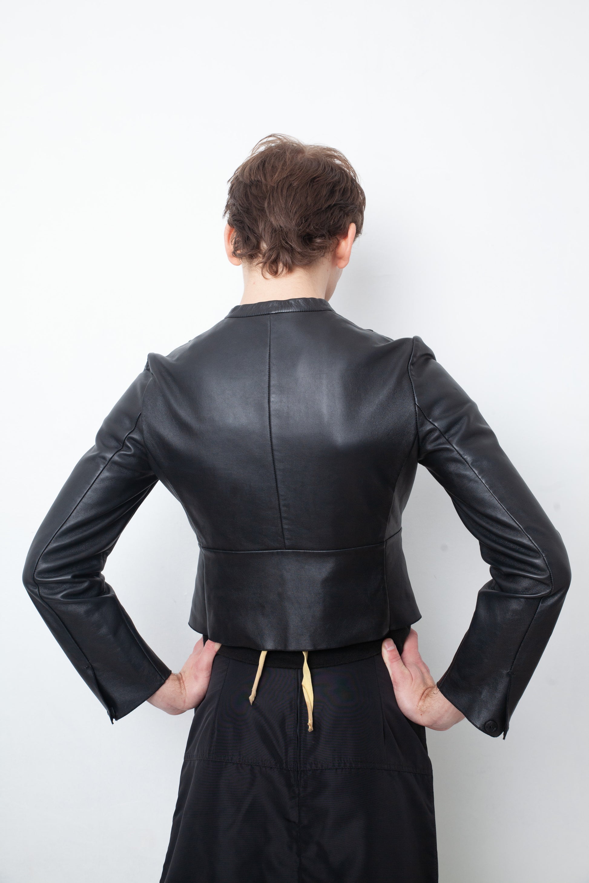 Very sexy fitted leather jacket from Prada's linea rossa line from 2009 in an incredibly soft, smooth and thin leather. The jacket is cropped and fitted at the waist, with a short upright mao collar. It closes in the front with a asymmetric line of snap buttons. On the bottom right of the jacket, a small zip pocket. The jacket is fully lined in viscose, giving her a stretchy nature.