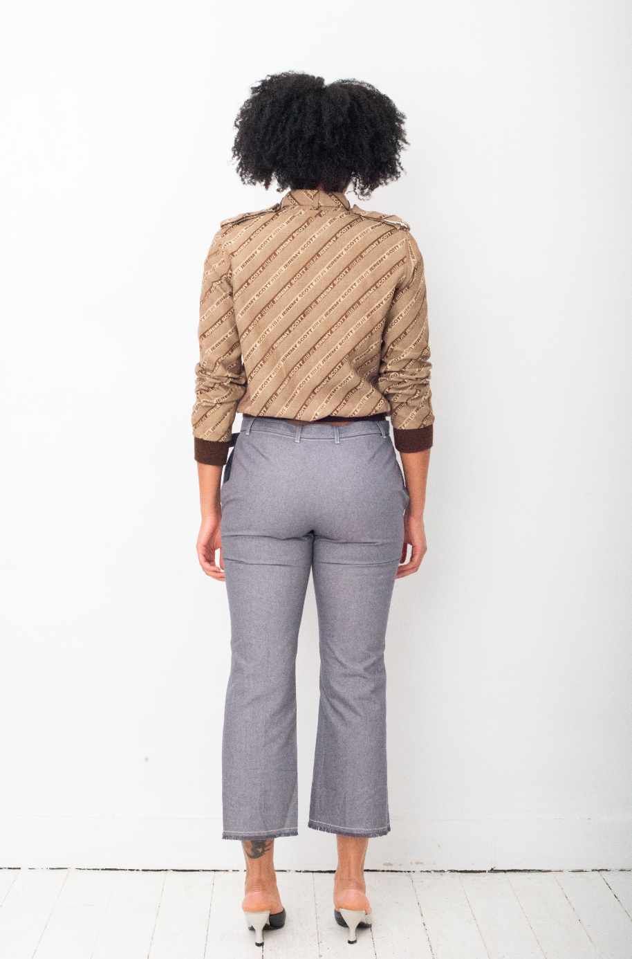 The capri fit is one of the most recognizable silhouettes of the 2000's, here twisted in a elegant way with the help of a simple belt and a purple toned denim fabric.