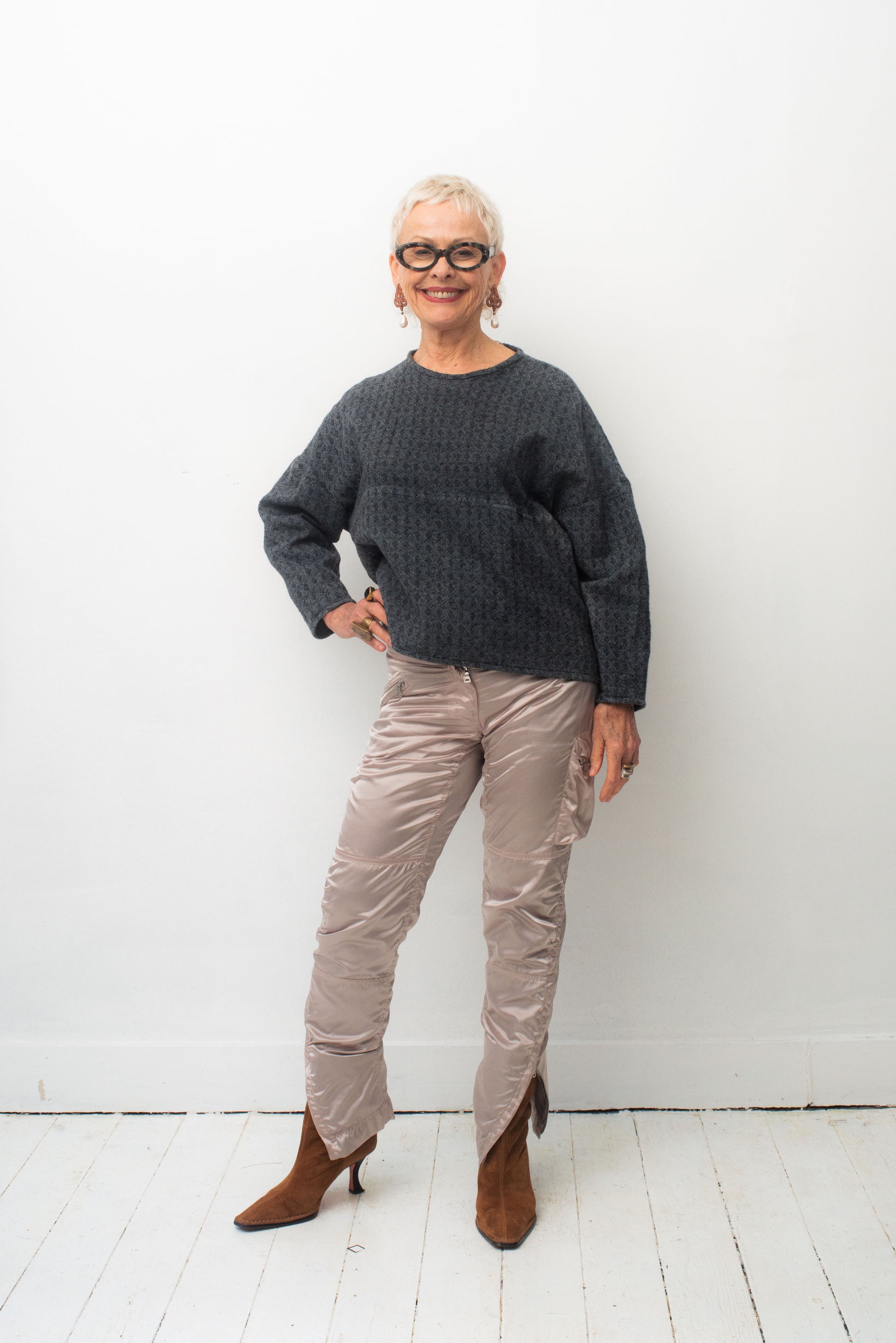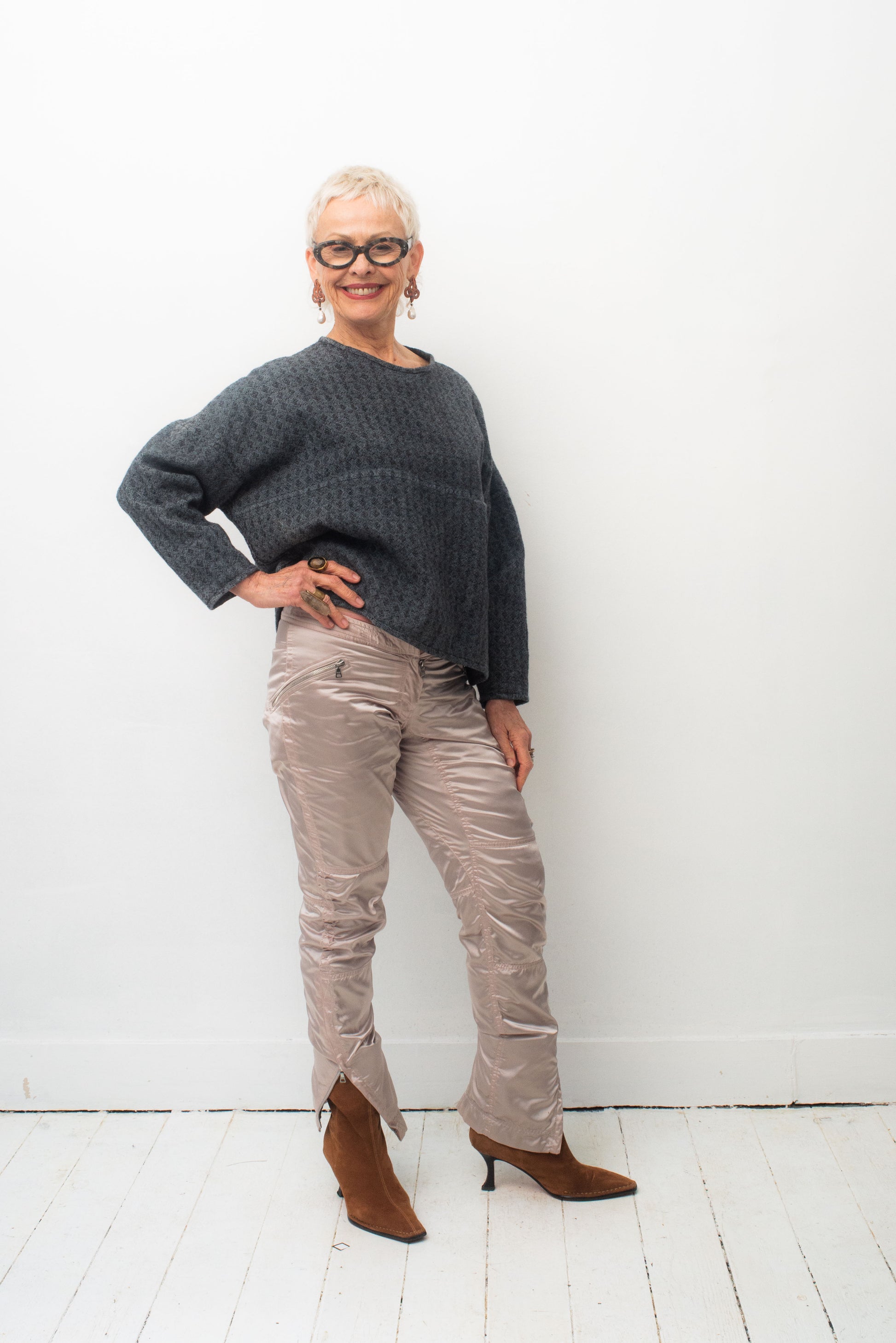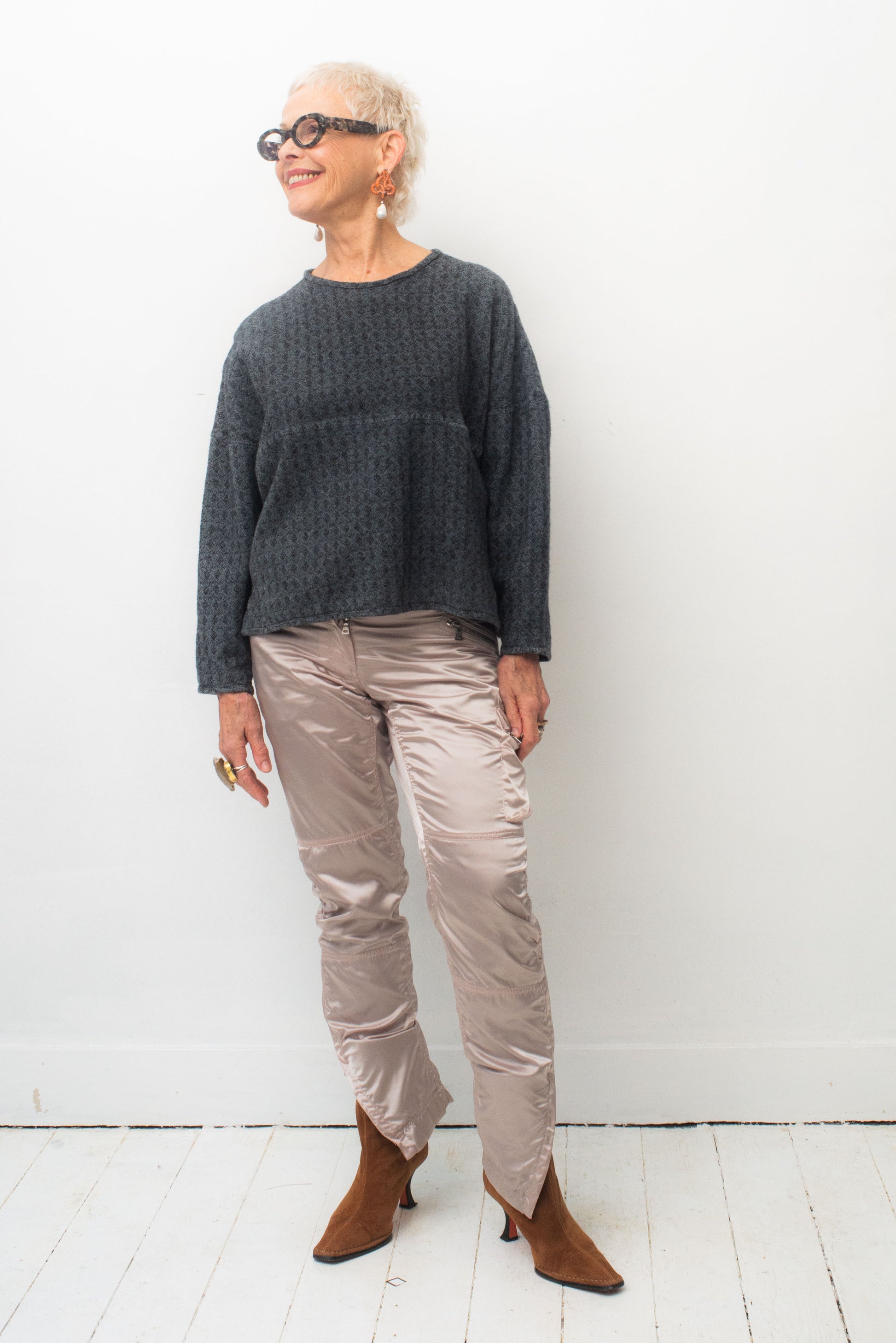 The bottom of the trousers also feature two zippers one can open to create high slits on the side.