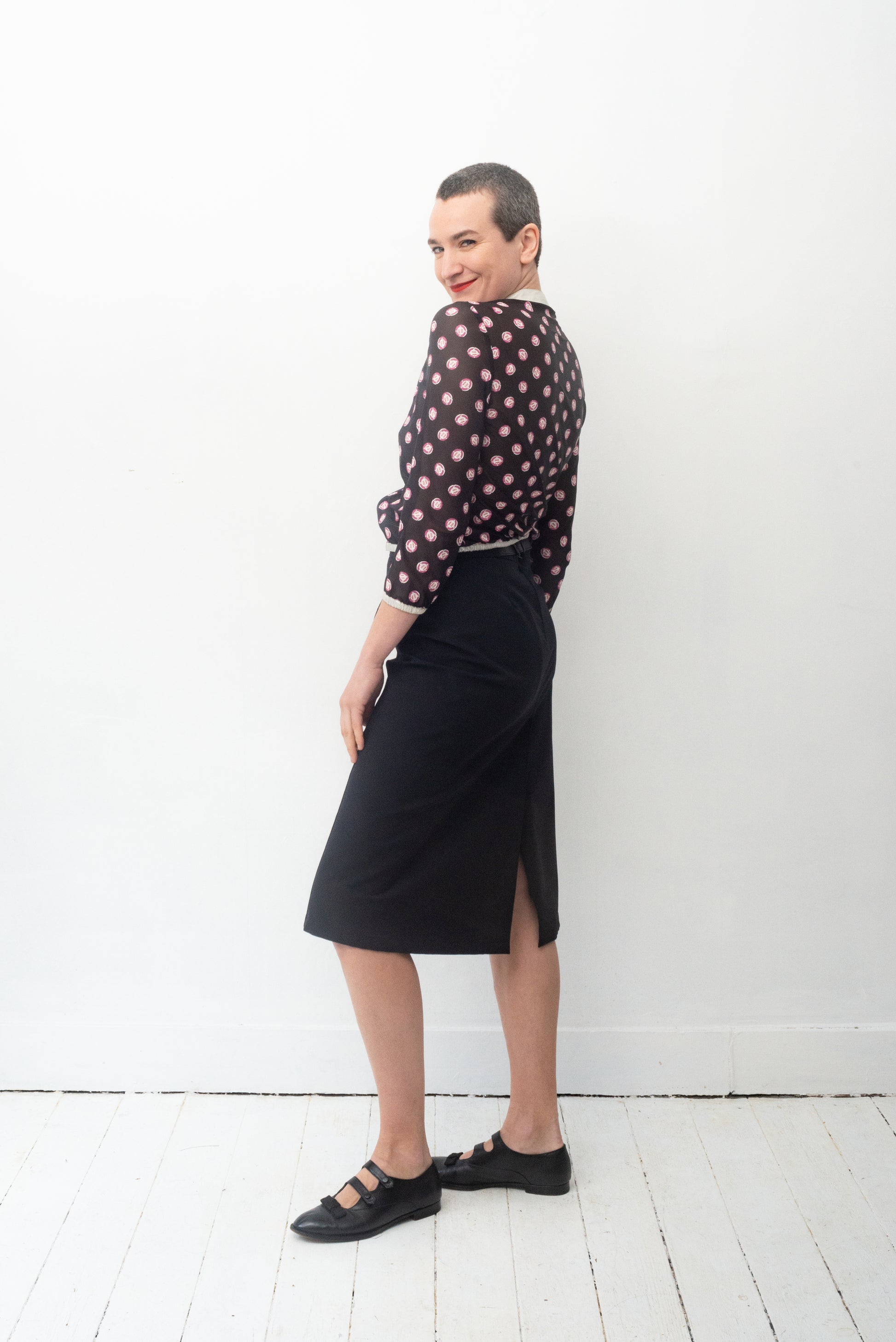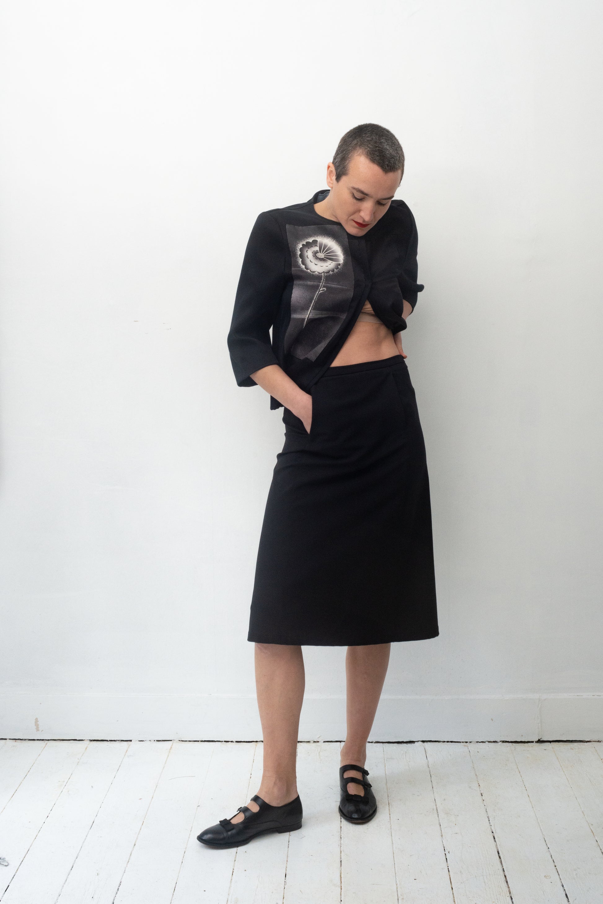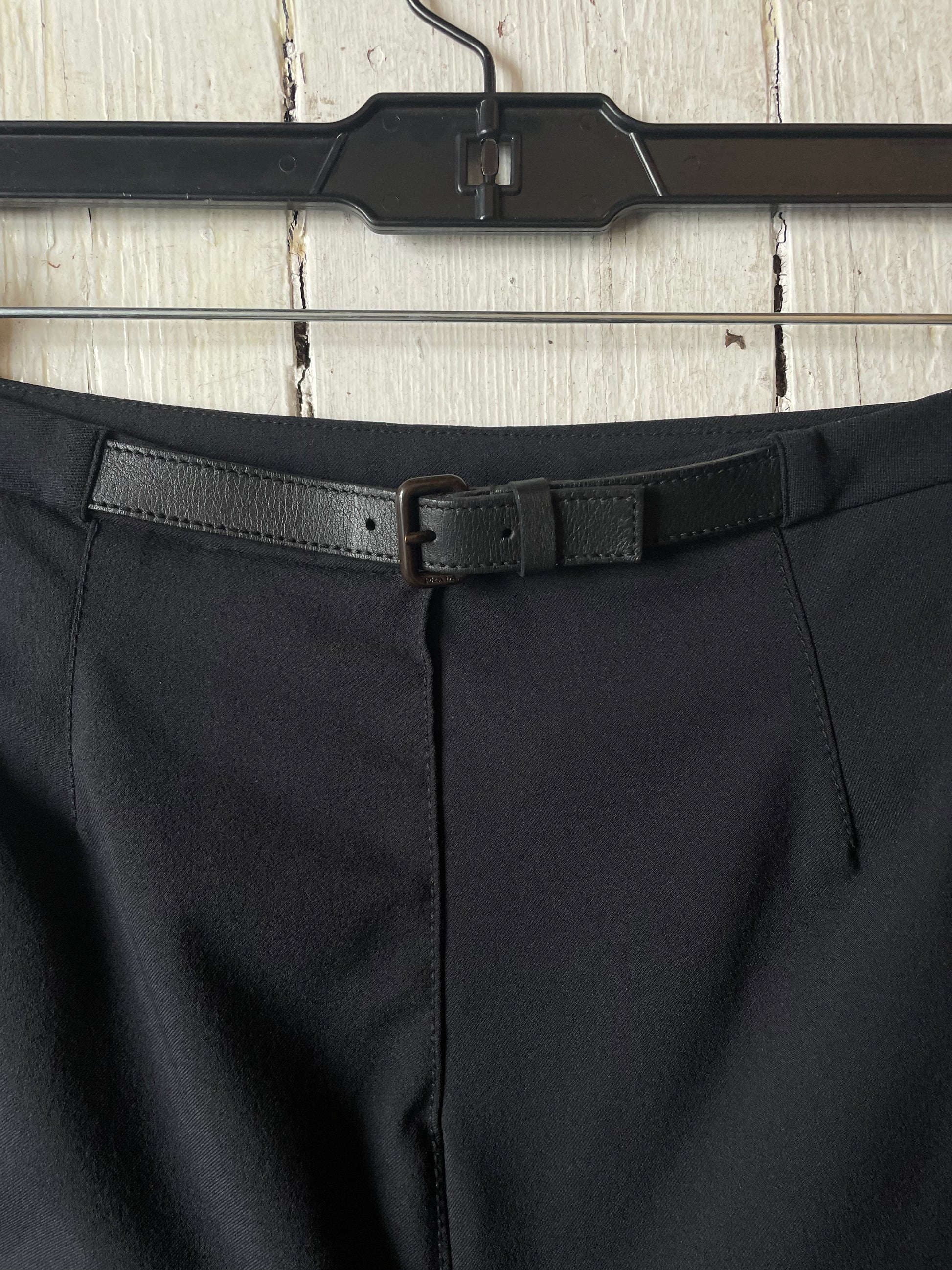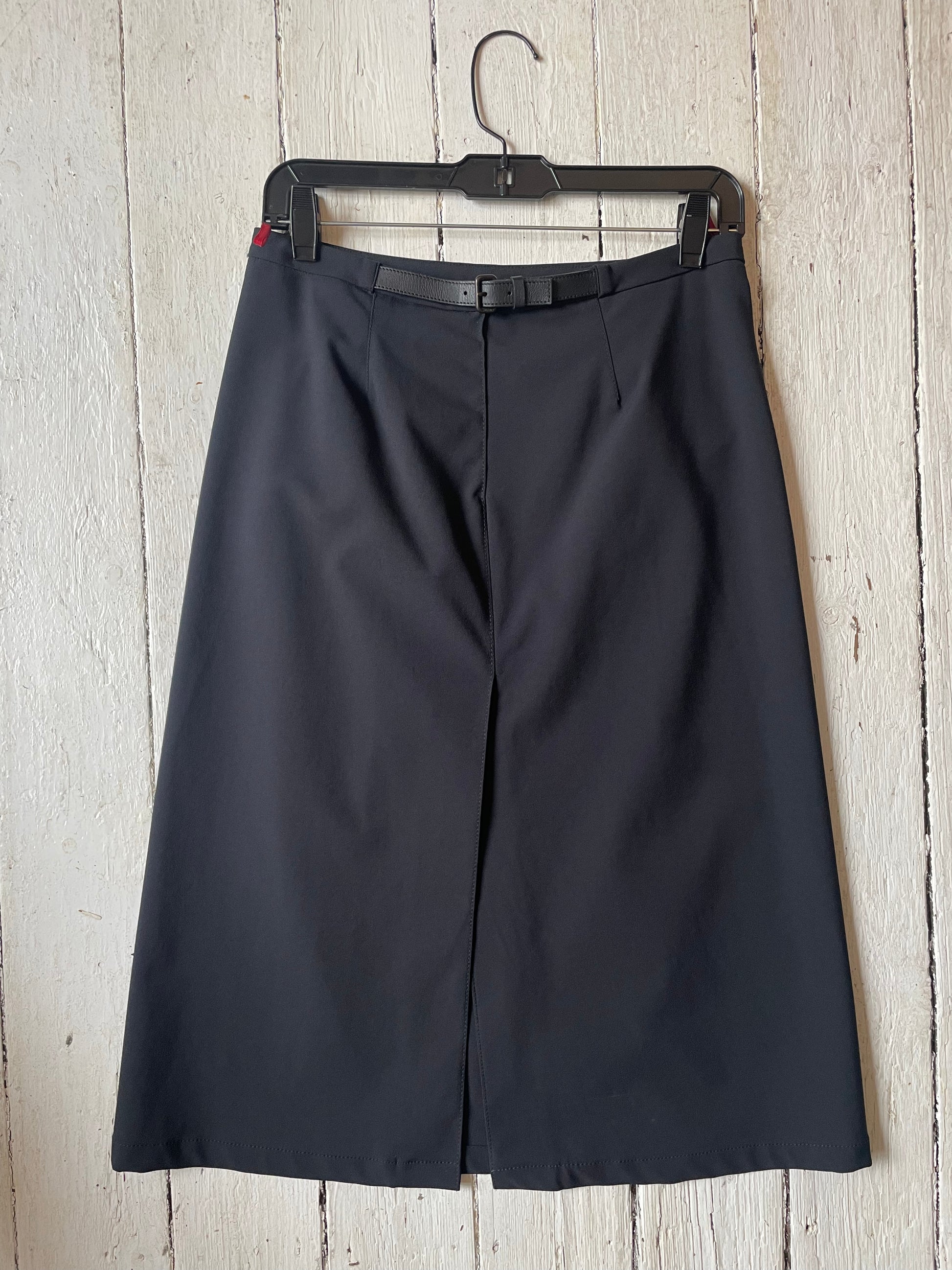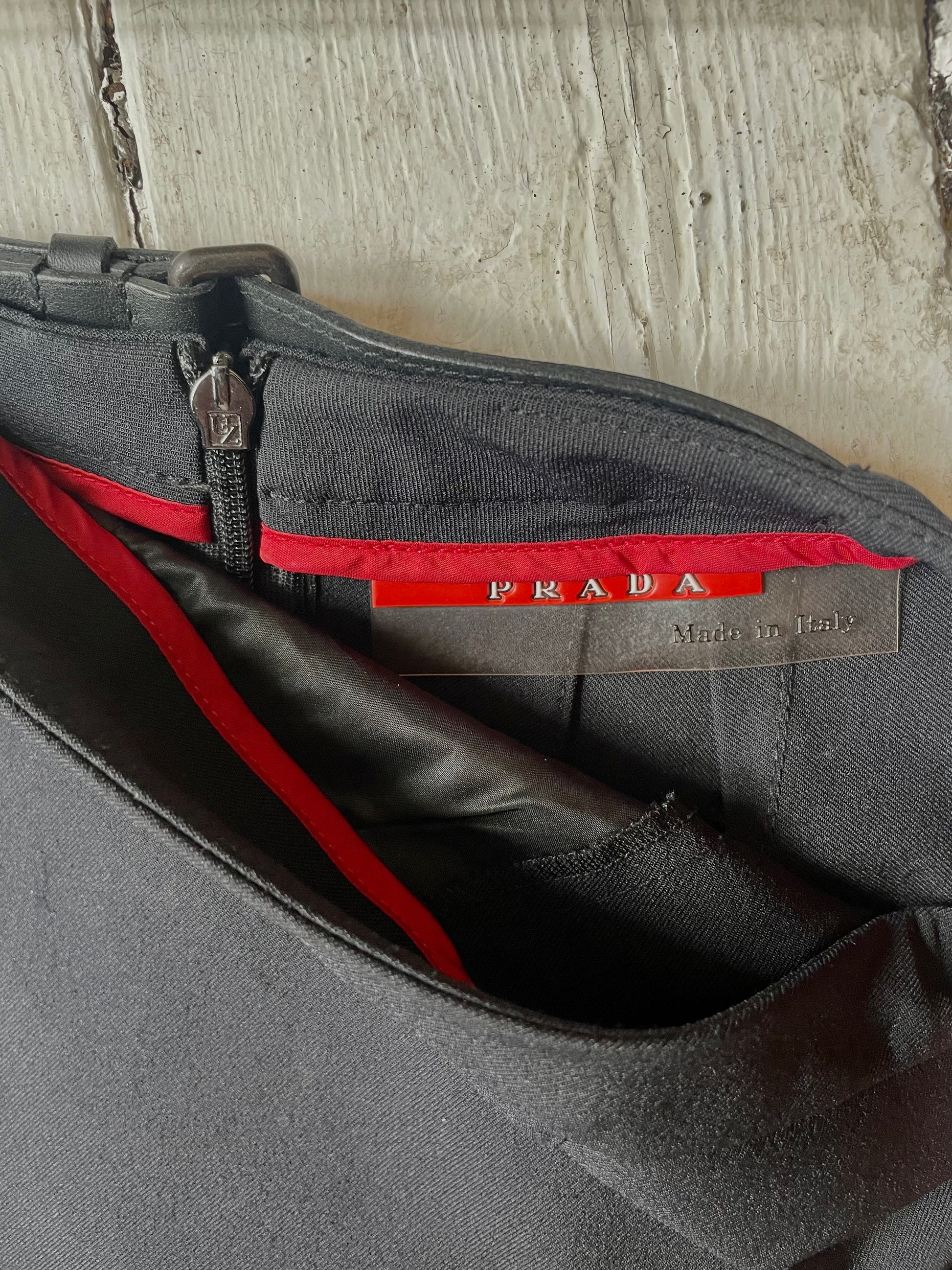 Prada 2000's black nylon midi skirt with velcro front pockets and leather belt detail