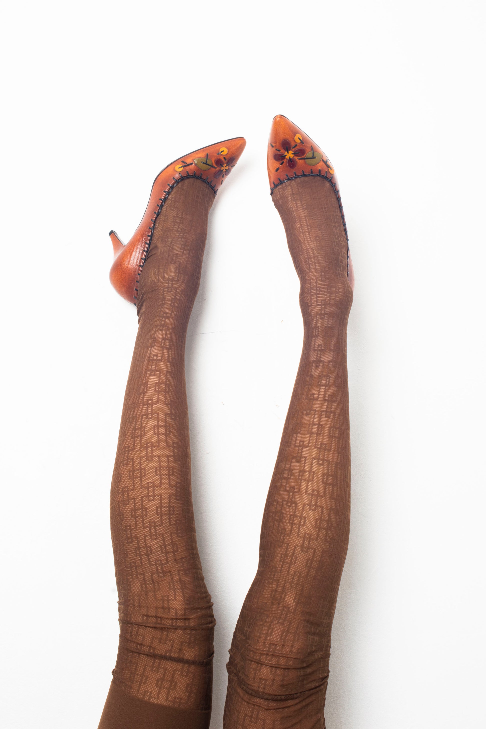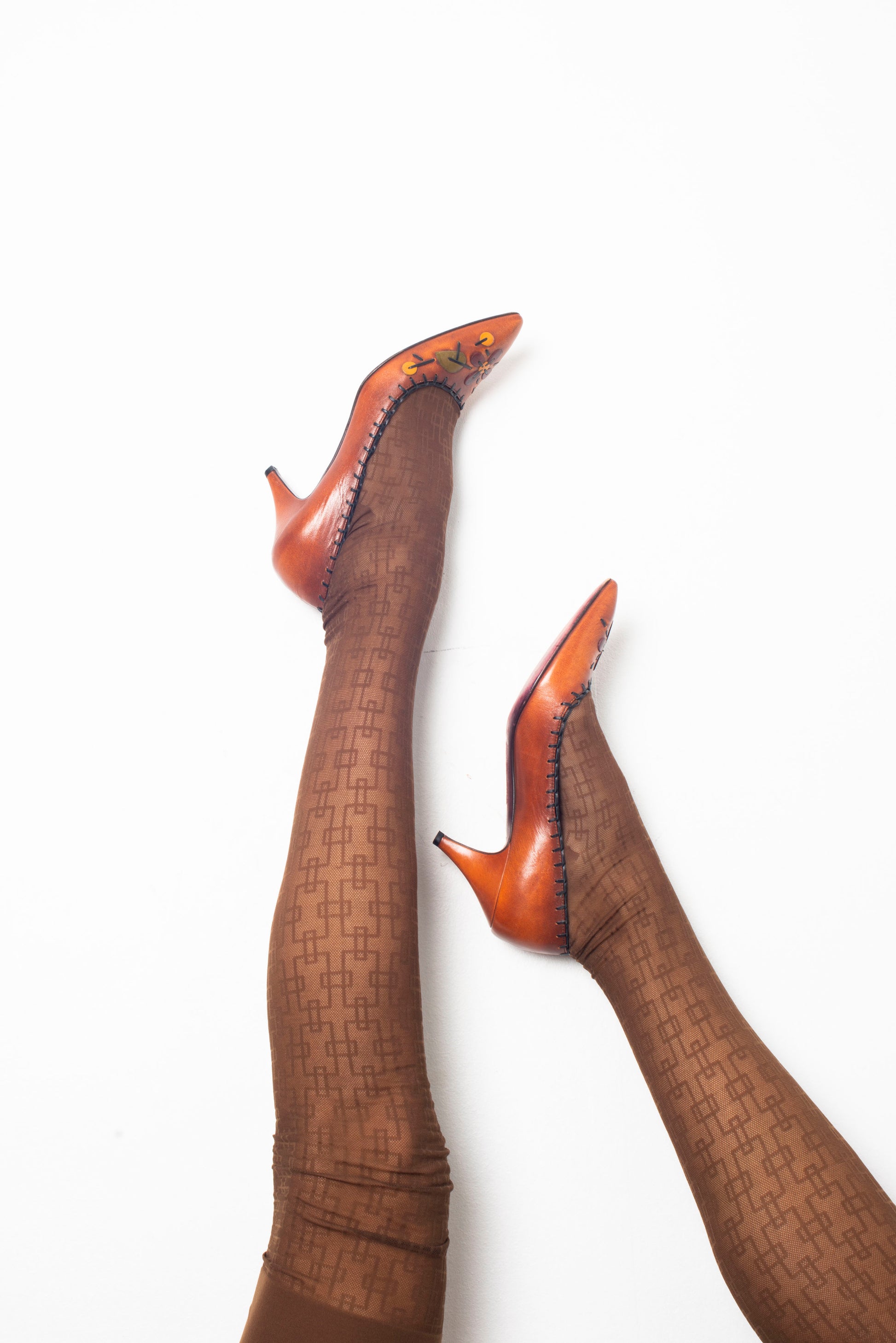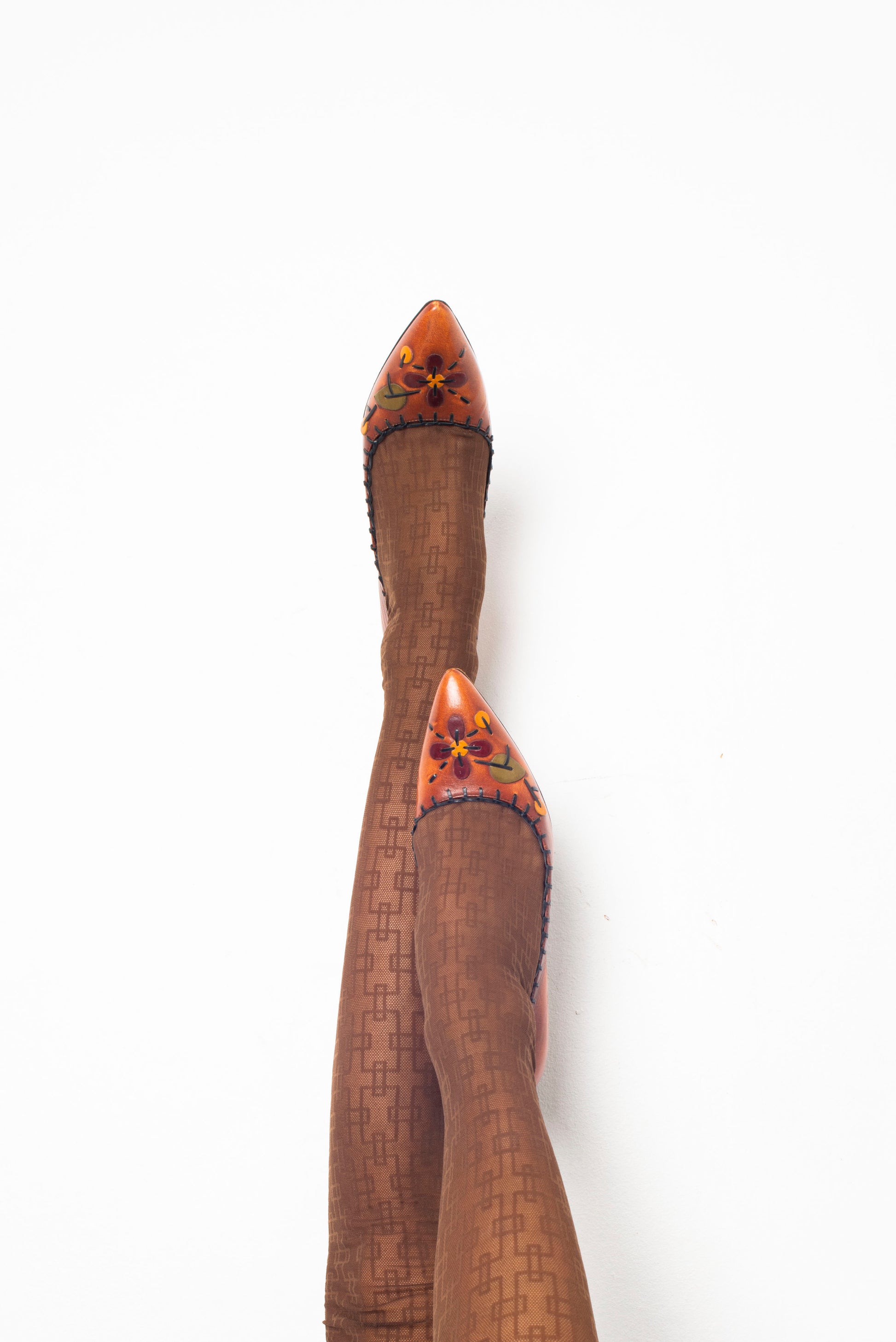 Fabulous brown/orange leather pointed toe Prada pumps with floral leather patched design and whipstitch detail all along opening. Burgundy soles and lined in fine black leather.