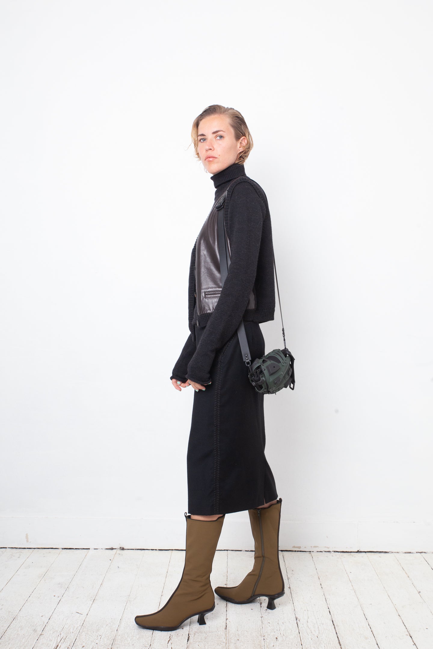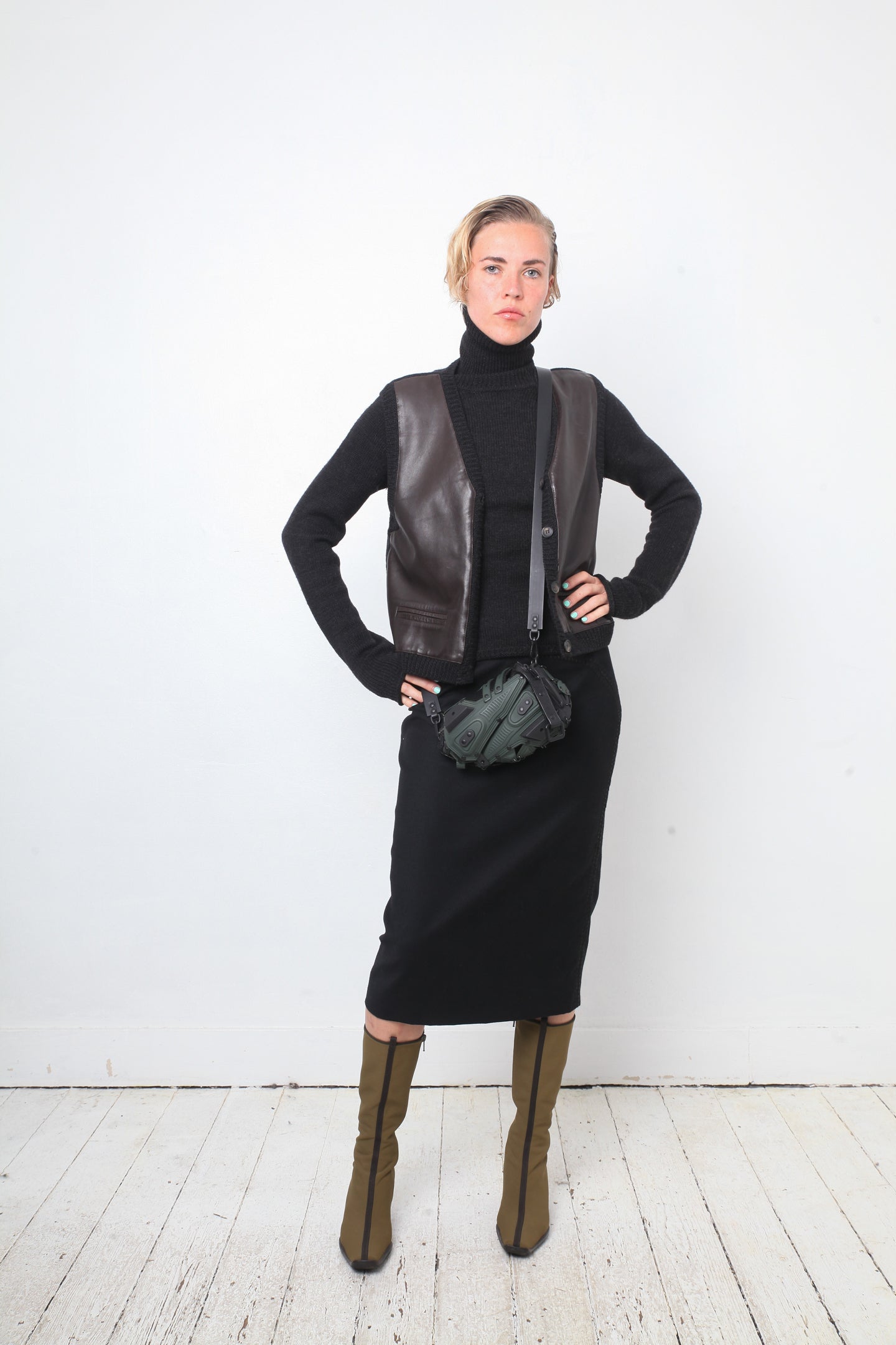 Here worn with a 2002 Alexander McQueen wool skirt and DKNY 90's wool and leather twinset, both available online