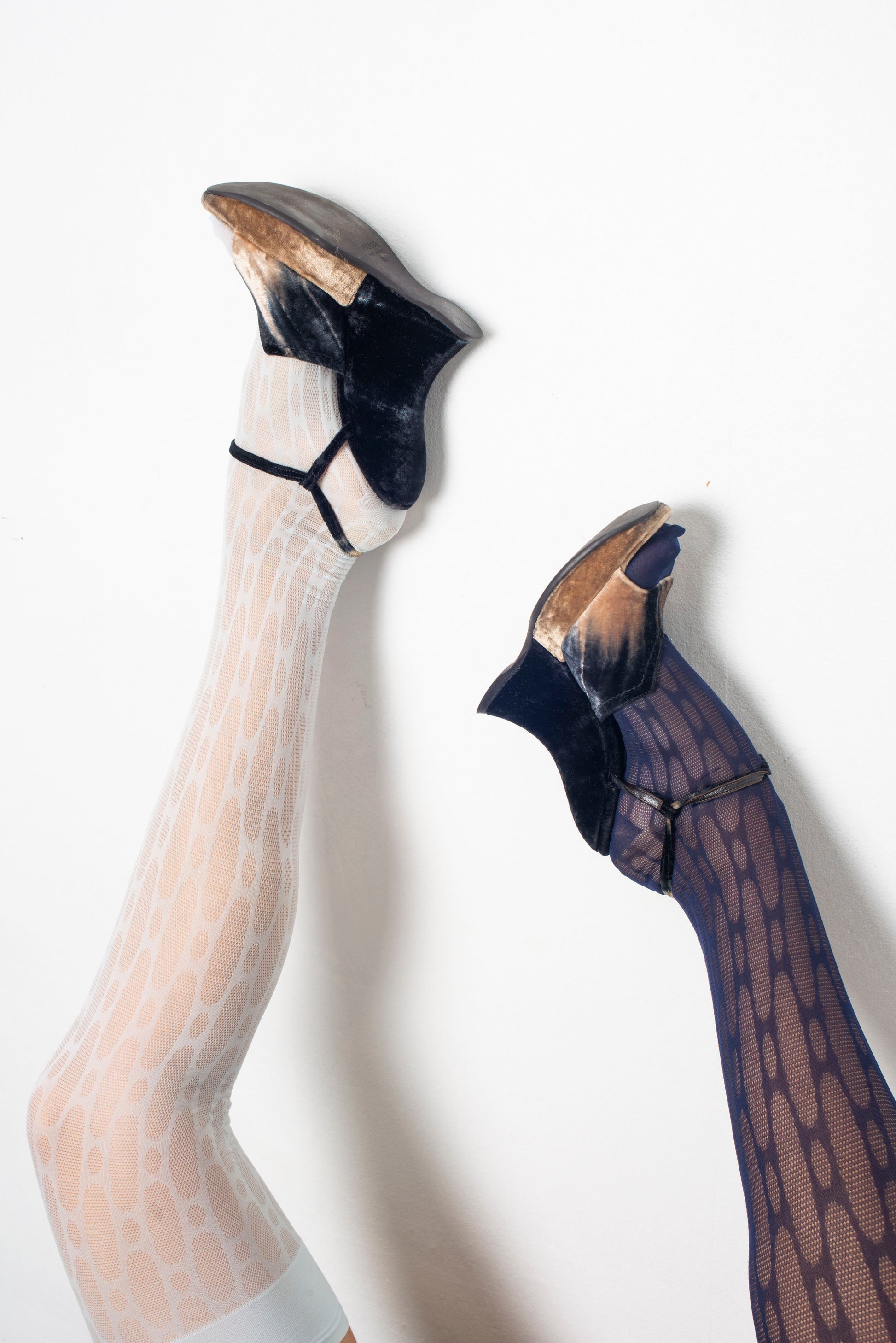 Made of this beautiful gradient beige and dark blue velvet, the shoe features a very unique arched heel which gives a burlesque aspect to the look.