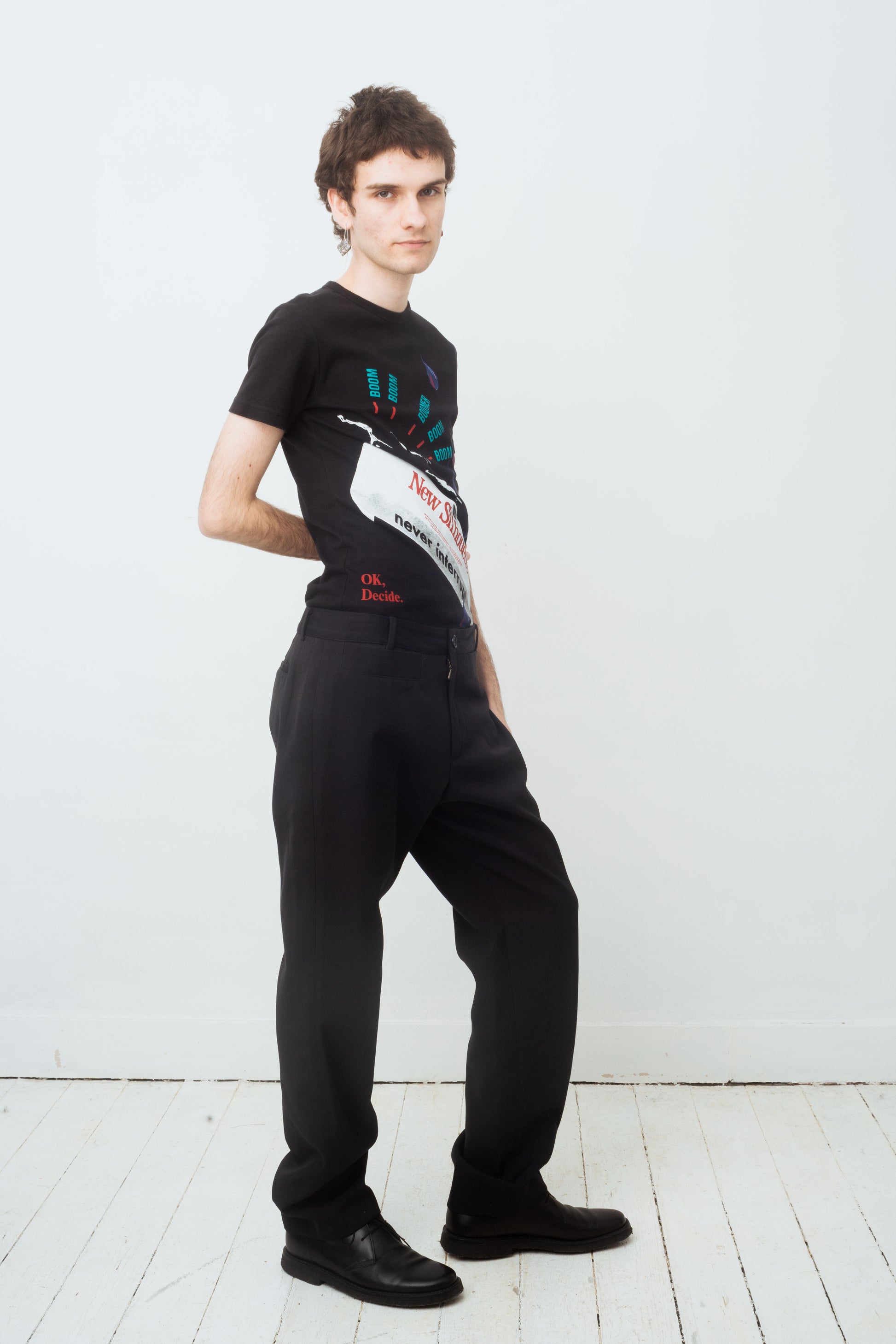 The print features slogans such as “New Silhouette”, “Artificial Intensity” and an ingredient list found on a 21st century hyper-processed chocolate bar.