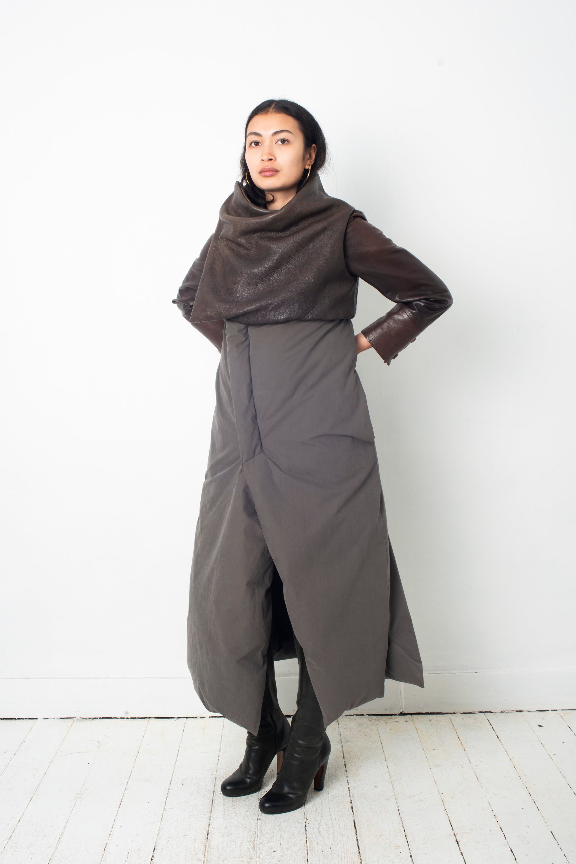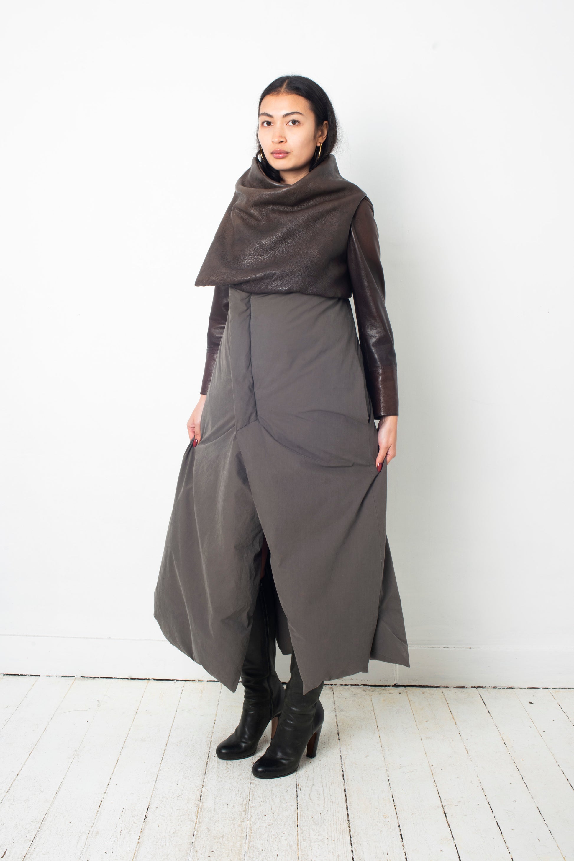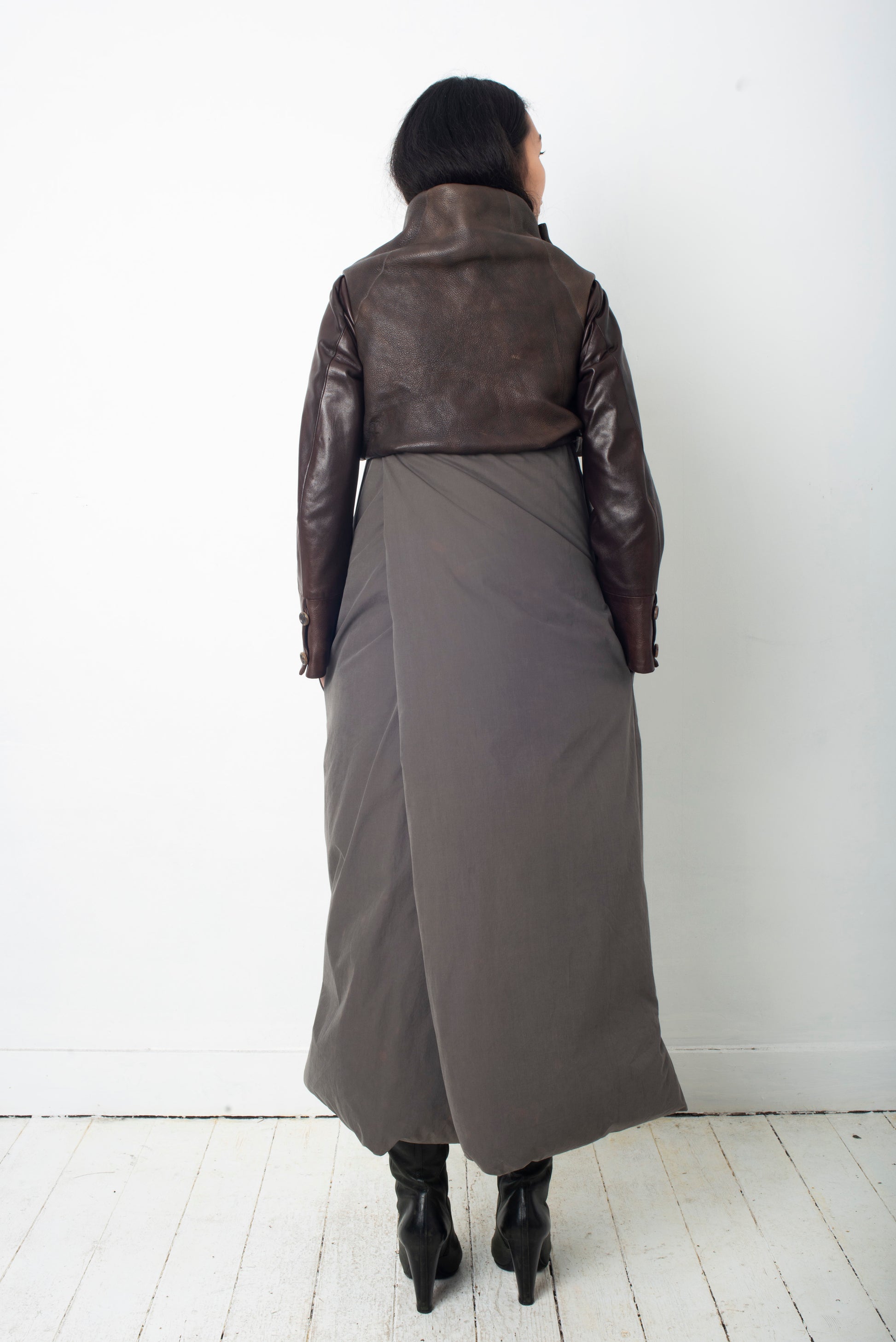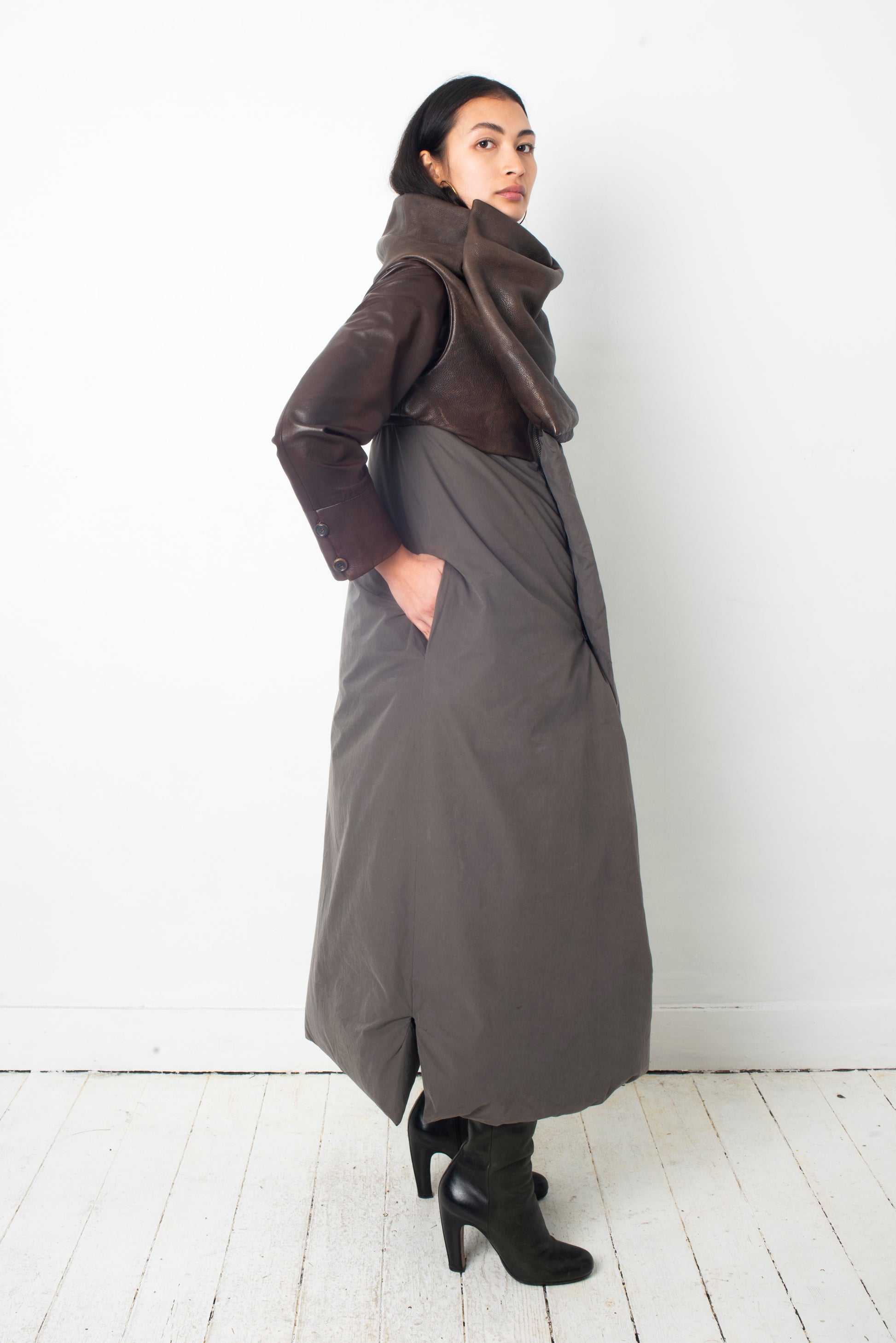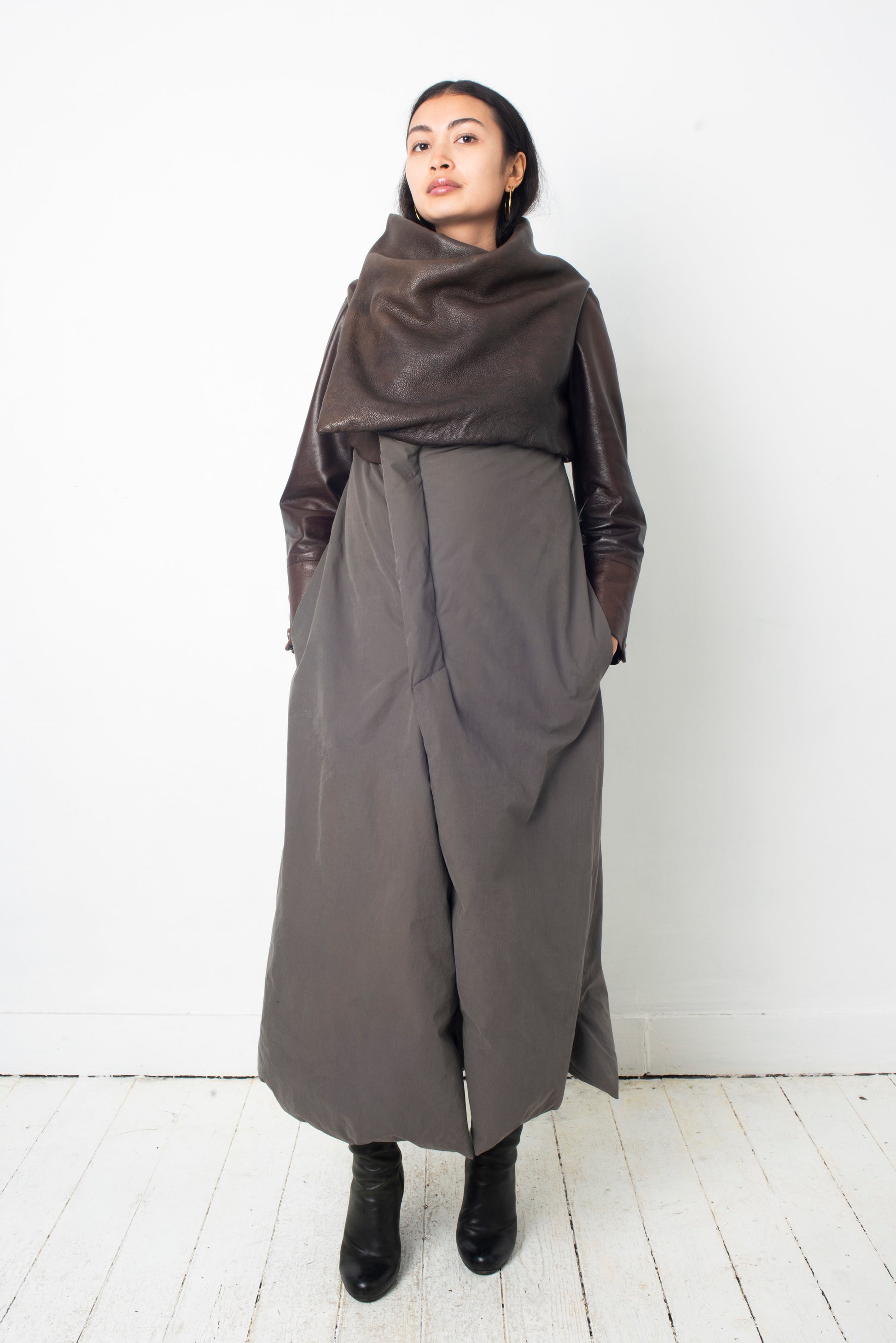 Rick Owens reimagines the puffer coat, this time sleeveless and with a large leather upper body piece / collar, that wraps around you like a blanket but with the toughness of a harness that will protect you, while keeping you warm and cozy.