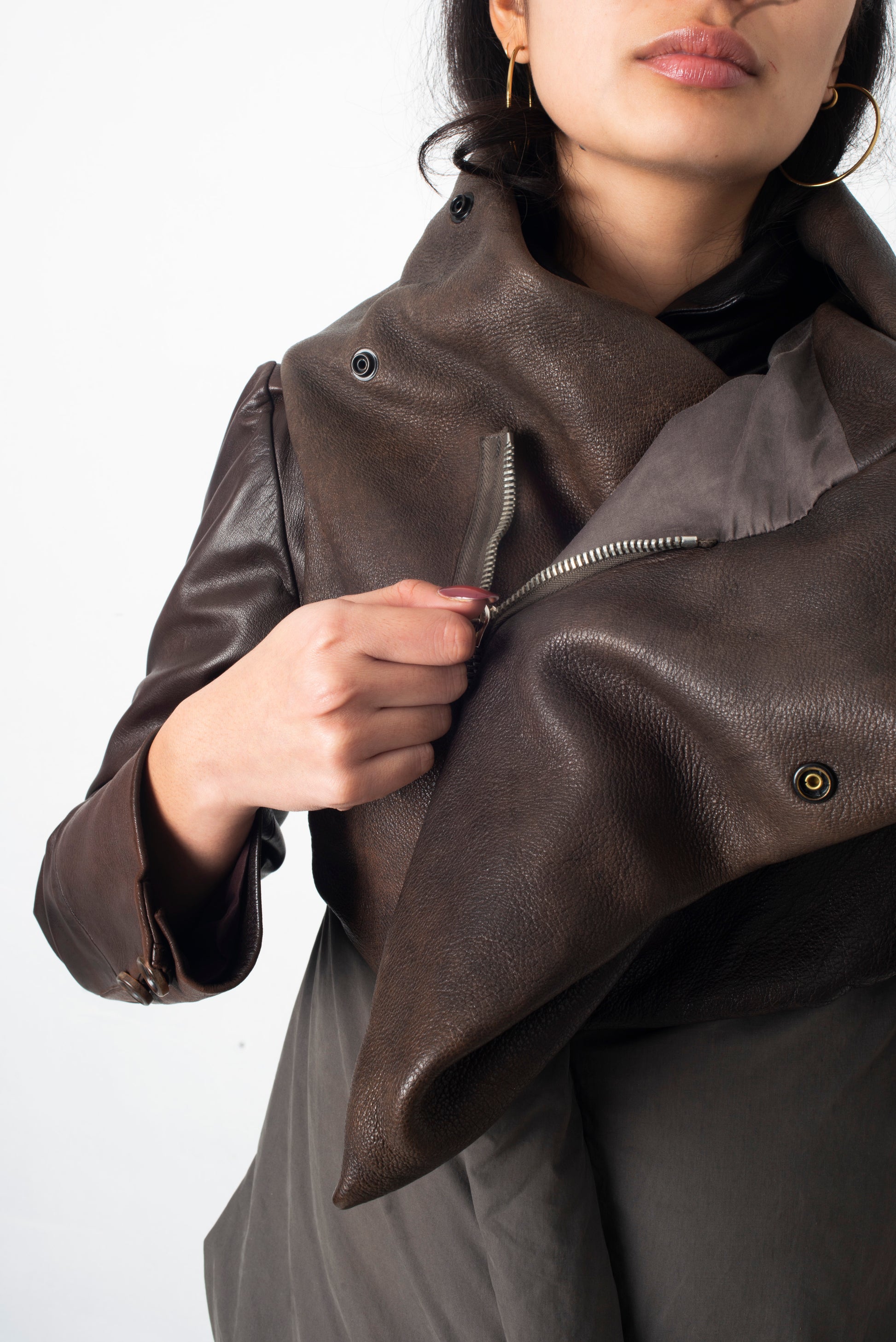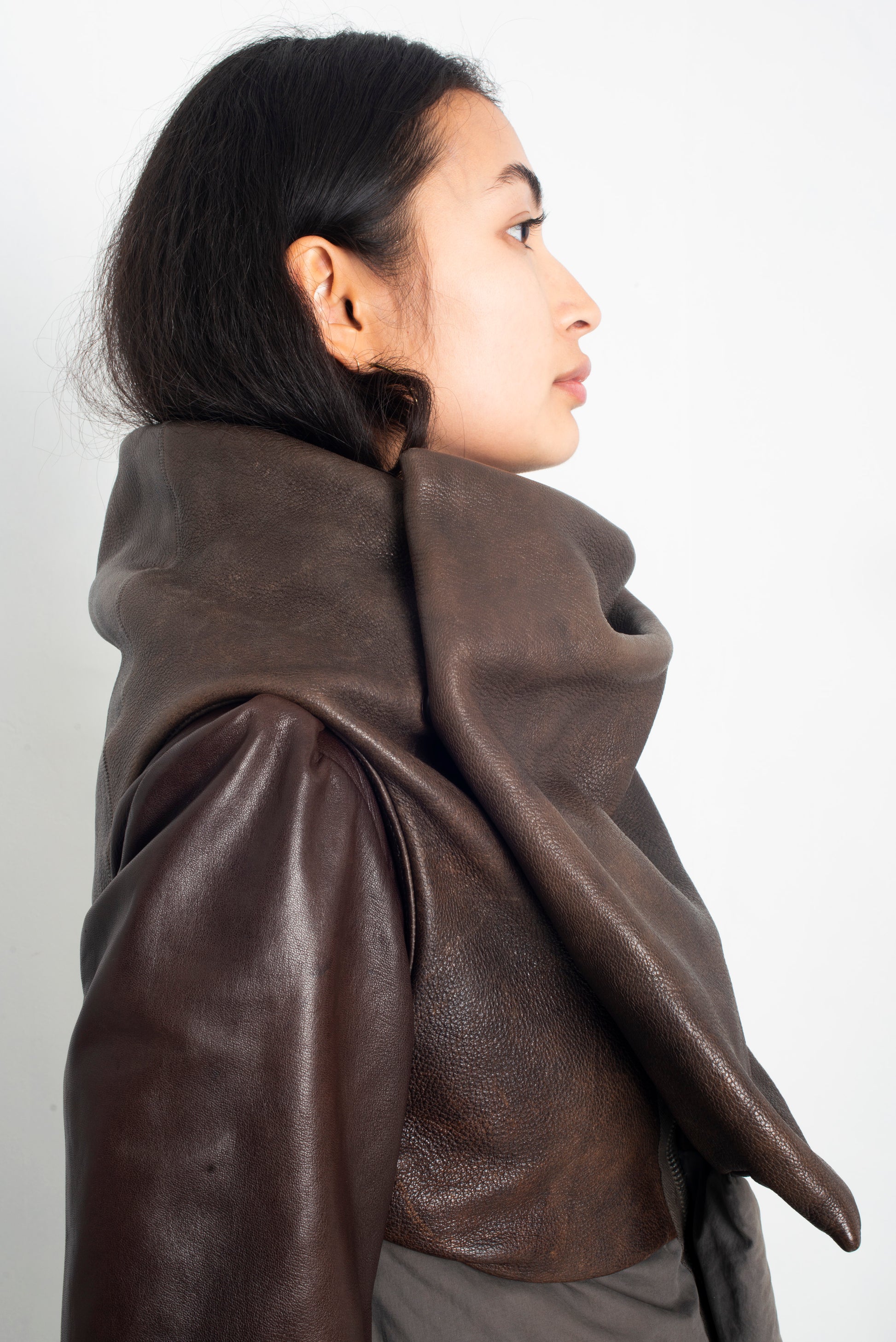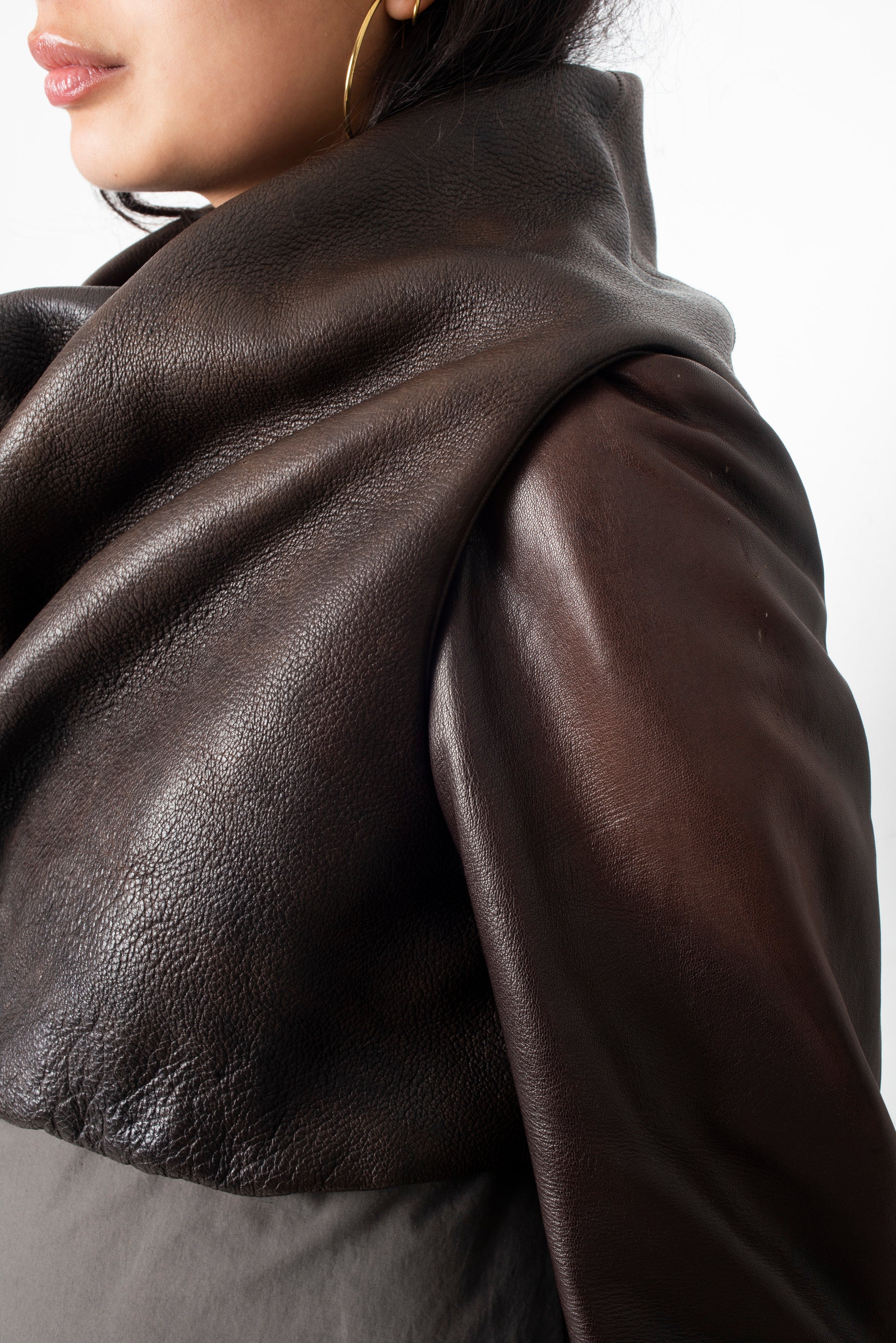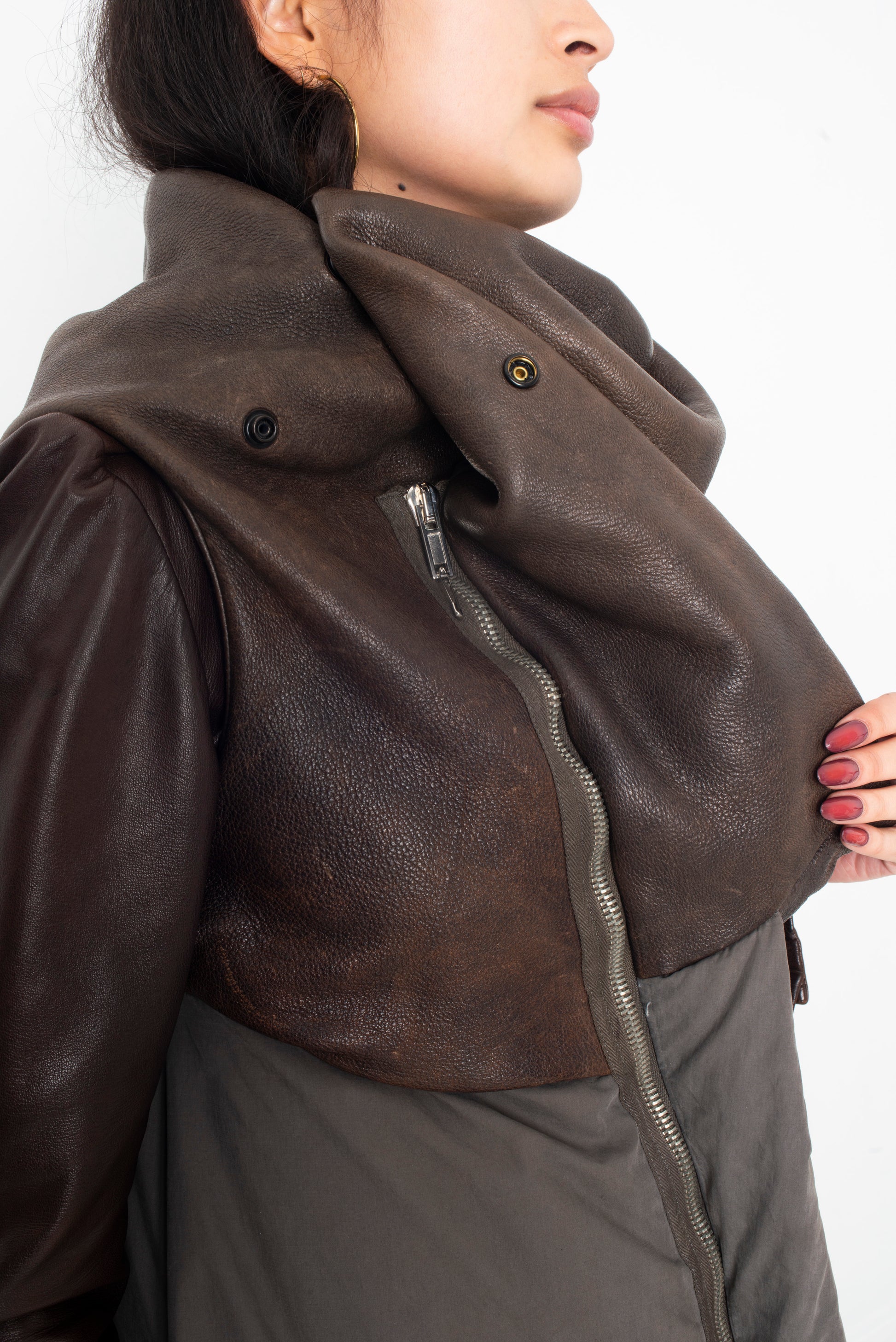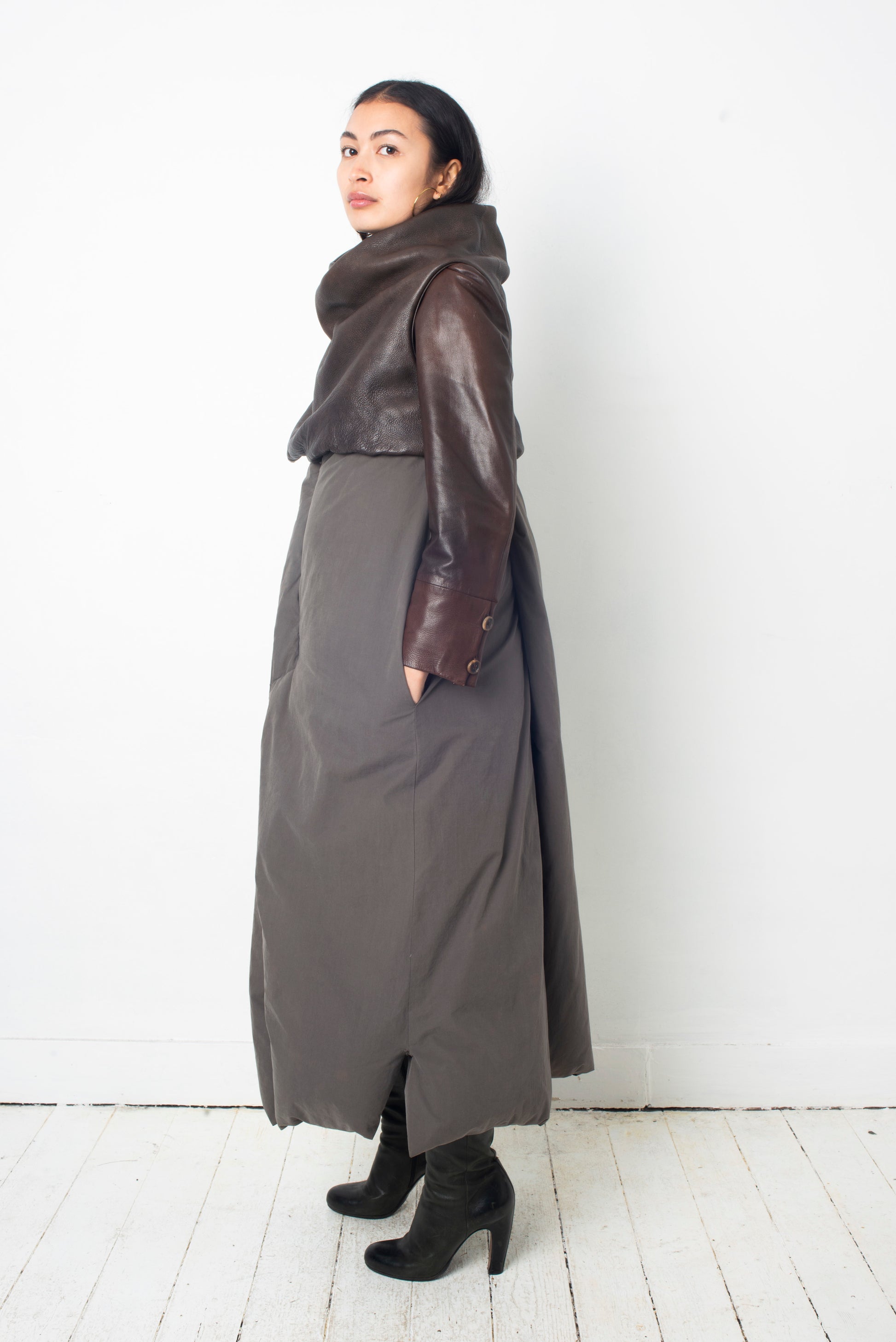 Rick Owens reimagines the puffer coat, this time sleeveless and with a large leather upper body piece / collar, that wraps around you like a blanket but with the toughness of a harness that will protect you, while keeping you warm and cozy.