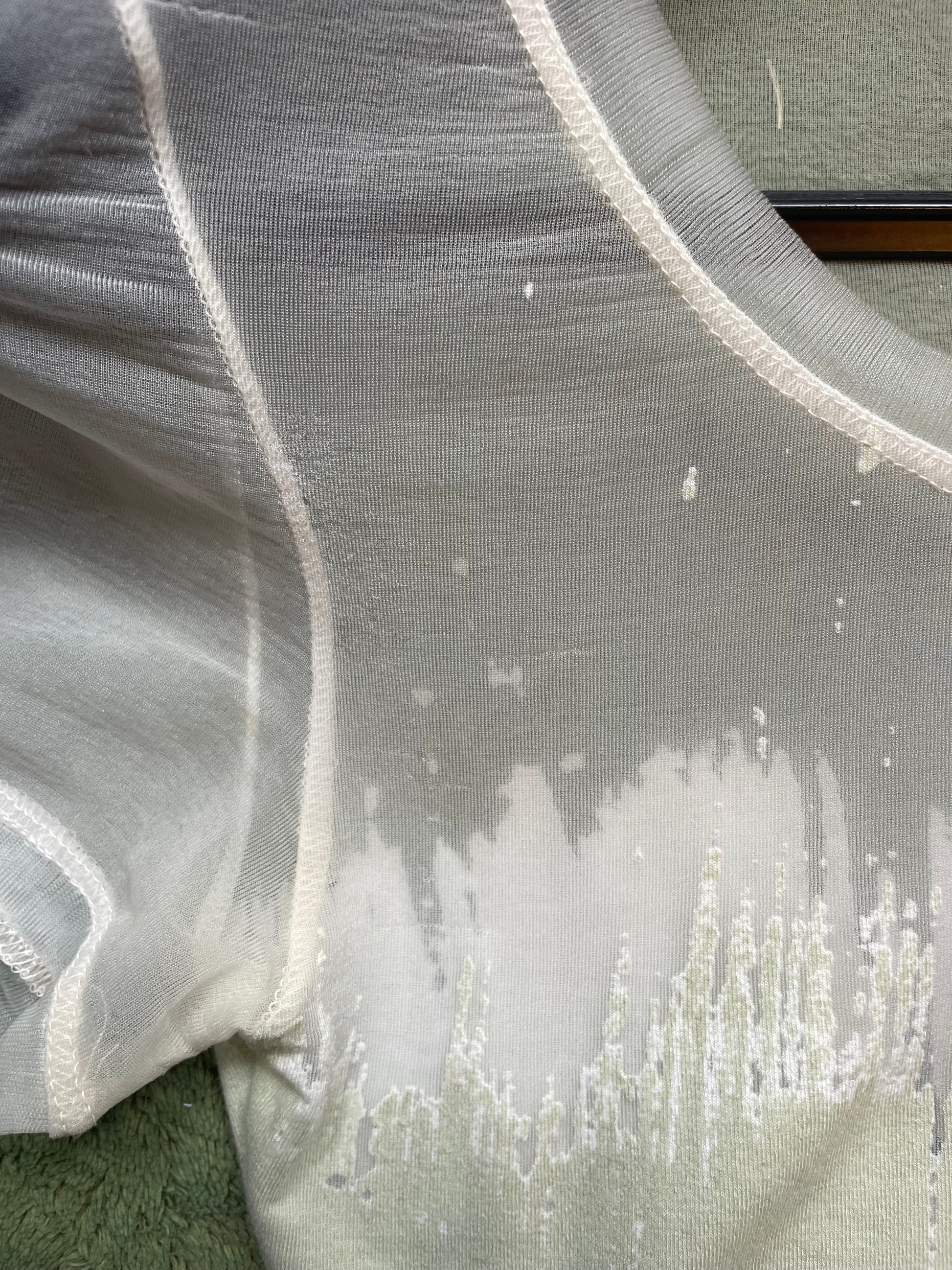 Roberto Cavalli 2000's stretchy mesh top, transparent on the shoulders and sleeves and gradually become opaque in a mint green dripping pattern.
