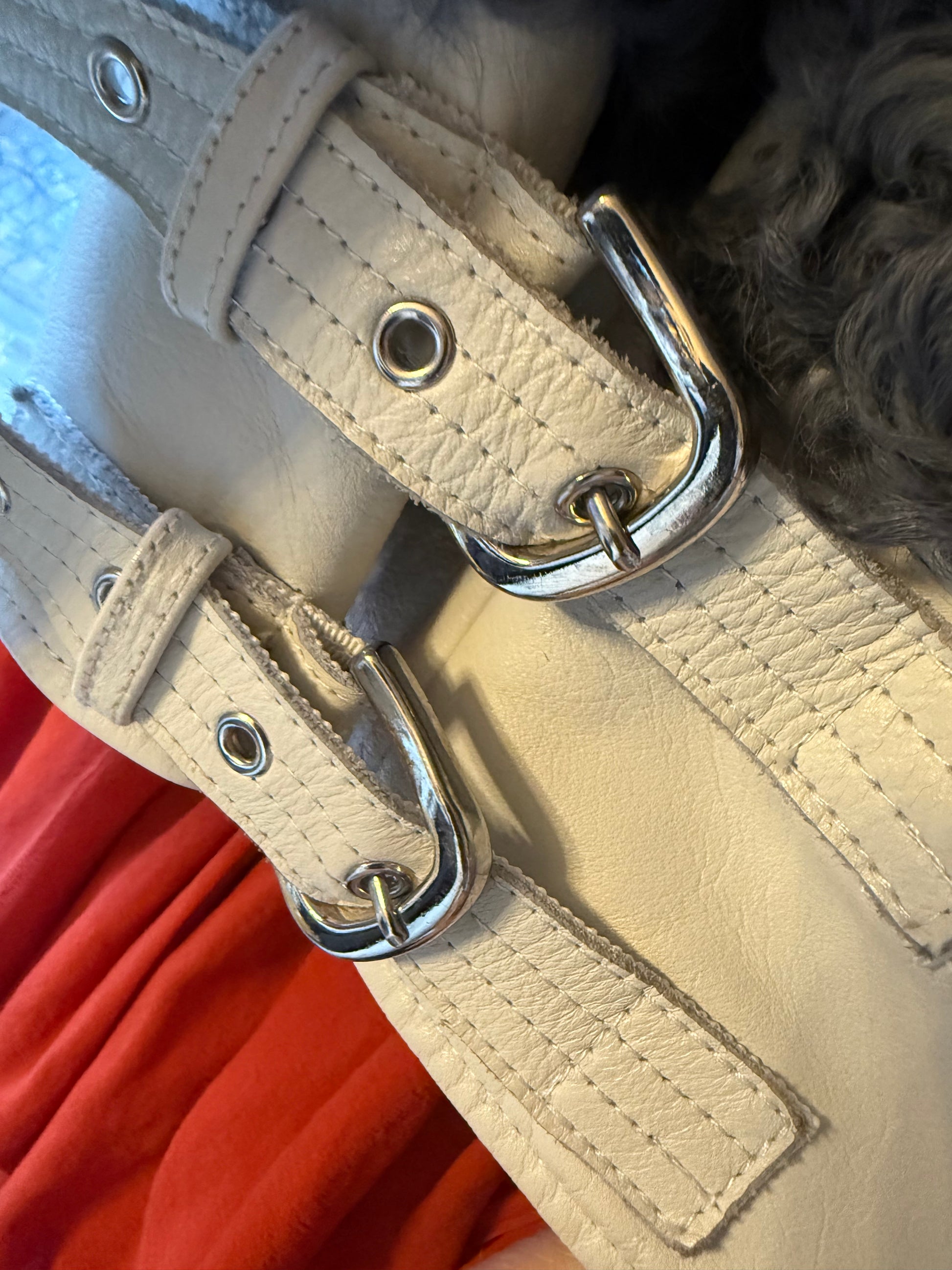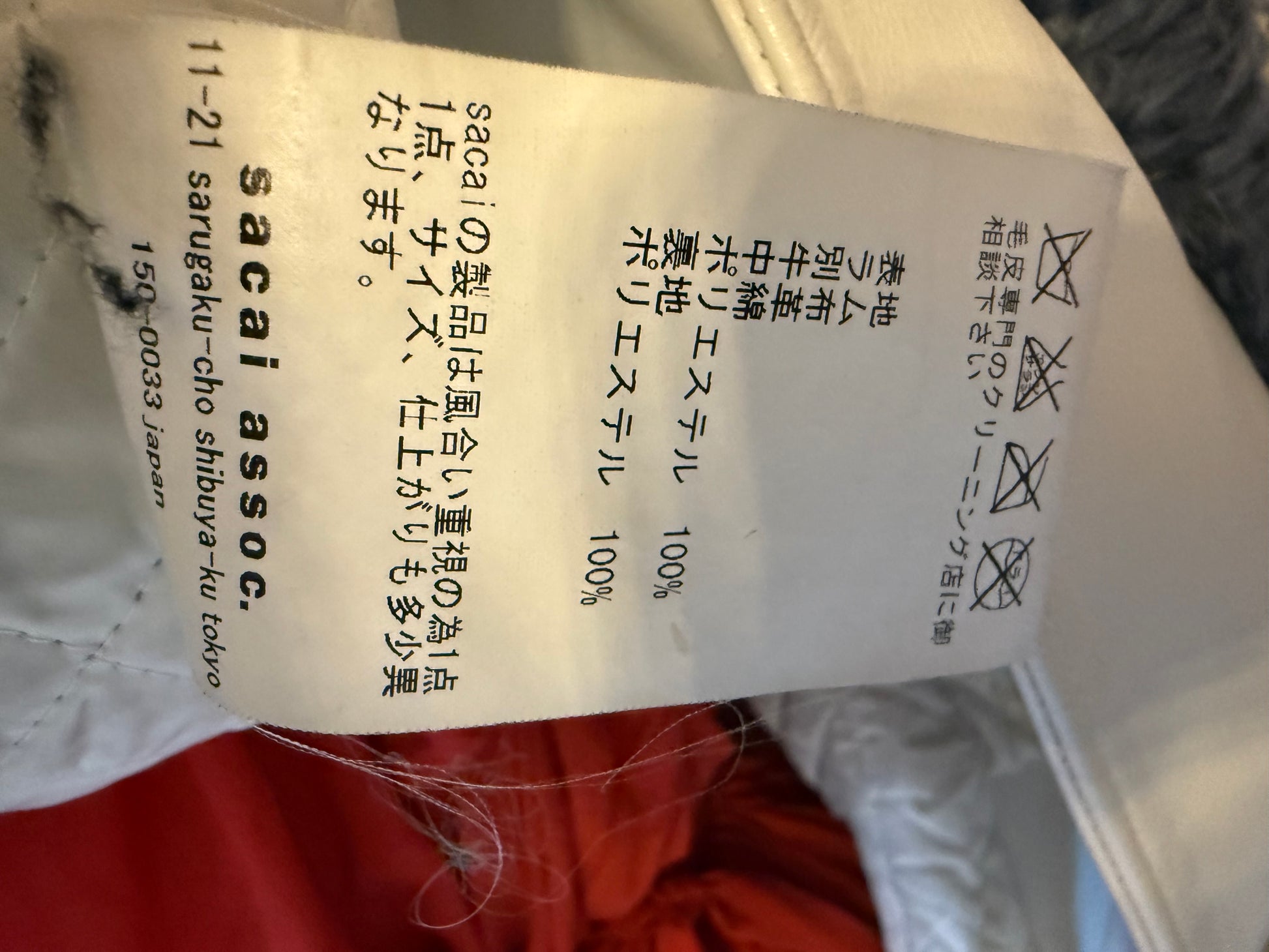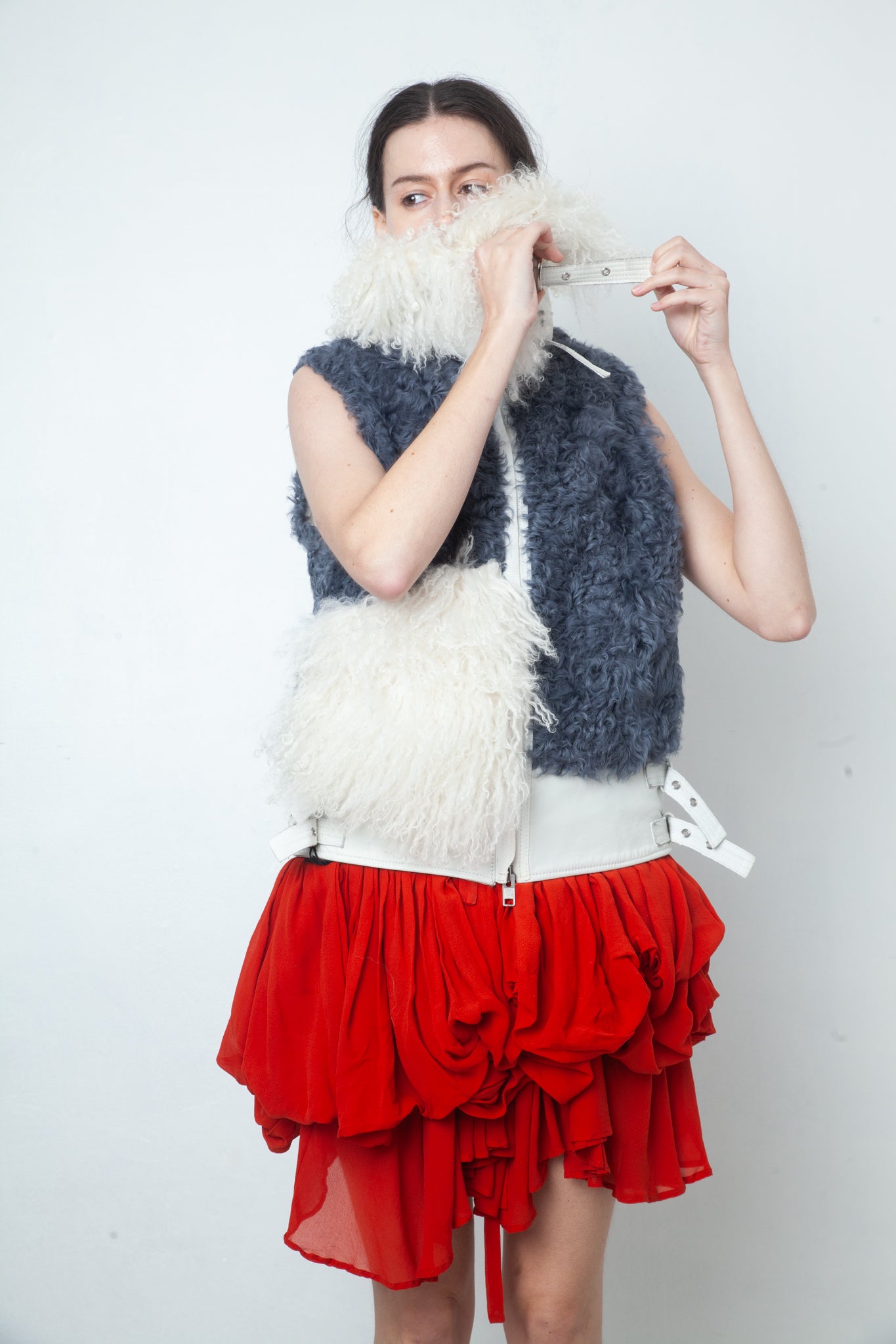 Sacaï Fall 2014 high collar sleeveless Mongolian fur leather vest with belt details. The jacket is composed of white leather and dyed blue and white Mongolian fur. It closes with a zipper and a row of snap buttons. You can close the collar all the way up with a belt. The sides of the jacket also show two additional belts & pockets.