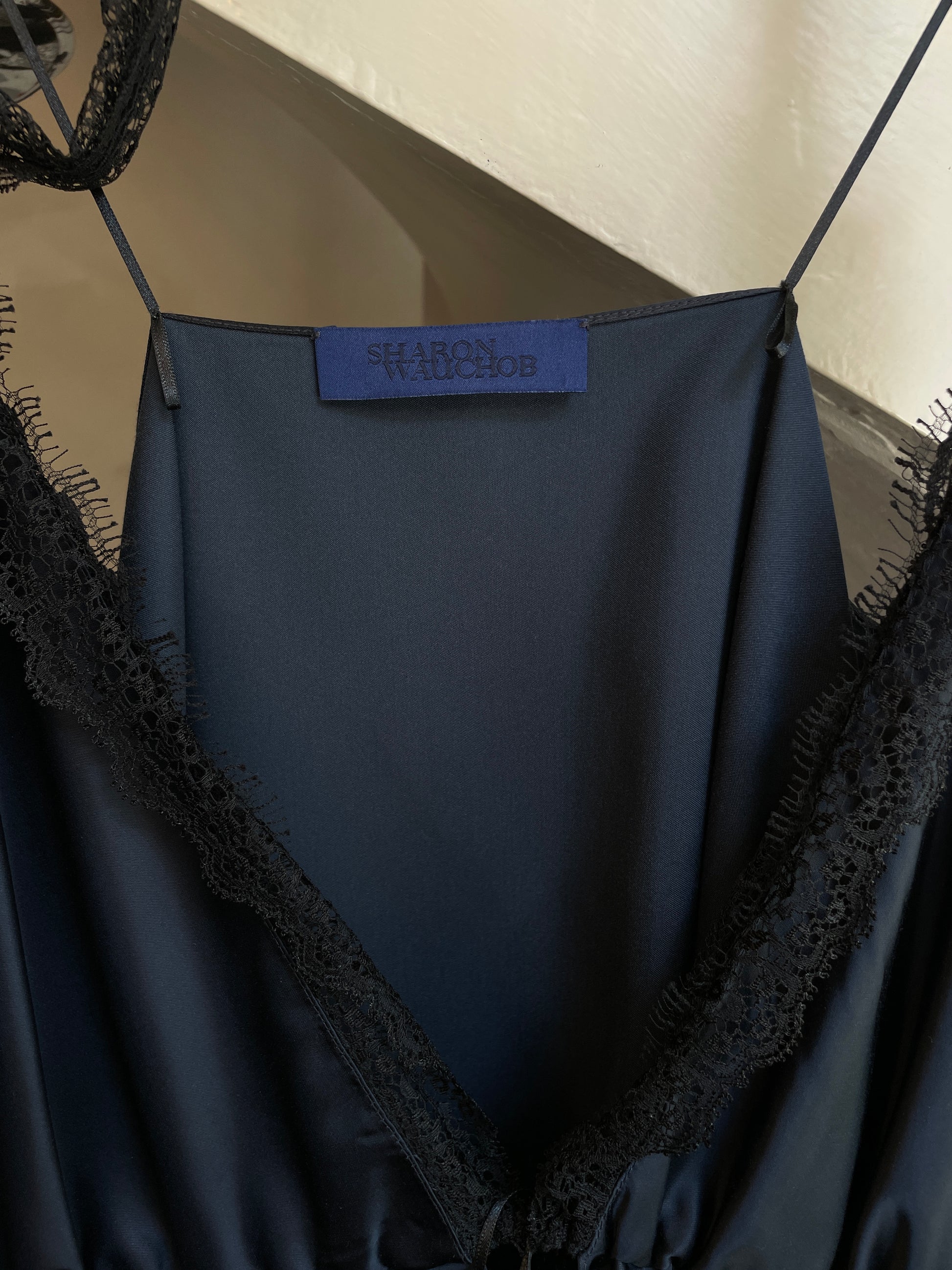Sharon Wauchob 2000's silk midnight blue top with black lace detail
