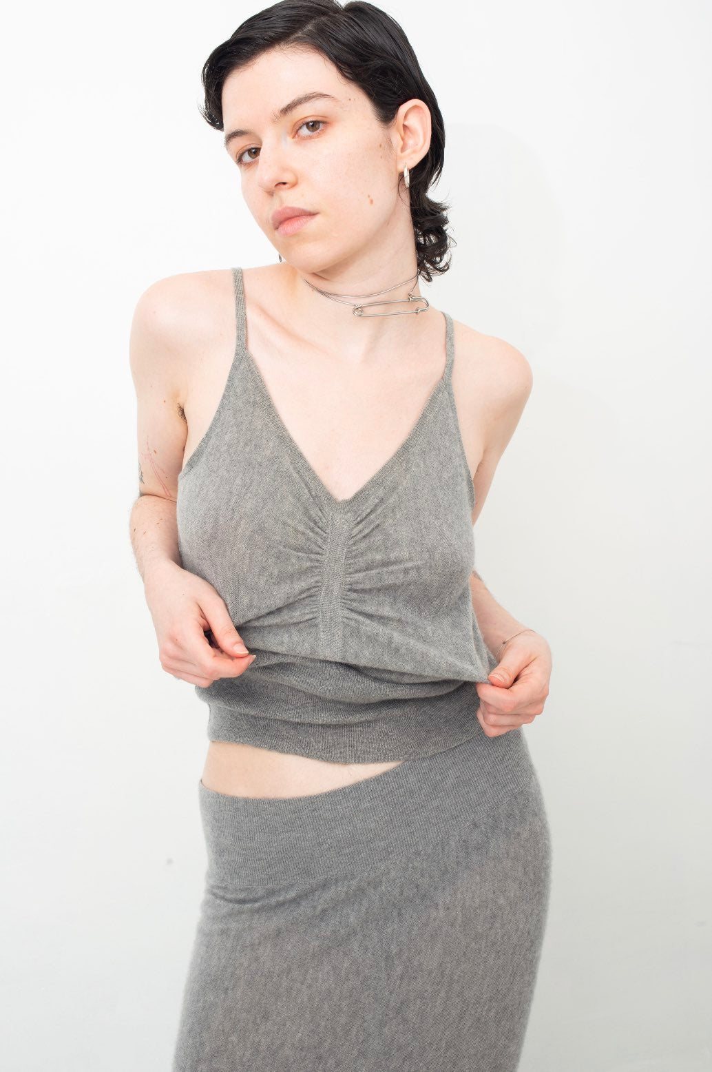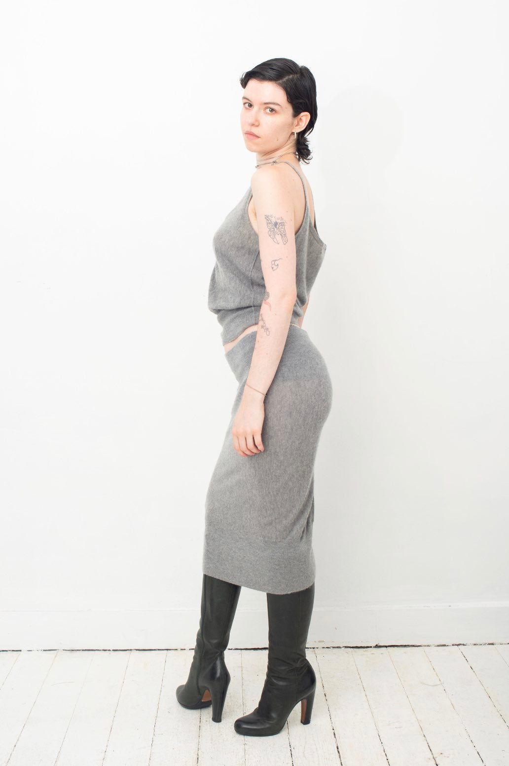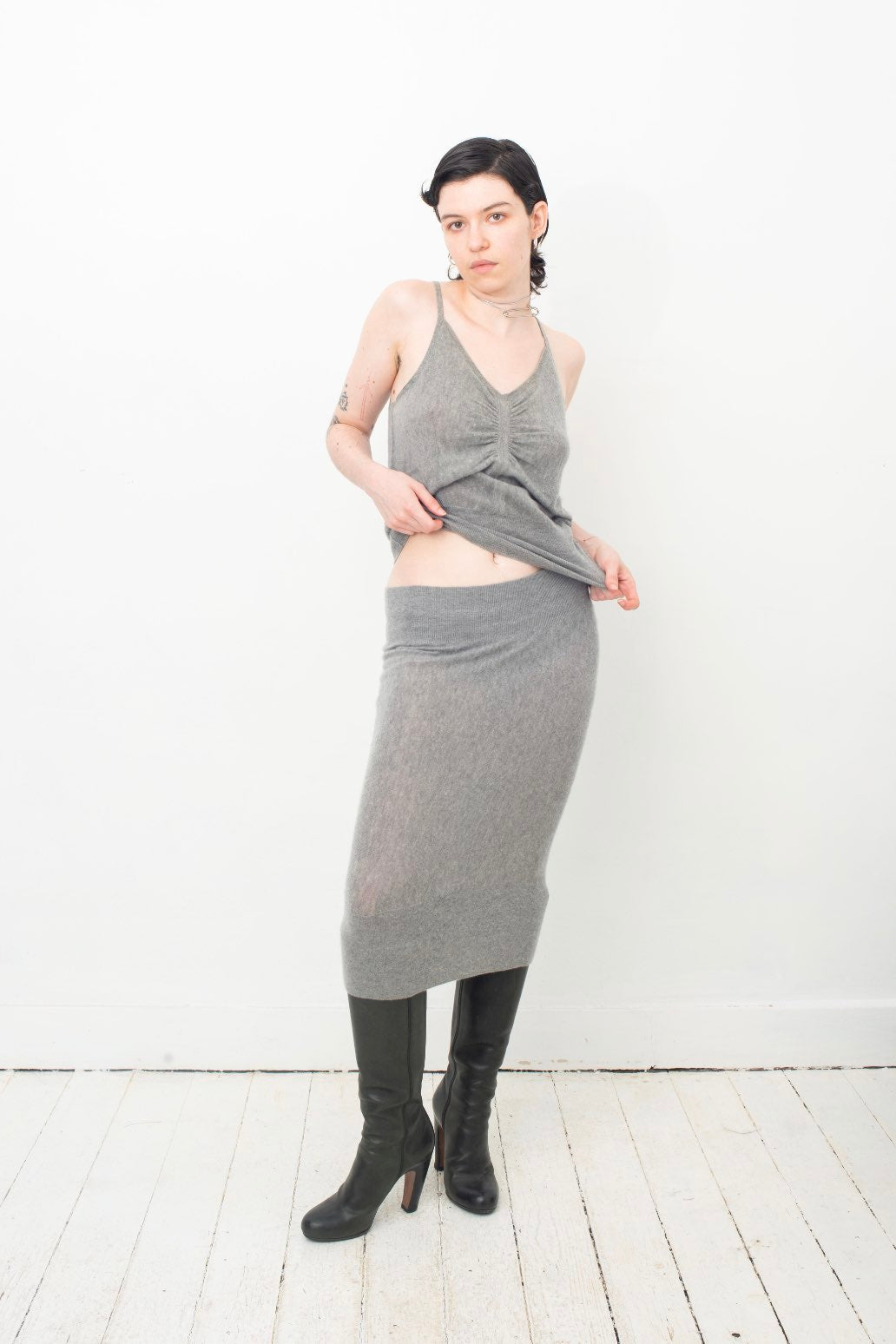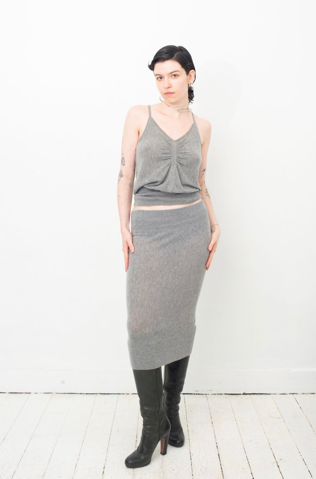 This cute skirt set is a perfect example of a playful garment. Made of 100% cashmere, it's incredibly soft to the skin and comfortable to wear. The top is fitted at the waist and features a line of pleats that marks the chest. The skirt has the same pleats at the back creating a very sensual silhouette.