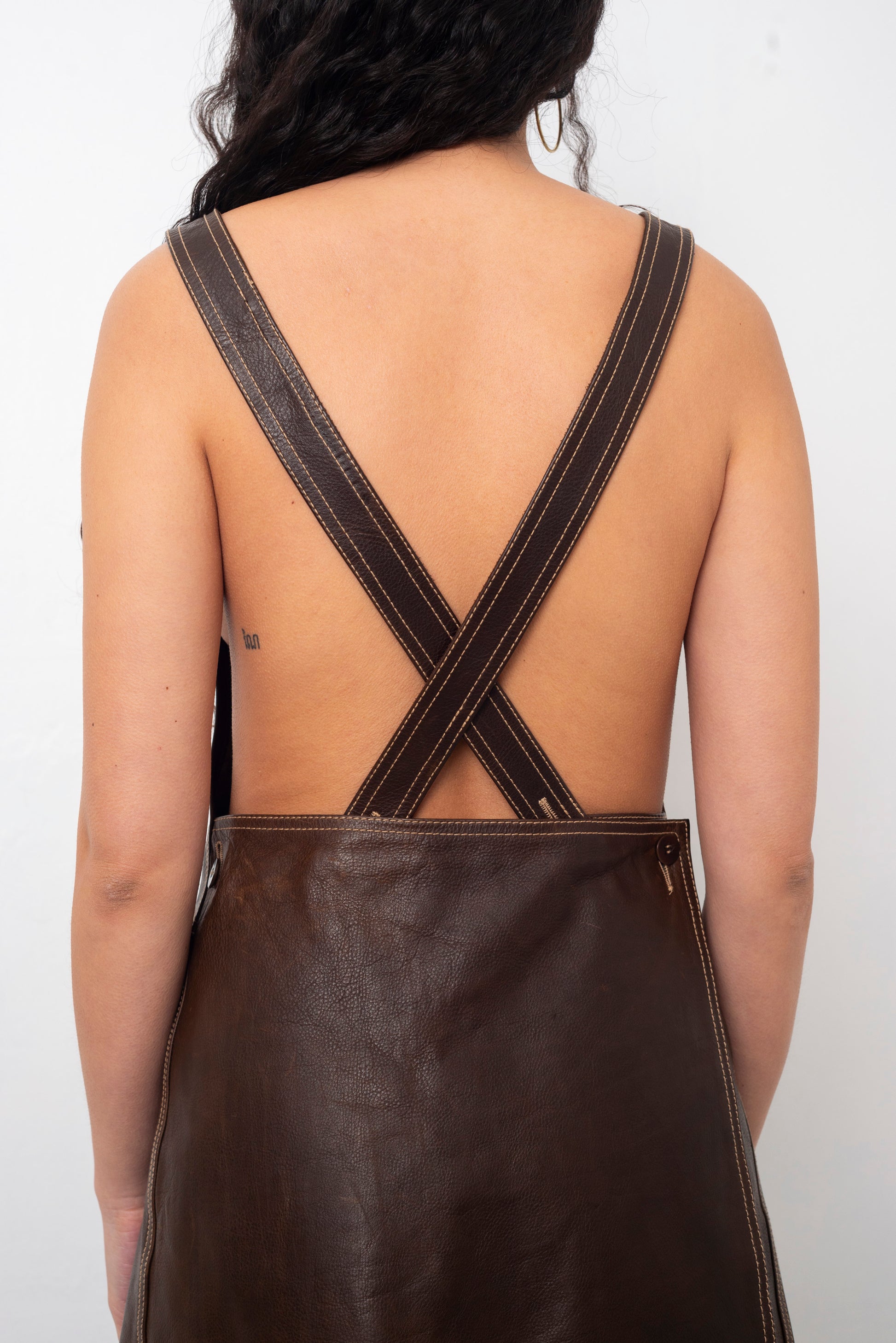 The dress is composed of a wrap skirt that ties in the back with two interior buttons and two leather suspenders that cross in the back and are attached in the interior waist band with two more buttons.