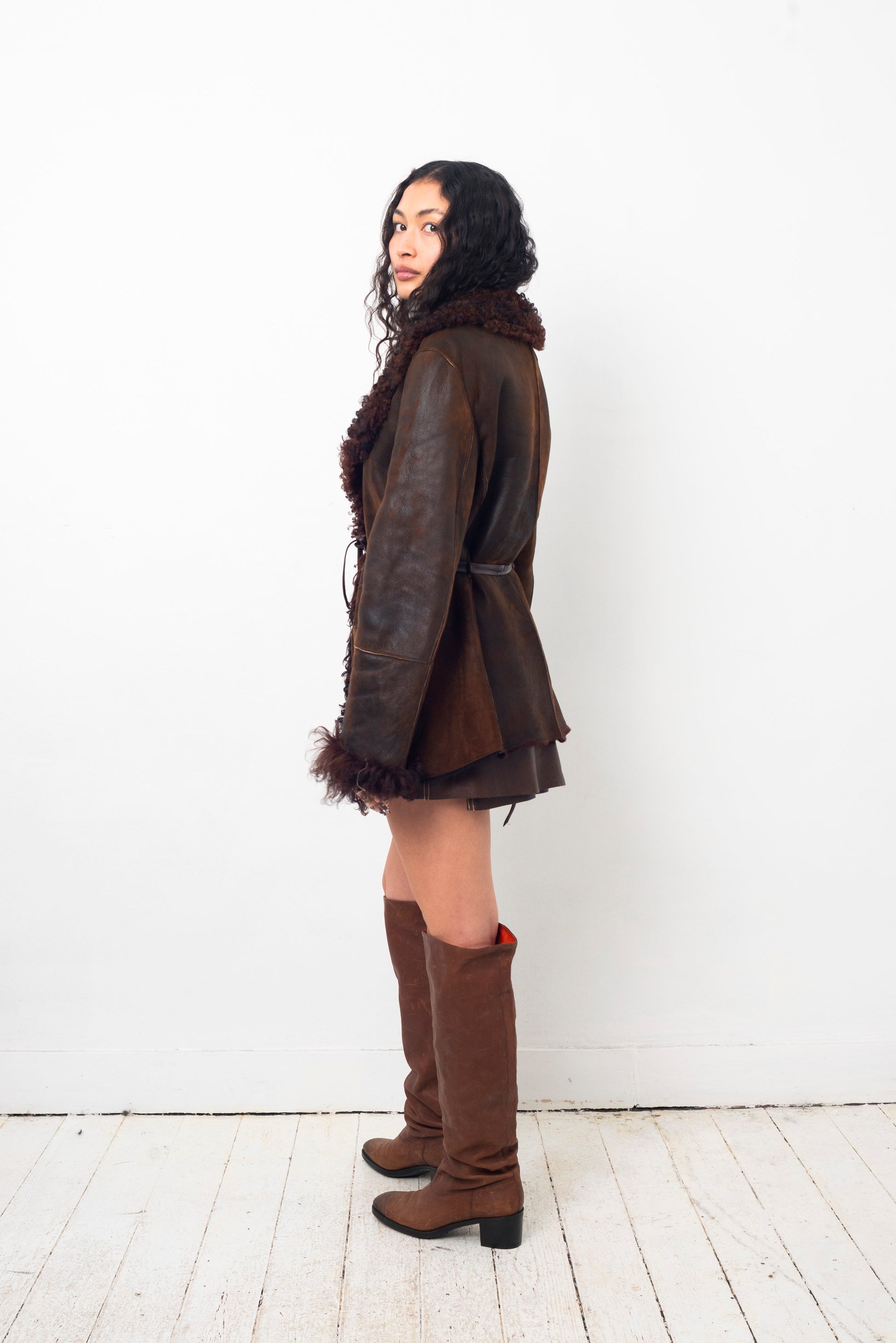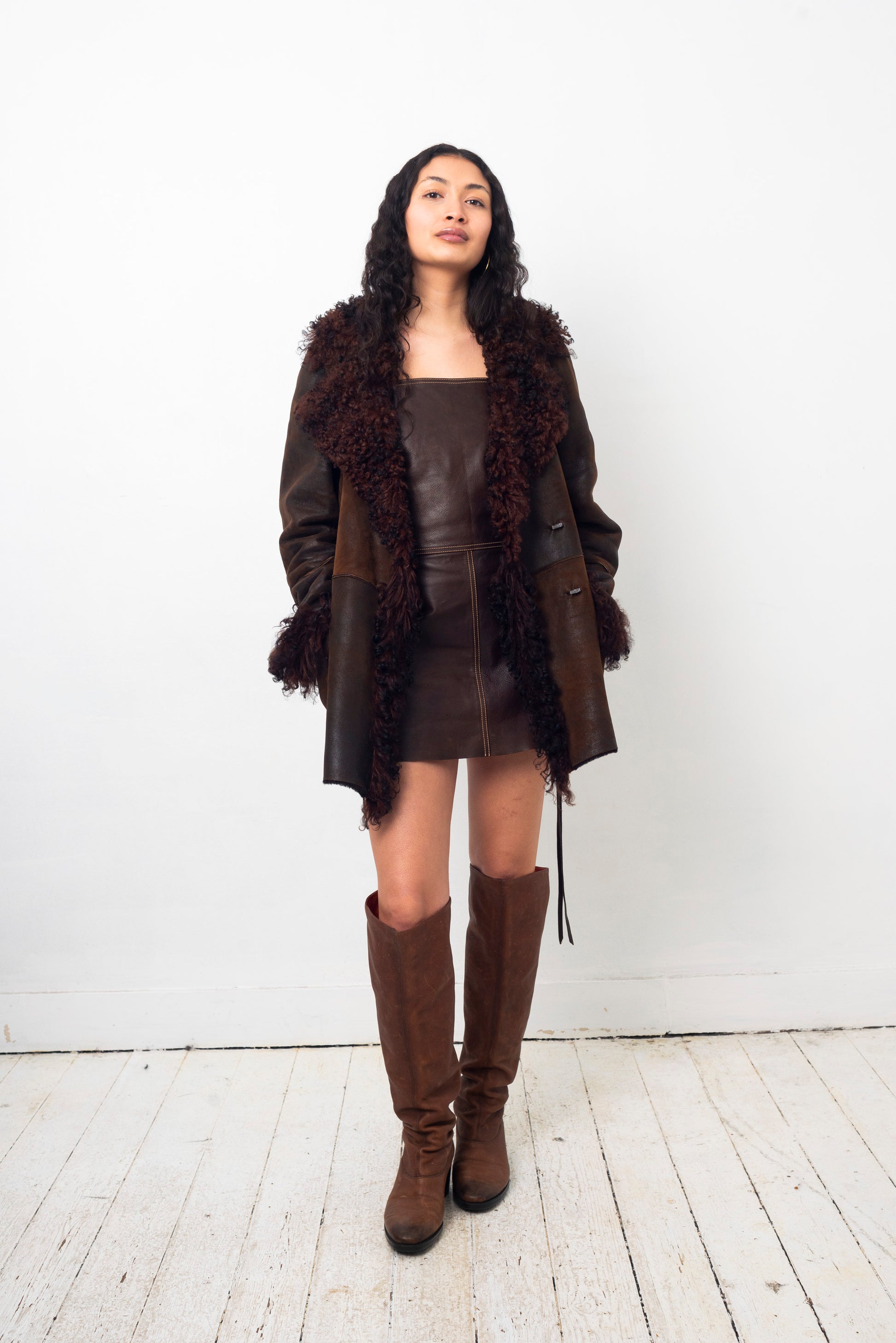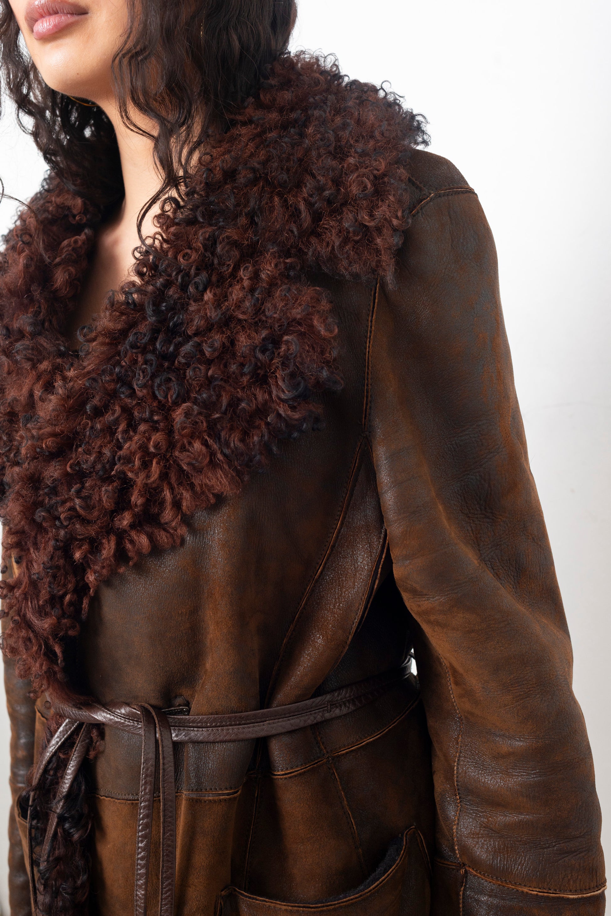 Sylvie Schimmel 90's brown shearling coat with mongolian sheep collar and cuffs