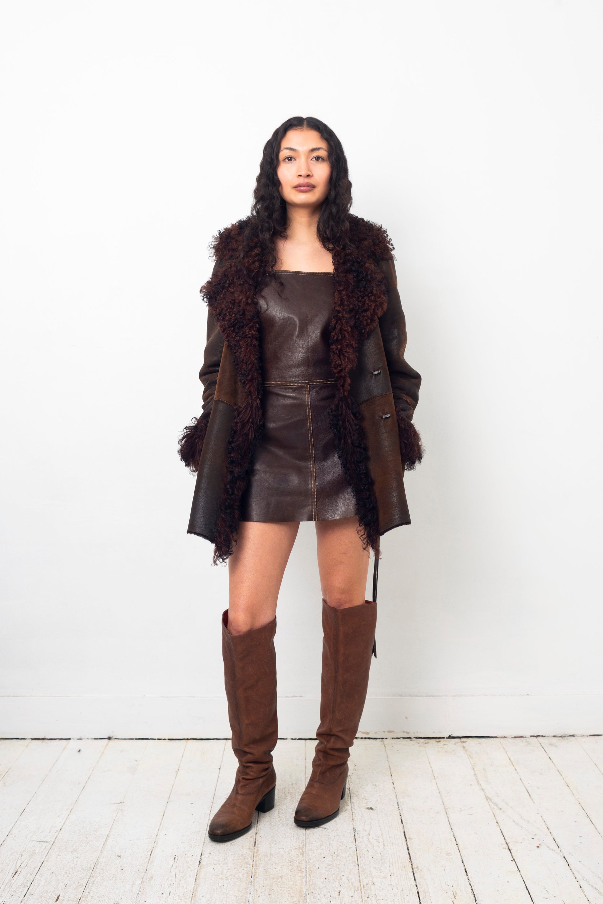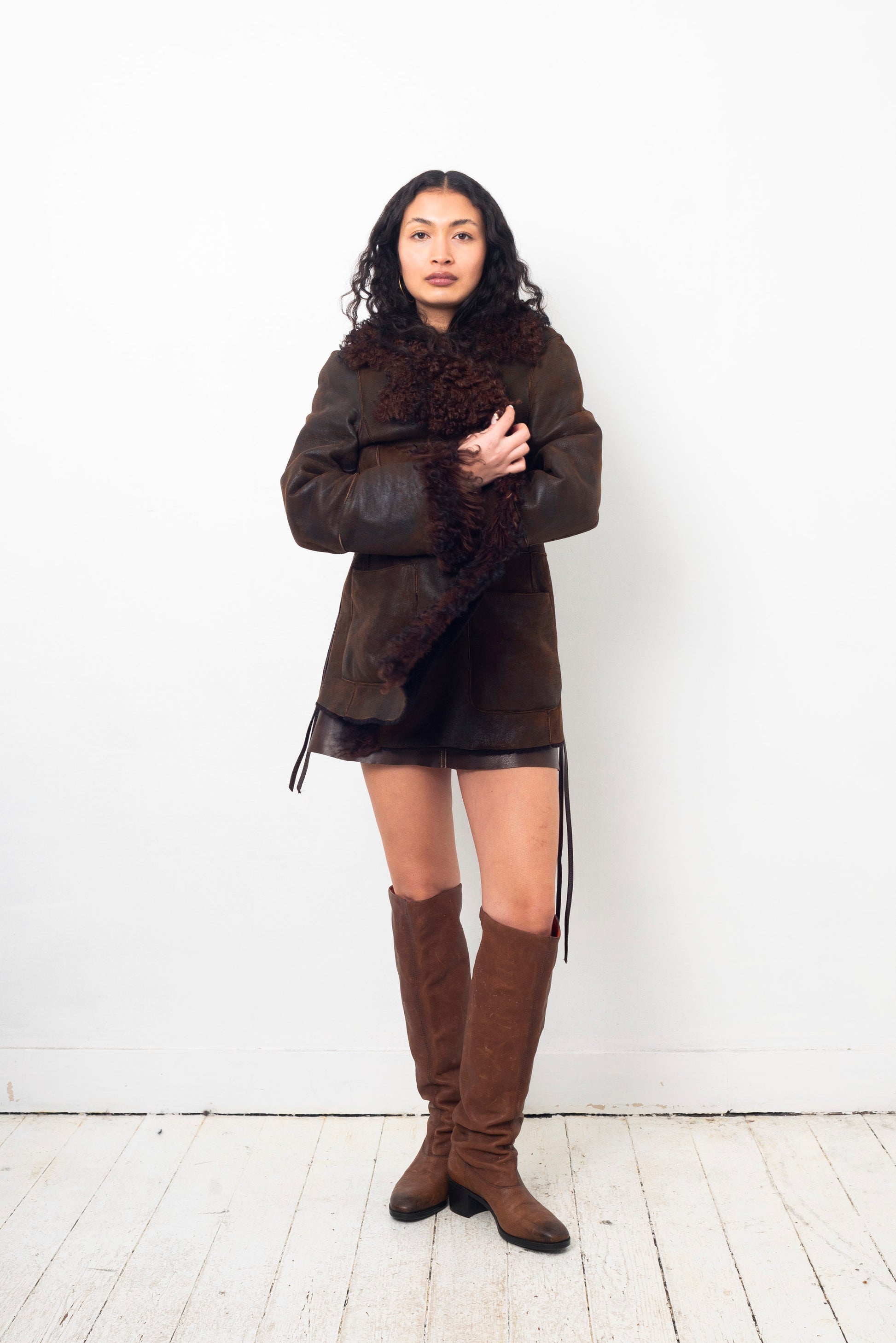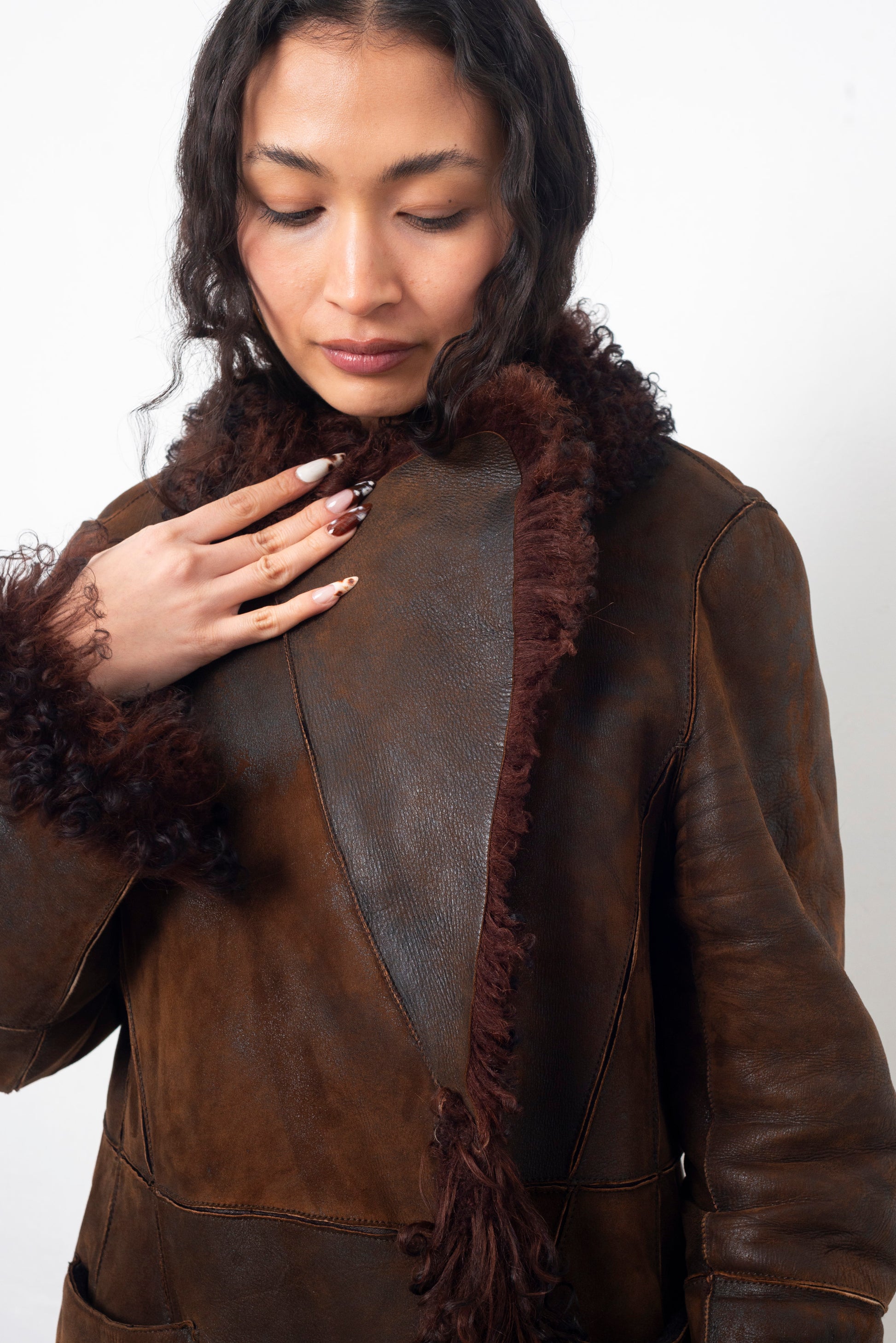 Sylvie Schimmel 90's brown shearling coat with mongolian sheep collar and cuffs